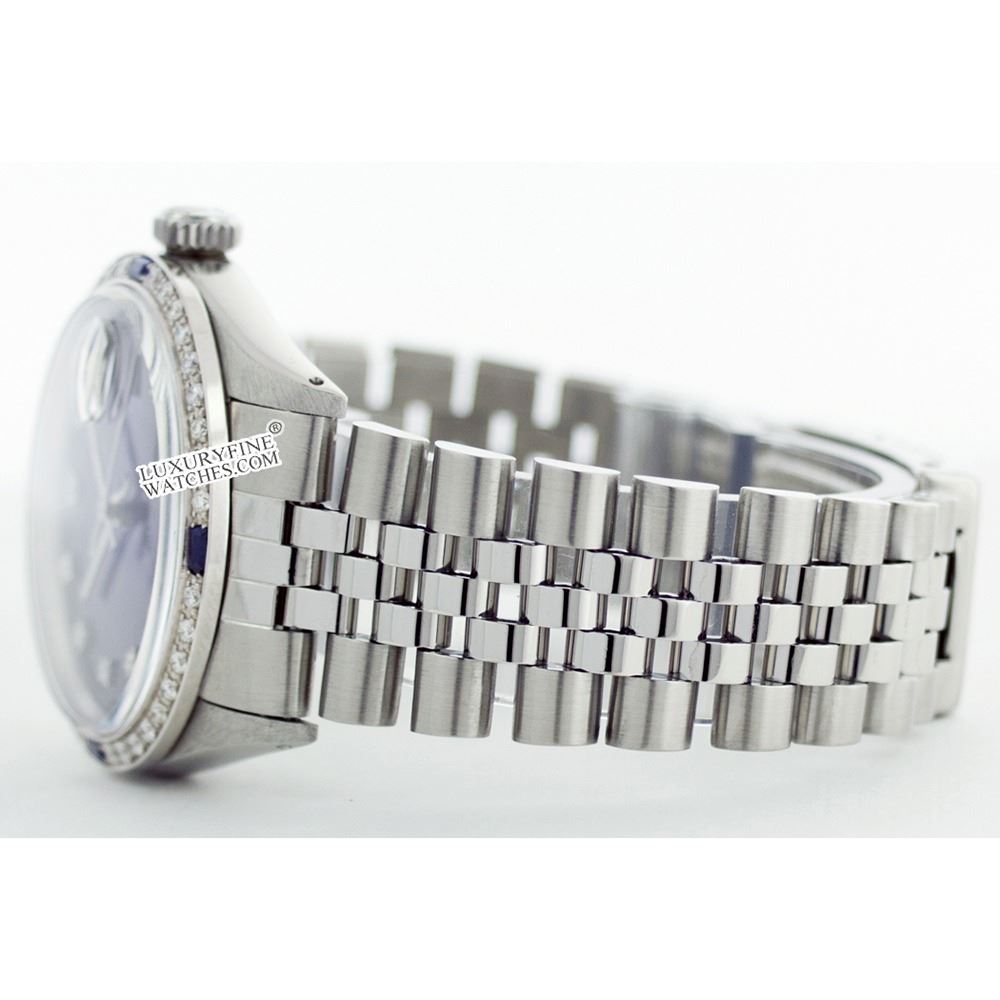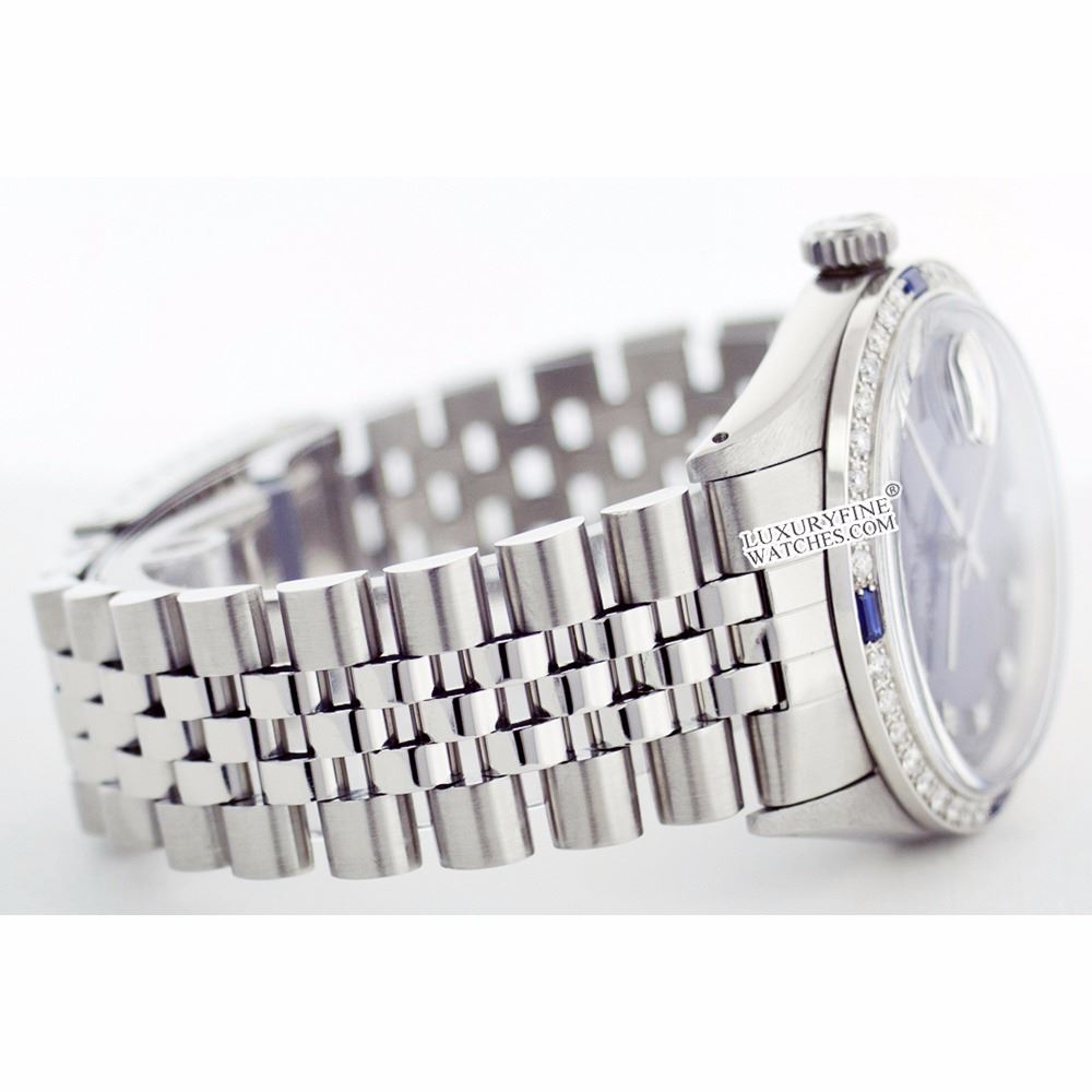WATCH DETAILS: ITEM: WatchBRAND: RolexTYPE: Stainless SteelFEATURE: MODEL: DateJustMADE: Swiss MadeGENDER: LadiesCONDITION: Pre-OwnedFUNCTION: DateDIAL COLOR: BlueHOUR MARKERS: 10 Round DiamondBEZEL TYPE: Diamond & Sapphire BezelBEZEL STONE: Diamond 1 CTW G-VVS1 & Ceylon Blue SapphireBEZEL MATERIAL: 18K GoldBRACELET TYPE: Jubilee BRACELET MATERIAL: Stainless SteelCLASP TYPE: Folding ClaspCLASP MATERIAL: Stainless SteelCASE STONE: CASE SIZE: 36mmCRYSTAL: Scratch Resistance Sapphire CrystalMOVEMENT: Automatic (Self Winding)CALIBER: 2035CROWN TYPE: Screw Down CrownWATER RESISTANCE: Waterproof to 10 ATM/100 meters/330 feetMODEL #: 6917SKU #: ALSJNS39We Buy/Sell/Trade Valuable watches, Please call usNote: Presentational generic box included. This watch was professionally inspected and serviced prior to auction. We are not affiliated with Rolex USA, Inc.