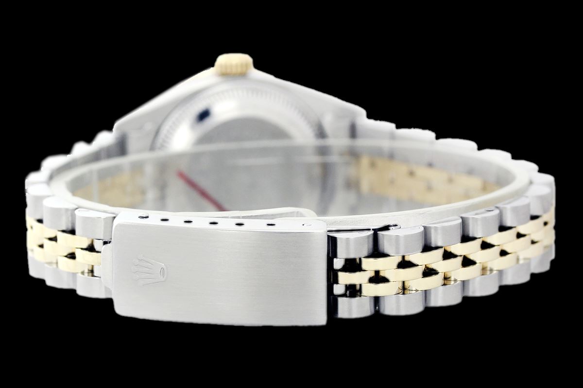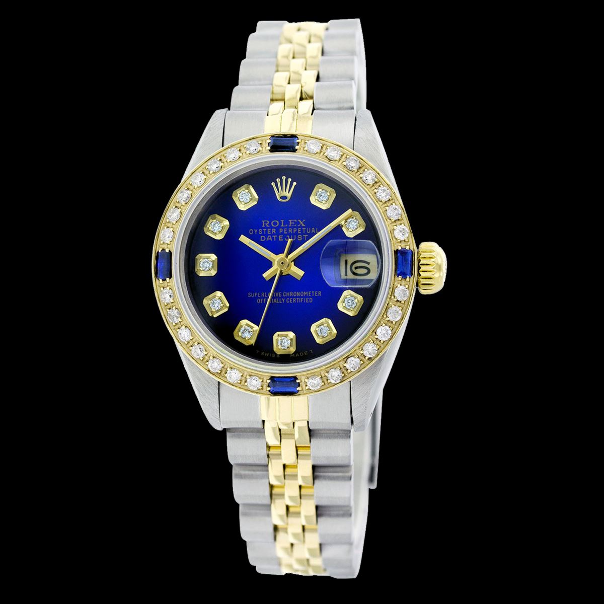 WATCH DETAILS: ITEM: WatchBRAND: RolexTYPE: Stainless SteelFEATURE: MODEL: DateJustMADE: Swiss MadeGENDER: LadiesCONDITION: Pre-OwnedFUNCTION: DateDIAL COLOR: Blue Vignette HOUR MARKERS: 10 Round Custom Made DiamondBEZEL TYPE: Custom Made Diamond & Sapphire BezelBEZEL STONE: Diamond 1 CTW G-VVS1 & Ceylon Blue SapphireBEZEL MATERIAL: 18K GoldBRACELET TYPE: Jubilee BRACELET MATERIAL: Stainless SteelCLASP TYPE: Folding ClaspCLASP MATERIAL: Stainless SteelCASE STONE: CASE SIZE: 26mmCRYSTAL: Scratch Resistance Sapphire CrystalMOVEMENT: Automatic (Self Winding)CALIBER: 2030CROWN TYPE: Screw Down CrownWATER RESISTANCE: Waterproof to 10 ATM/100 meters/330 feetMODEL #: 6917SKU #: ALSJNS87We Buy/Sell/Trade Valuable watches, Please call us