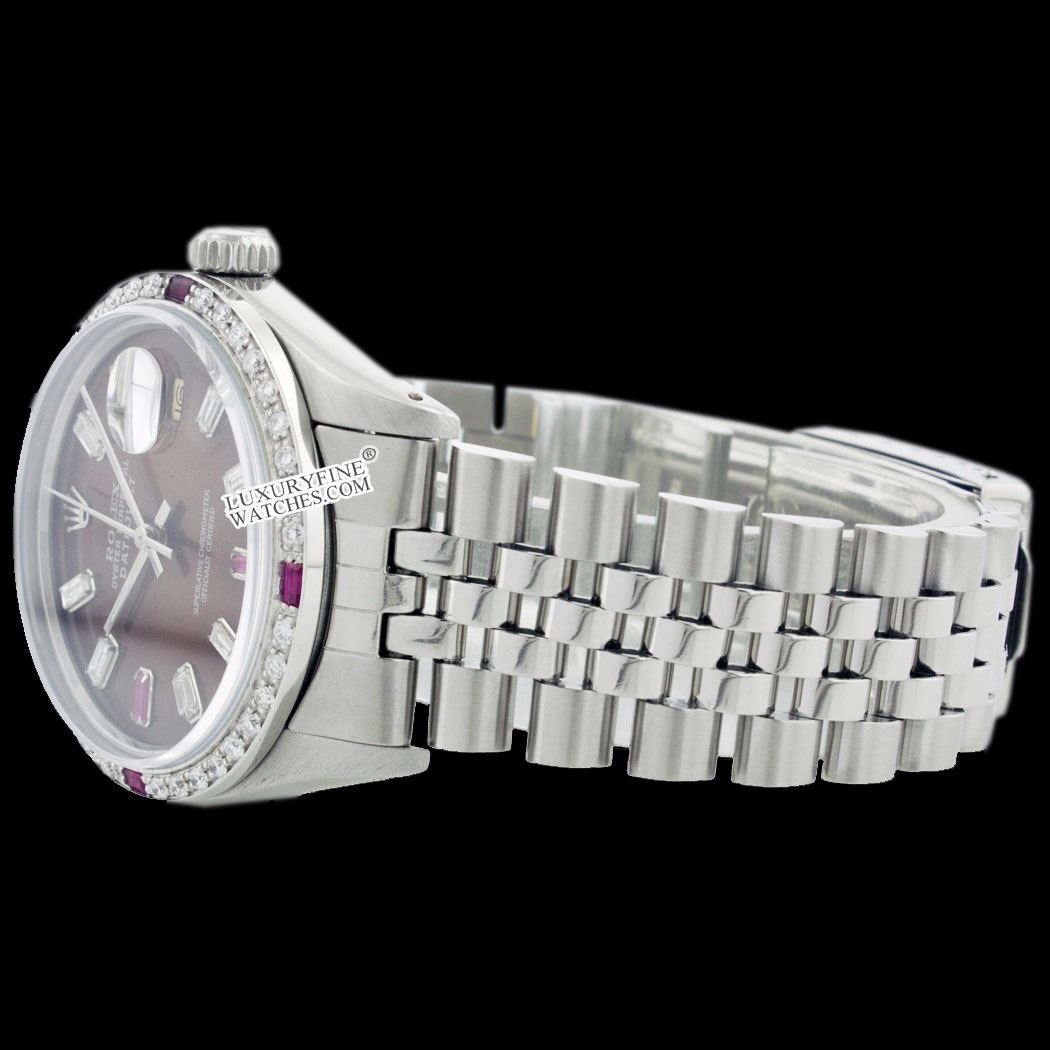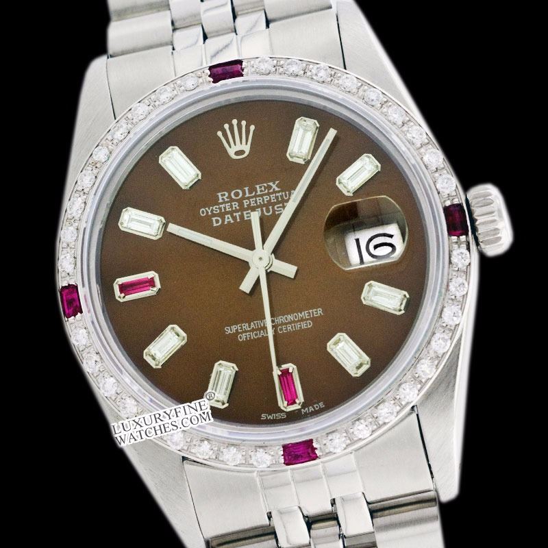 WATCH DETAILS: ITEM: WatchBRAND: RolexTYPE: Stainless SteelFEATURE: MODEL: DateJustMADE: Swiss MadeGENDER: LadiesCONDITION: Pre-OwnedFUNCTION: DateDIAL COLOR: ChocolateHOUR MARKERS: 8 + 2 , 8 Round Diamond & 2 Baguette RubyBEZEL TYPE: Diamond & Ruby BezelBEZEL STONE: Diamond 1 CTW G-VVS1 & 4 Burmise RubyBEZEL MATERIAL: 18K GoldBRACELET TYPE: Jubilee BRACELET MATERIAL: Stainless SteelCLASP TYPE: Folding ClaspCLASP MATERIAL: Stainless SteelCASE STONE: CASE SIZE: 36mmCRYSTAL: Scratch Resistance Sapphire CrystalMOVEMENT: Automatic (Self Winding)CALIBER: 2035CROWN TYPE: Screw Down CrownWATER RESISTANCE: Waterproof to 10 ATM/100 meters/330 feetMODEL #: 6917SKU #: ALSJNS25We Buy/Sell/Trade Valuable watches, Please call usNote: Presentational generic box included. This watch was professionally inspected and serviced prior to auction. We are not affiliated with Rolex USA, Inc.