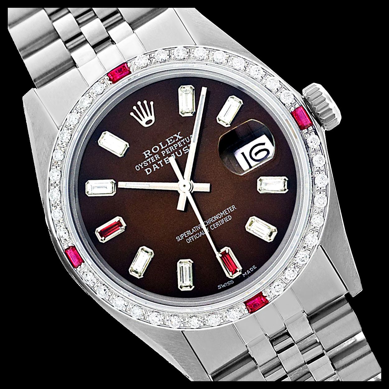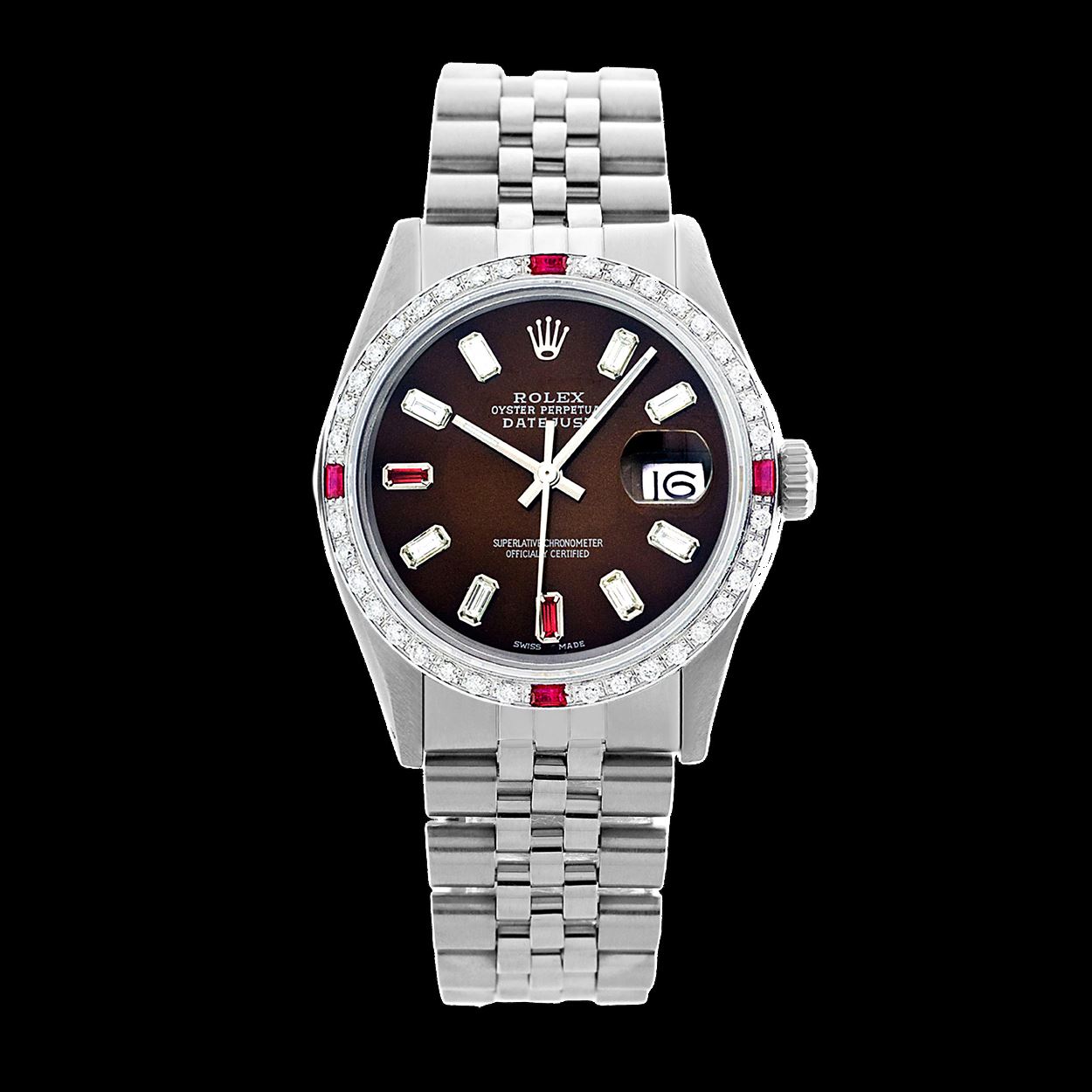 WATCH DETAILS: ITEM: WatchBRAND: RolexTYPE: Stainless SteelFEATURE: MODEL: DateJustMADE: Swiss MadeGENDER: LadiesCONDITION: Pre-OwnedFUNCTION: DateDIAL COLOR: ChocolateHOUR MARKERS: 8 + 2 , 8 Round Custom Made Diamond & 2 Baguette RubyBEZEL TYPE: Custom Made Diamond & Ruby BezelBEZEL STONE: Diamond 1 CTW G-VVS1 & 4 Burmise RubyBEZEL MATERIAL: 18K GoldBRACELET TYPE: Jubilee BRACELET MATERIAL: Stainless SteelCLASP TYPE: Folding ClaspCLASP MATERIAL: Stainless SteelCASE STONE: CASE SIZE: 26mmCRYSTAL: Scratch Resistance Sapphire CrystalMOVEMENT: Automatic (Self Winding)CALIBER: 2030CROWN TYPE: Screw Down CrownWATER RESISTANCE: Waterproof to 10 ATM/100 meters/330 feetMODEL #: 6917SKU #: ALSJNS25We Buy/Sell/Trade Valuable watches, Please call us