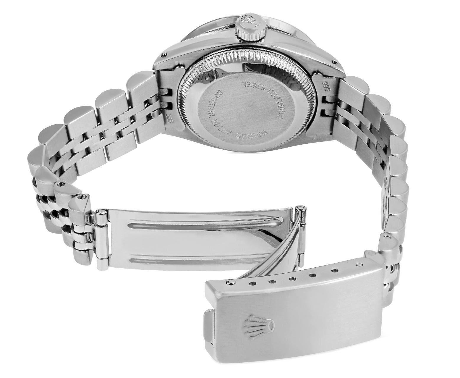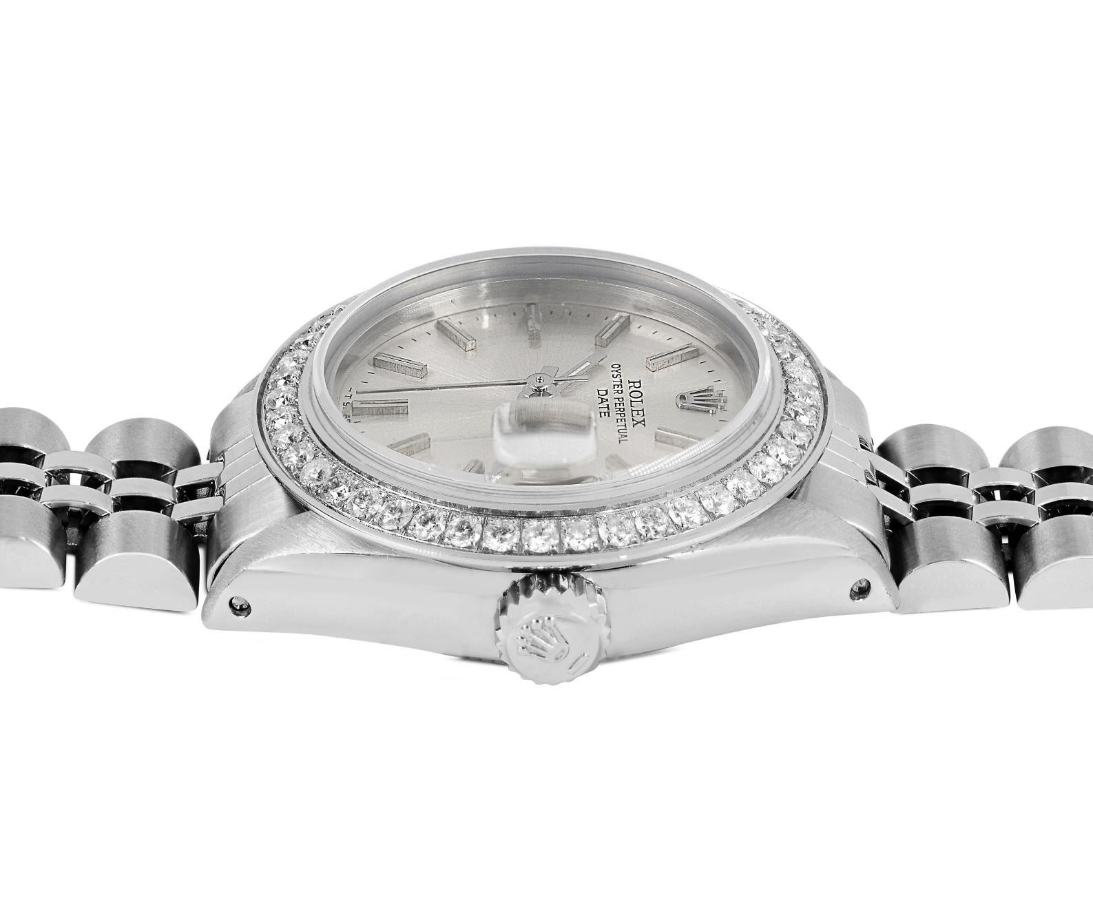 This Lady Rolex Date watch features a silver dial with index hour markers and a custom sapphire crystal, with a magnified date window. The timepiece has a custom stainless diamond bezel, set with genuine round diamonds (Please note that this diamond bezel is an aftermarket modification and was not manufactured by Rolex). The Rolex 26mm case is crafted from stainless steel and includes a Rolex screw-down crown. The bracelet is a Rolex stainless steel Jubilee band, designed to fit wrists up to 6 inches in circumference. The Watch Is Powered by the Rolex automatic self-winding Caliber 2035 movement. This watch has been polished and serviced and is in excellent condition. It will also be time tested before shipment.