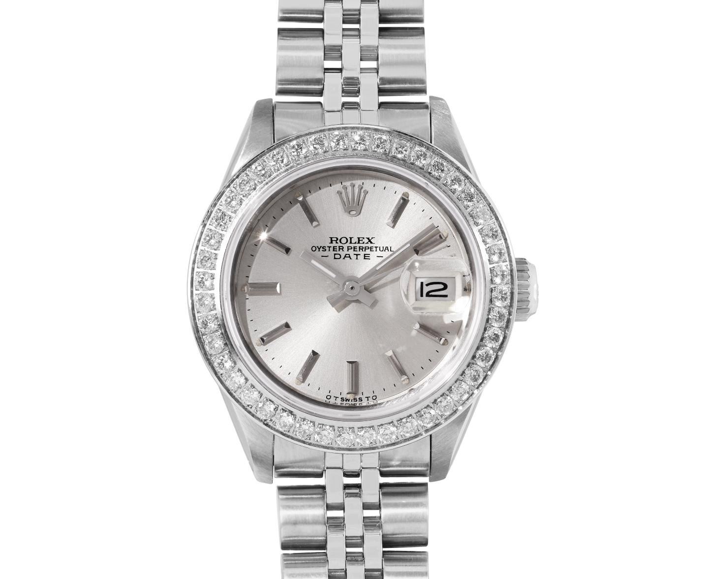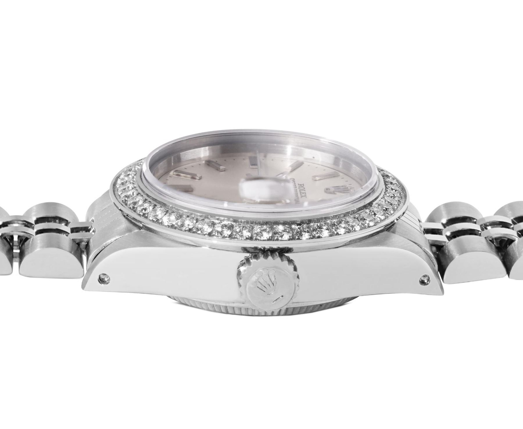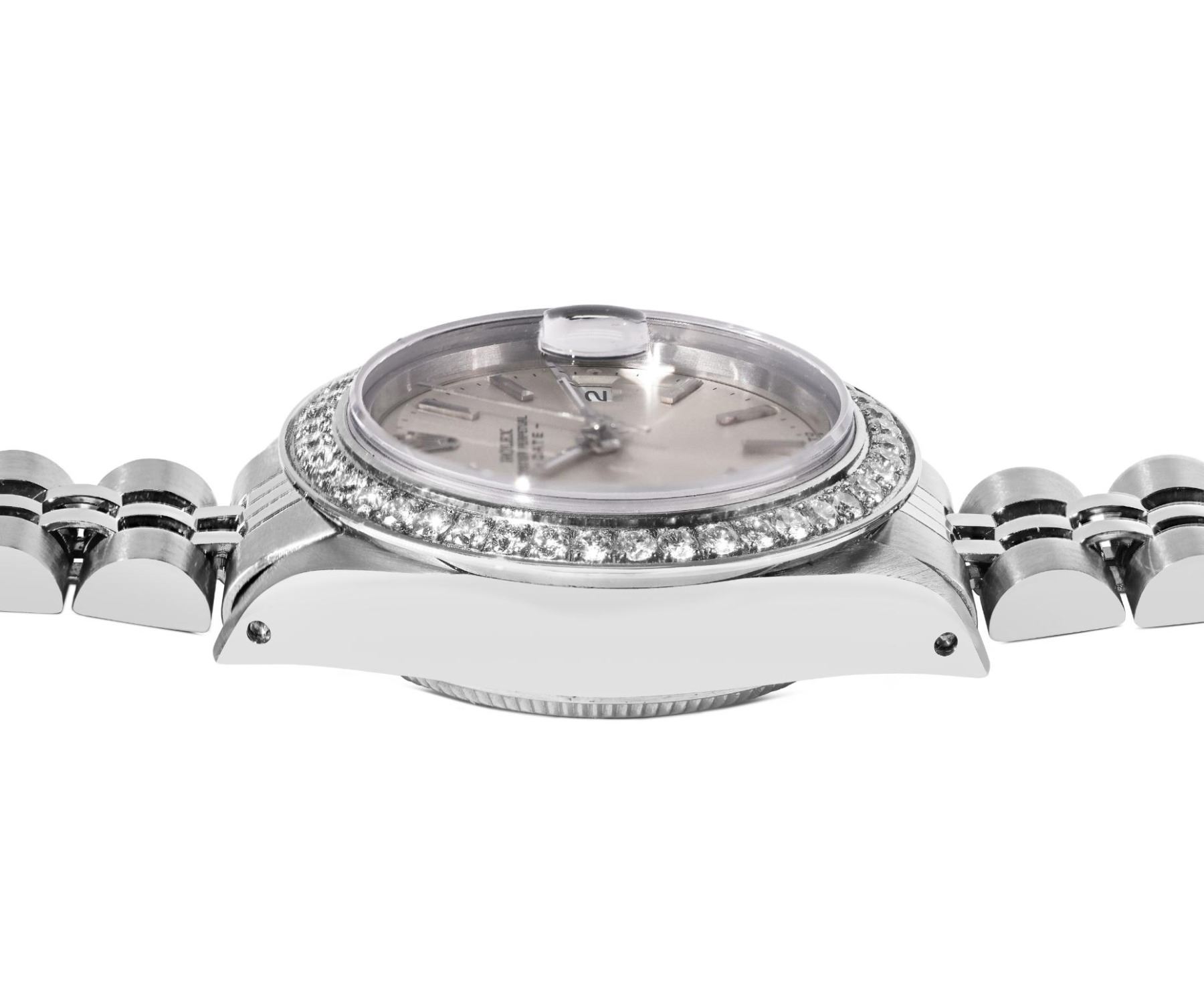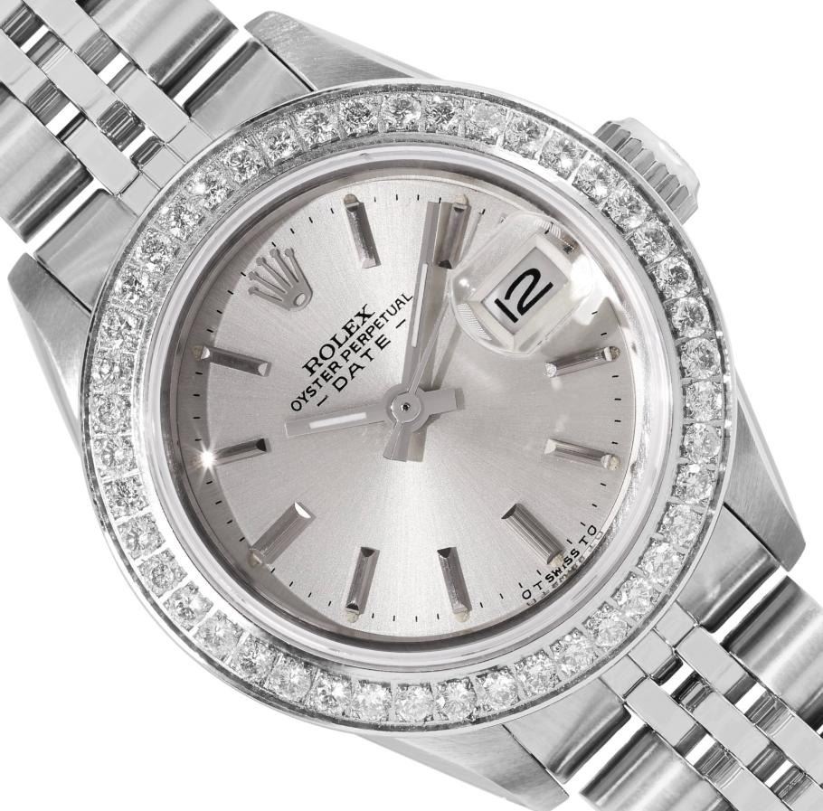 This Lady Rolex Date watch features a silver dial with index hour markers and a custom sapphire crystal, with a magnified date window. The timepiece has a custom stainless diamond bezel, set with genuine round diamonds (Please note that this diamond bezel is an aftermarket modification and was not manufactured by Rolex). The Rolex 26mm case is crafted from stainless steel and includes a Rolex screw-down crown. The bracelet is a Rolex stainless steel Jubilee band, designed to fit wrists up to 6 inches in circumference. The Watch Is Powered by the Rolex automatic self-winding Caliber 2035 movement. This watch has been polished and serviced and is in excellent condition. It will also be time tested before shipment.