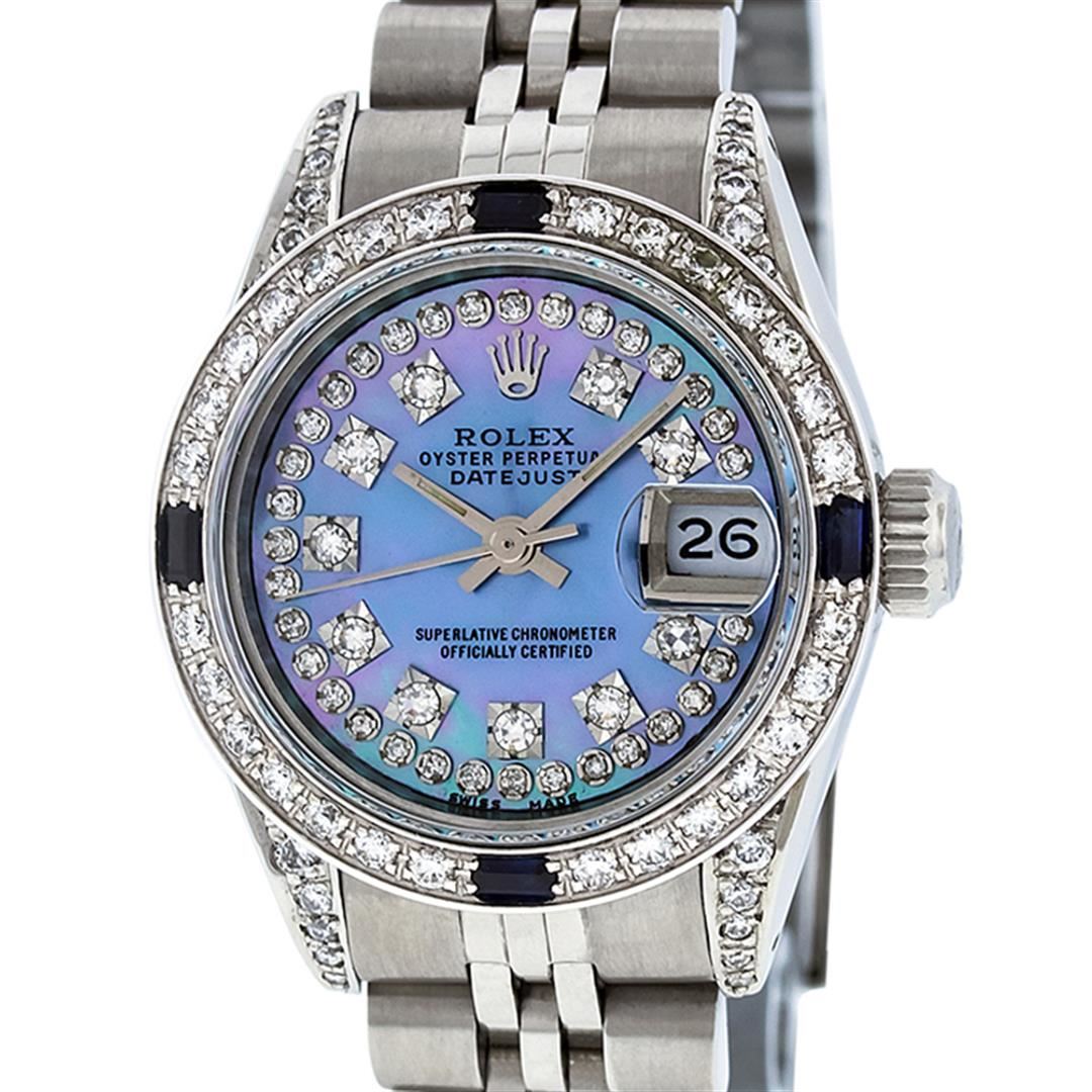 One Ladies Stainless Steel Rolex Datejust Polished Bright with Satin Finish, Serviced & Electronically Tested, Stainless Steel Case: 26mm, Stainless Steel Crown, Diamond Lugs: 24 Diamonds On Lugs, Clarity: SI-VS, Color: G to H. Custom Bezel: New 18K White Gold Sapphire Beadset Bezel, Diamond Count: 28 Diamonds + 4 Sapphires, Total Weight .70 Carat, Clarity: SI-VS, Color: G to H. Custom Crystal: New Scratch Resistant Synthetic Sapphire Cyclops Lens. Custom Hands: New Luminescent Hands. Movement: Automatic Winding Movement Caliber 2030. Custom Dial: Refinished Blue Mother Of Pearl String Diamond Dial, 43 Diamonds in Dial G To H In Color, Clarity: VS. Date Window: 3 O'Clock Position Date Display, Model: Datejust Condition: G-6 Extra Fine. Bracelet: Stainless Steel Jubilee Band. Bright Polish & Satin Finish. 6.0 Inch Length, Adjustable. Standard Clasp, With Rolex Logo. This Watch Has Been Serviced Time Tested And Is In Excellent Condition It Is Free Of All Scratches And Dents.