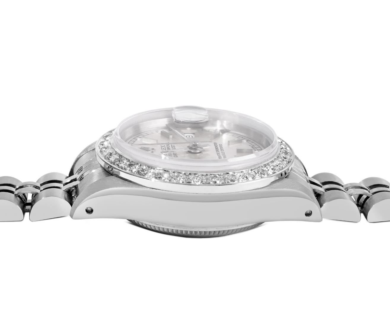 One Rolex Ladies Pre Owned Stainless Steel Datejust Wristwatch Polished Bright with Satin Finish, Serviced & Electronically Tested, Stainless Steel Case: 26mm, Stainless Steel Crown, Custom Bezel: New 18K White Gold Beadset Diamond Bezel, Diamond Count: 32 Diamonds, Total Weight .70 Carat, Clarity: SI-VS, Color: G to H. Custom Crystal: New Sapphire With Magnified Date Window. Custom Hands: New Luminescent Hands. Rolex Movement: 2135 Automatic Winding Movement. Rolex Dial: Factory Silver Dial With Index Hour Markers, Square Roman Track, And Lumi Dots. Date Window: 3 O'Clock Position Date Display, Model: Datejust. Condition: G-6 Extra Fine. Rolex Bracelet: Stainless Steel Jubilee Band. Bright Polish & Satin Finish. 6.0 Inch Length, Adjustable. Standard Clasp, With Rolex Logo. This Watch Has Been Serviced And Time Tested. It Is In Excellent Condition, Free Of All Scratches And Dents. This Watch Comes With A Rolex Box.