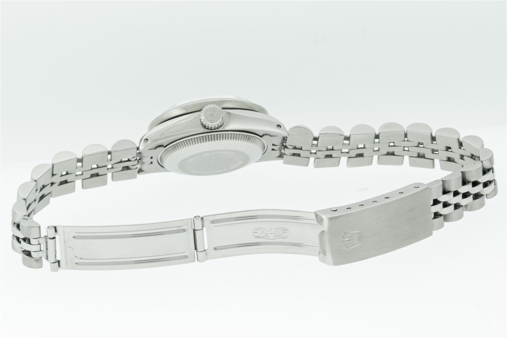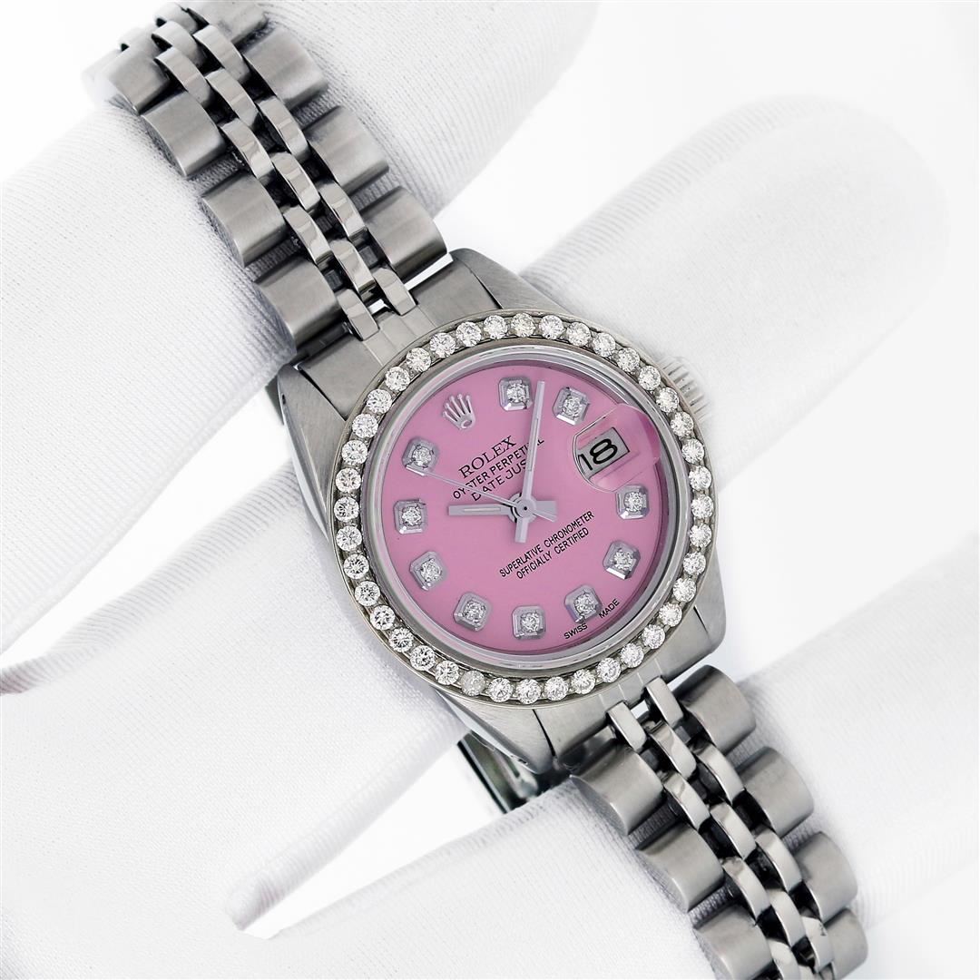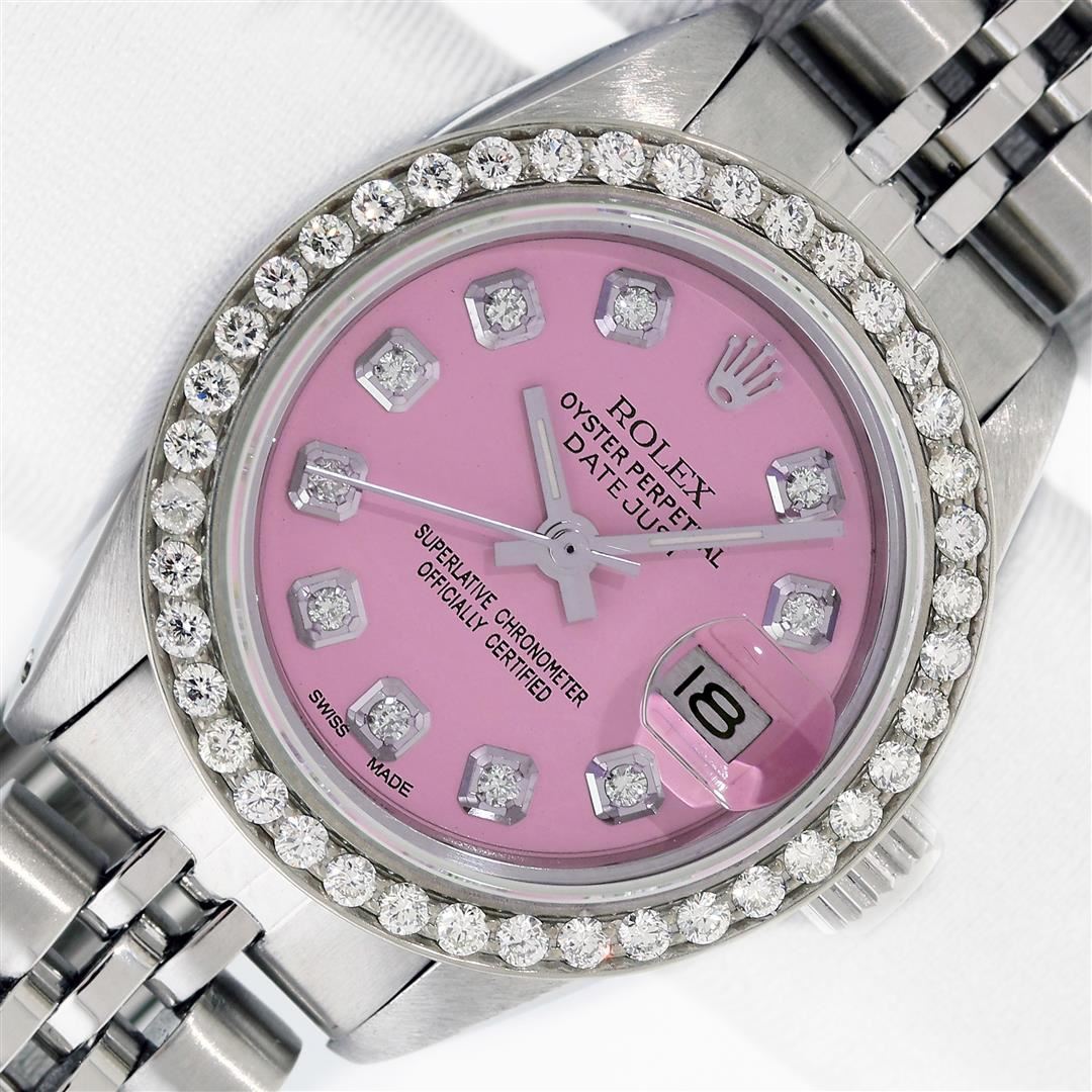 One Ladies Stainless Steel Rolex Datejust Polished Bright with Satin Finish, Serviced & Electronically Tested, Rolex Stainless Steel Case: 26mm, Rolex Stainless Steel Crown, Custom Bezel: New Stainless Steel Beadset Diamond Bezel, Diamond Count: 44 Diamonds Total, Clarity: SI-VS, Color: G to H. Custom Crystal: New Sapphire with Magnified Date Window. Custom Hands: New Luminescent Hands. Rolex Movement: Automatic Winding Movement. Custom Dial: Refinished To Pink with Custom Added Diamond Hour Markers, Diamond Count: 10 Diamonds in Dial G To H In Color, Clarity: SI-VS. Date Window: 3 O'Clock Position Date Display, Model: Datejust. Condition: G-6 Extra Fine. Rolex Bracelet: Stainless Steel Jubilee Band. Bright Polish & Satin Finish. 6.0 Inch Length, Adjustable. Standard Clasp, with Rolex Logo. This Pre Owned Watch Has Been Serviced Time Tested And Is In Excellent Condition It Is Free Of All Scratches And Dents.