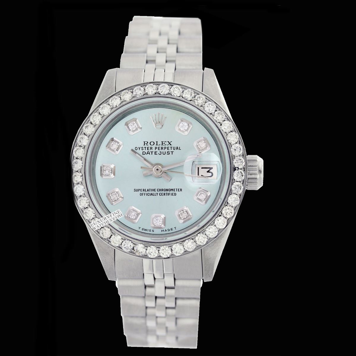 WATCH DETAILS: ITEM: WatchBRAND: RolexTYPE: Stainless SteelFEATURE: MODEL: DateJustMADE: Swiss MadeGENDER: LadiesCONDITION: Pre-OwnedFUNCTION: DateDIAL COLOR: BlueHOUR MARKERS: 10 Round DiamondBEZEL TYPE: Diamond BezelBEZEL STONE: Diamond .80 CTW G-VVS1 BEZEL MATERIAL: 18K GoldBRACELET TYPE: Jubilee BRACELET MATERIAL: Stainless SteelCLASP TYPE: Folding ClaspCLASP MATERIAL: Stainless SteelCASE STONE: CASE SIZE: 36mmCRYSTAL: Scratch Resistance Sapphire CrystalMOVEMENT: Automatic (Self Winding)CALIBER: 2035CROWN TYPE: Screw Down CrownWATER RESISTANCE: Waterproof to 10 ATM/100 meters/330 feetMODEL #: 6917SKU #: ALSJNS93We Buy/Sell/Trade Valuable watches, Please call usNote: Presentational generic box included. This watch was professionally inspected and serviced prior to auction. We are not affiliated with Rolex USA, Inc.