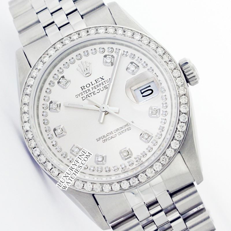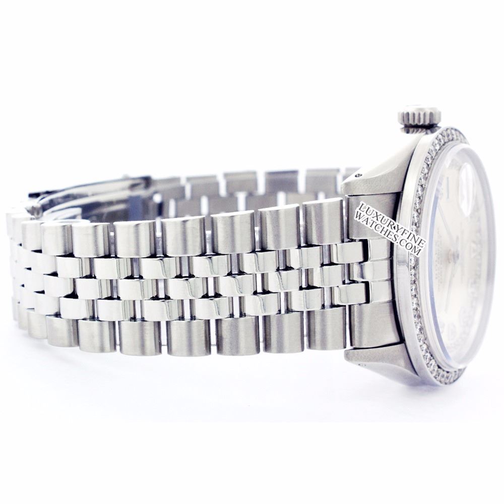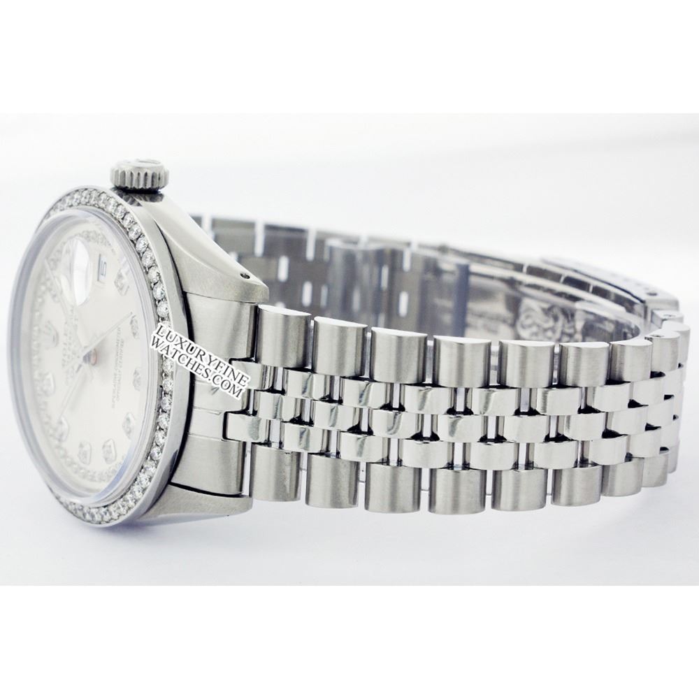 WATCH DETAILS: ITEM: WatchBRAND: RolexTYPE: Stainless SteelFEATURE: MODEL: DateJustMADE: Swiss MadeGENDER: LadiesCONDITION: Pre-OwnedFUNCTION: DateDIAL COLOR: SilverHOUR MARKERS: String Diamond + 10 Round DiamondBEZEL TYPE: Diamond BezelBEZEL STONE: Diamond .80 CTW G-VVS1 BEZEL MATERIAL: 18K GoldBRACELET TYPE: Jubilee BRACELET MATERIAL: Stainless SteelCLASP TYPE: Folding ClaspCLASP MATERIAL: Stainless SteelCASE STONE: CASE SIZE: 36mmCRYSTAL: Scratch Resistance Sapphire CrystalMOVEMENT: Automatic (Self Winding)CALIBER: 2035CROWN TYPE: Screw Down CrownWATER RESISTANCE: Waterproof to 10 ATM/100 meters/330 feetMODEL #: 6917SKU #: ALSJNS36-BWe Buy/Sell/Trade Valuable watches, Please call usNote: Presentational generic box included. This watch was professionally inspected and serviced prior to auction. We are not affiliated with Rolex USA, Inc.