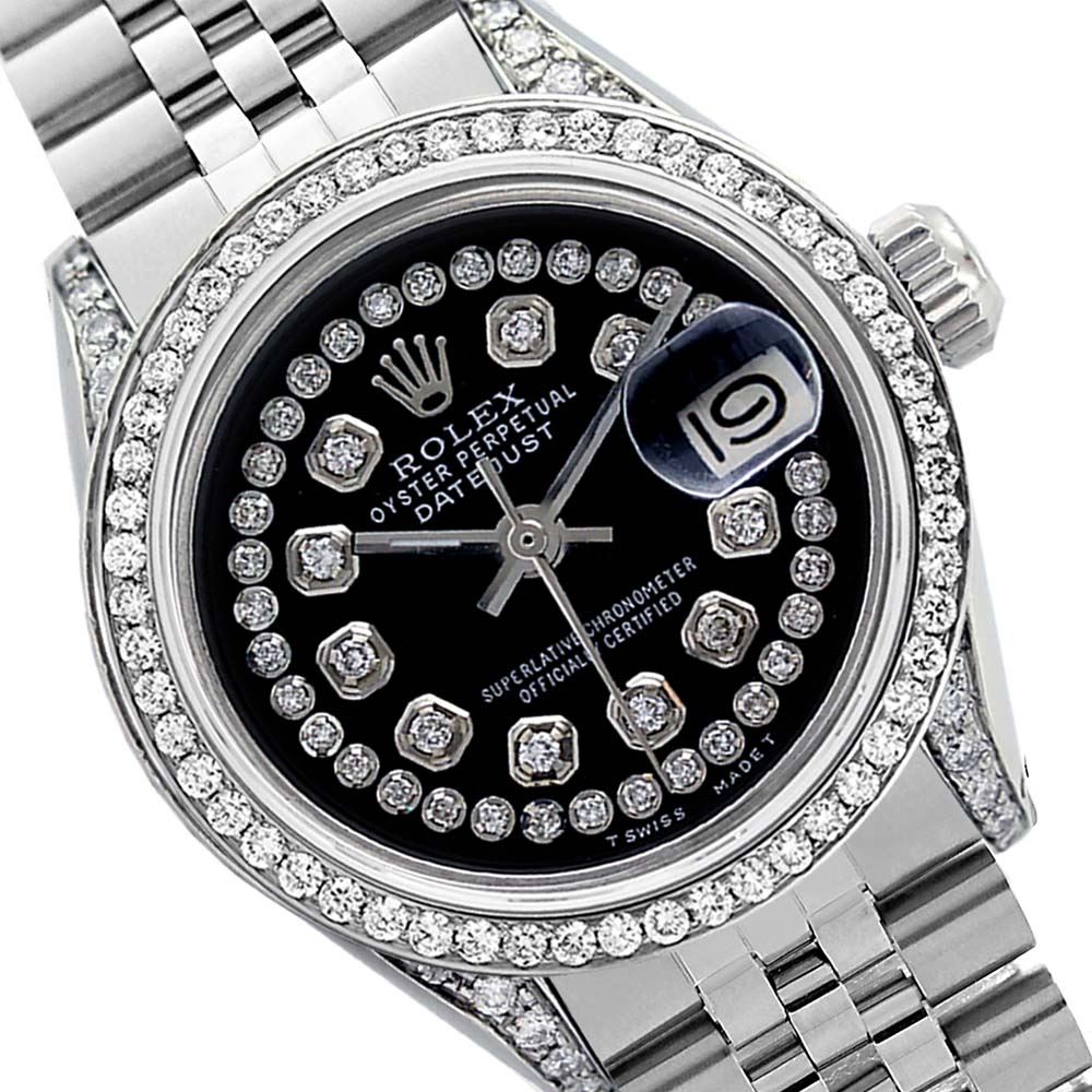 WATCH DETAILS: ITEM: WatchBRAND: RolexTYPE: Stainless SteelFEATURE: MODEL: DateJustMADE: Swiss MadeGENDER: LadiesCONDITION: Pre-OwnedFUNCTION: DateDIAL COLOR: BlackHOUR MARKERS: String Custom Made Diamond + 10 Round Custom Made DiamondBEZEL TYPE: Custom Made Diamond BezelBEZEL STONE: Diamond .80 CTW G-VVS1 BEZEL MATERIAL: 18K GoldBRACELET TYPE: Jubilee BRACELET MATERIAL: Stainless SteelCLASP TYPE: Folding ClaspCLASP MATERIAL: Stainless SteelCASE STONE: .85 CTW G-VVS1 DIAMOND CUSTOMCASE SIZE: 26mmCRYSTAL: Scratch Resistance Sapphire CrystalMOVEMENT: Automatic (Self Winding)CALIBER: 2030CROWN TYPE: Screw Down CrownWATER RESISTANCE: Waterproof to 10 ATM/100 meters/330 feetMODEL #: 6917SKU #: ALSJNS23We Buy/Sell/Trade Valuable watches, Please call us