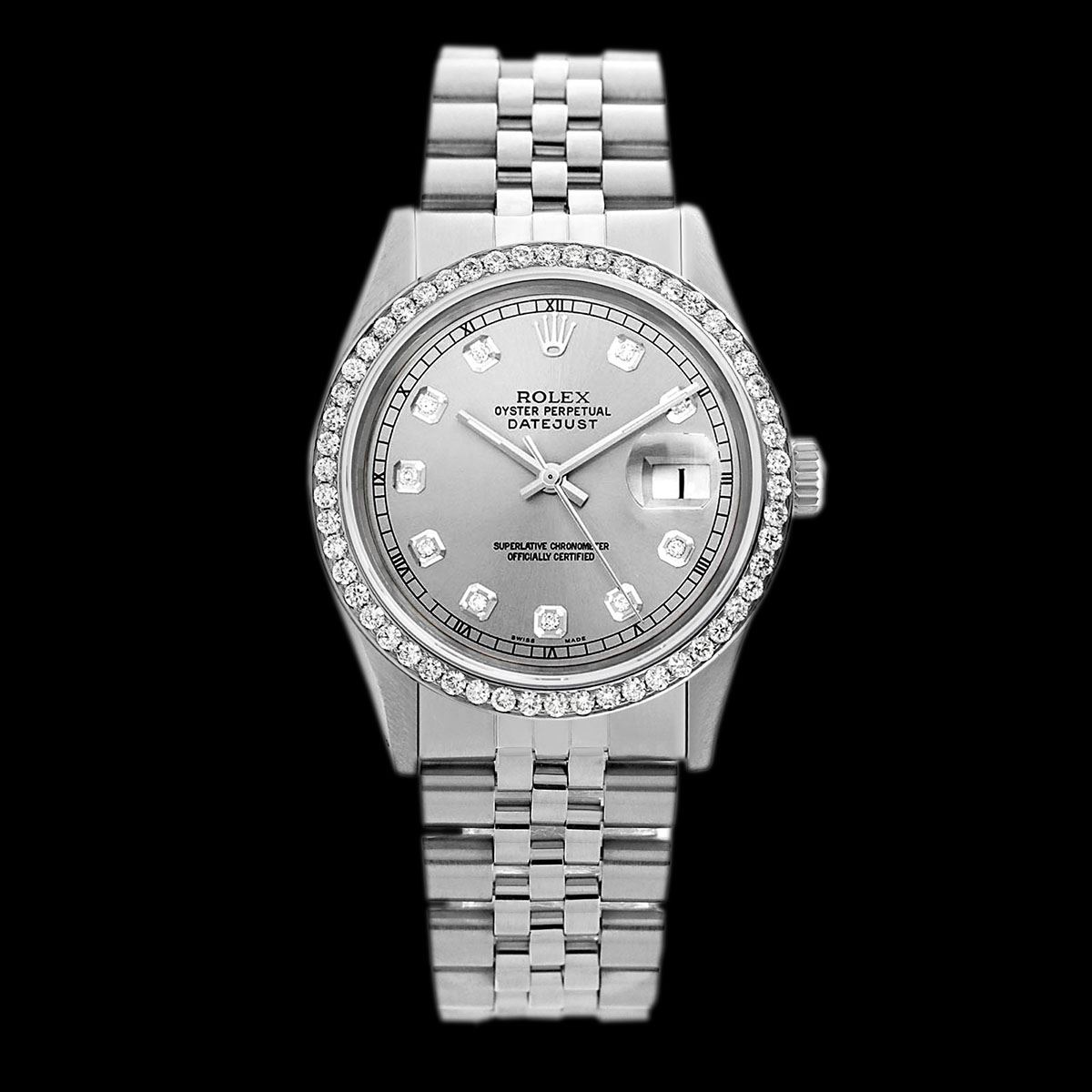 WATCH DETAILS: ITEM: WatchBRAND: RolexTYPE: Stainless SteelFEATURE: MODEL: DateJustMADE: Swiss MadeGENDER: LadiesCONDITION: Pre-OwnedFUNCTION: DateDIAL COLOR: GreyHOUR MARKERS: 10 Round Custom Made DiamondBEZEL TYPE: Custom Made Diamond BezelBEZEL STONE: Diamond .80 CTW G-VVS1 BEZEL MATERIAL: 18K GoldBRACELET TYPE: Jubilee BRACELET MATERIAL: Stainless SteelCLASP TYPE: Folding ClaspCLASP MATERIAL: Stainless SteelCASE STONE: CASE SIZE: 26mmCRYSTAL: Scratch Resistance Sapphire CrystalMOVEMENT: Automatic (Self Winding)CALIBER: 2030CROWN TYPE: Screw Down CrownWATER RESISTANCE: Waterproof to 10 ATM/100 meters/330 feetMODEL #: 6917SKU #: ALSJNS22We Buy/Sell/Trade Valuable watches, Please call us