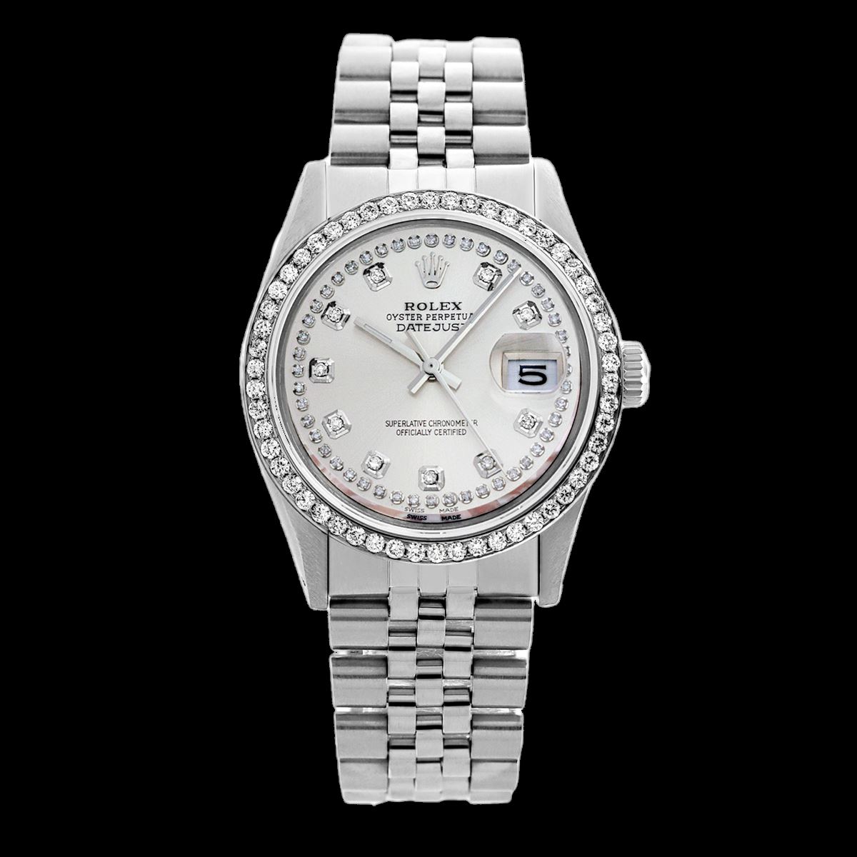 WATCH DETAILS: ITEM: WatchBRAND: RolexTYPE: Stainless SteelFEATURE: MODEL: DateJustMADE: Swiss MadeGENDER: LadiesCONDITION: Pre-OwnedFUNCTION: DateDIAL COLOR: WhiteHOUR MARKERS: String Custom Made Diamond + 10 Round Custom Made DiamondBEZEL TYPE: Custom Made Diamond BezelBEZEL STONE: Diamond .80 CTW G-VVS1 BEZEL MATERIAL: 18K GoldBRACELET TYPE: Jubilee BRACELET MATERIAL: Stainless SteelCLASP TYPE: Folding ClaspCLASP MATERIAL: Stainless SteelCASE STONE: CASE SIZE: 26mmCRYSTAL: Scratch Resistance Sapphire CrystalMOVEMENT: Automatic (Self Winding)CALIBER: 2030CROWN TYPE: Screw Down CrownWATER RESISTANCE: Waterproof to 10 ATM/100 meters/330 feetMODEL #: 6917SKU #: ALSJNS36We Buy/Sell/Trade Valuable watches, Please call us
