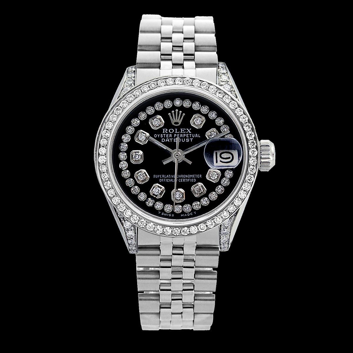 WATCH DETAILS: ITEM: WatchBRAND: RolexTYPE: Stainless SteelFEATURE: MODEL: DateJustMADE: Swiss MadeGENDER: LadiesCONDITION: Pre-OwnedFUNCTION: DateDIAL COLOR: BlackHOUR MARKERS: String Custom Made Diamond + 10 Round Custom Made DiamondBEZEL TYPE: Custom Made Diamond BezelBEZEL STONE: Diamond .80 CTW G-VVS1 BEZEL MATERIAL: 18K GoldBRACELET TYPE: Jubilee BRACELET MATERIAL: Stainless SteelCLASP TYPE: Folding ClaspCLASP MATERIAL: Stainless SteelCASE STONE: .85 CTW G-VVS1 DIAMOND CUSTOMCASE SIZE: 26mmCRYSTAL: Scratch Resistance Sapphire CrystalMOVEMENT: Automatic (Self Winding)CALIBER: 2030CROWN TYPE: Screw Down CrownWATER RESISTANCE: Waterproof to 10 ATM/100 meters/330 feetMODEL #: 6917SKU #: ALSJNS23We Buy/Sell/Trade Valuable watches, Please call us
