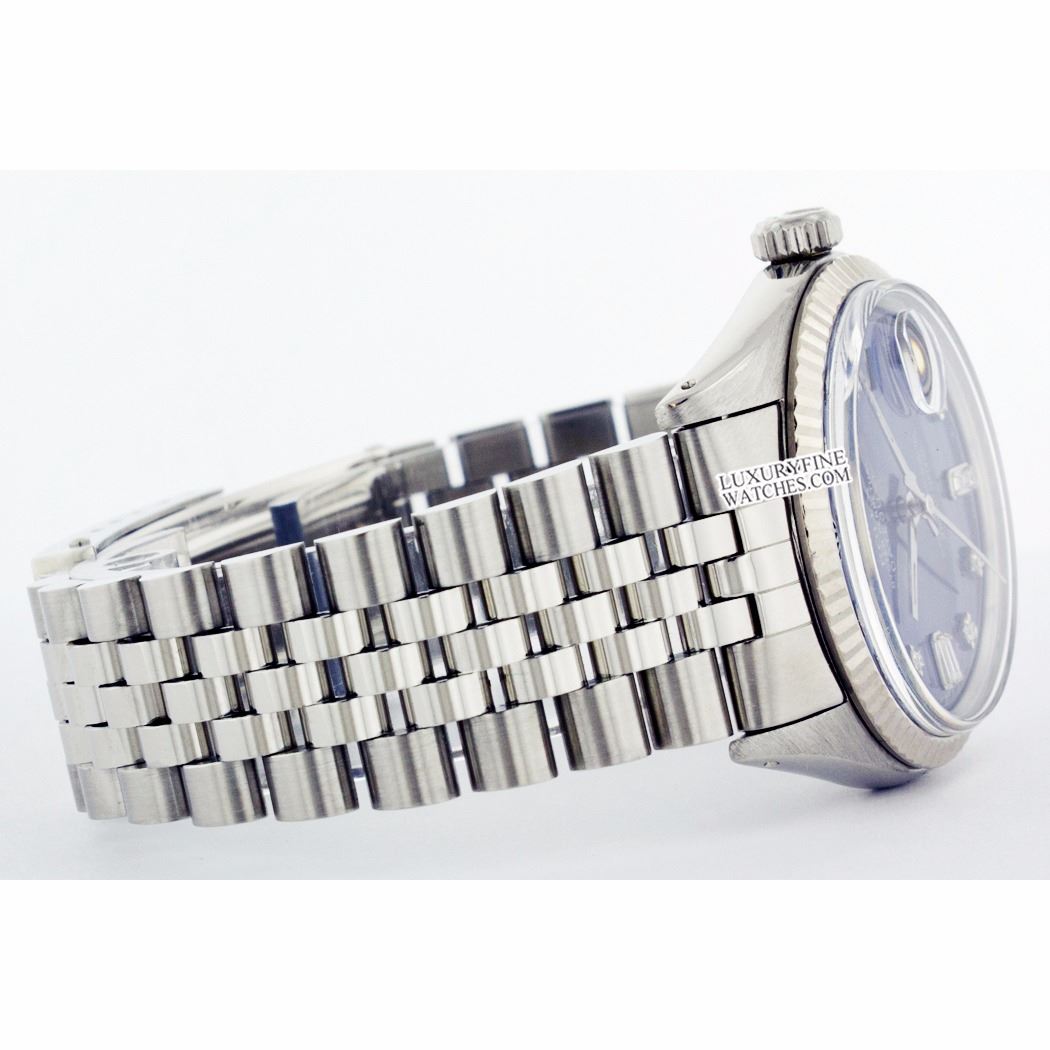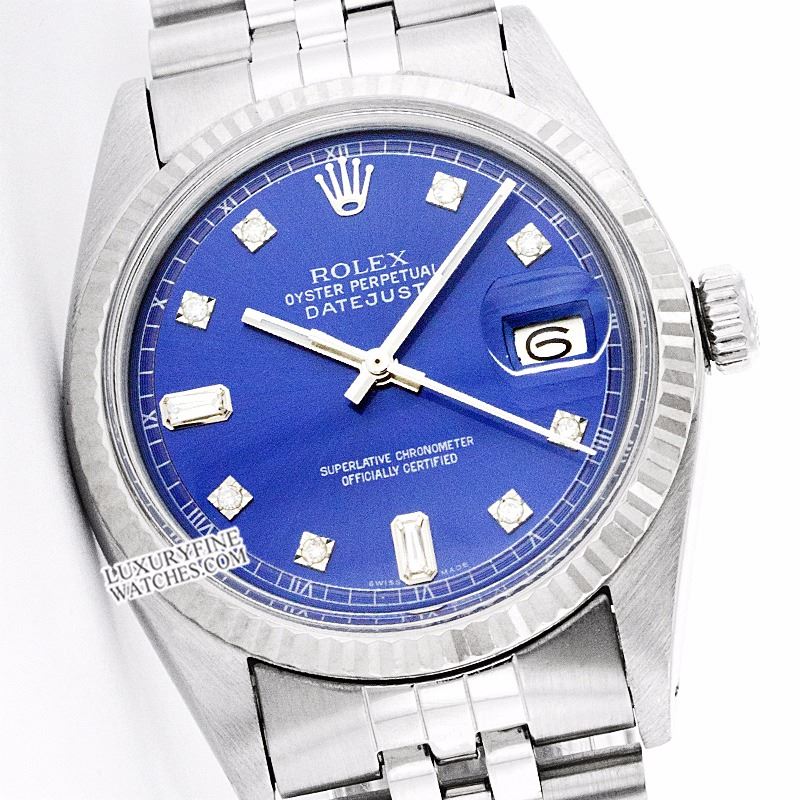 WATCH DETAILS: ITEM: WatchBRAND: RolexTYPE: Stainless SteelFEATURE: MODEL: DateJustMADE: Swiss MadeGENDER: LadiesCONDITION: Pre-OwnedFUNCTION: DateDIAL COLOR: Royal BlueHOUR MARKERS: 8 + 2 , 8 Round and 2 Baguette DiamondBEZEL TYPE: Fluted BezelBEZEL STONE: No StoneBEZEL MATERIAL: 18K GoldBRACELET TYPE: Jubilee BRACELET MATERIAL: Stainless SteelCLASP TYPE: Folding ClaspCLASP MATERIAL: Stainless SteelCASE STONE: CASE SIZE: 36mmCRYSTAL: Acrylic MOVEMENT: Automatic (Self Winding)CALIBER: 2035CROWN TYPE: Screw Down CrownWATER RESISTANCE: Waterproof to 10 ATM/100 meters/330 feetMODEL #: 6917SKU #: ALSJNP6We Buy/Sell/Trade Valuable watches, Please call usNote: Presentational generic box included. This watch was professionally inspected and serviced prior to auction. We are not affiliated with Rolex USA, Inc.