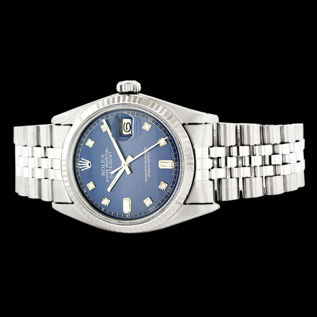 WATCH DETAILS: ITEM: WatchBRAND: RolexTYPE: Stainless SteelFEATURE: MODEL: DateJustMADE: Swiss MadeGENDER: LadiesCONDITION: Pre-OwnedFUNCTION: DateDIAL COLOR: Royal BlueHOUR MARKERS: 8 + 2 , 8 Round and 2 Baguette Custom Made DiamondBEZEL TYPE: Fluted BezelBEZEL STONE: No StoneBEZEL MATERIAL: 18K GoldBRACELET TYPE: Jubilee BRACELET MATERIAL: Stainless SteelCLASP TYPE: Folding ClaspCLASP MATERIAL: Stainless SteelCASE STONE: CASE SIZE: 26mmCRYSTAL: Acrylic MOVEMENT: Automatic (Self Winding)CALIBER: 2030CROWN TYPE: Screw Down CrownWATER RESISTANCE: Waterproof to 10 ATM/100 meters/330 feetMODEL #: 6917SKU #: ALSJNP6We Buy/Sell/Trade Valuable watches, Please call us
