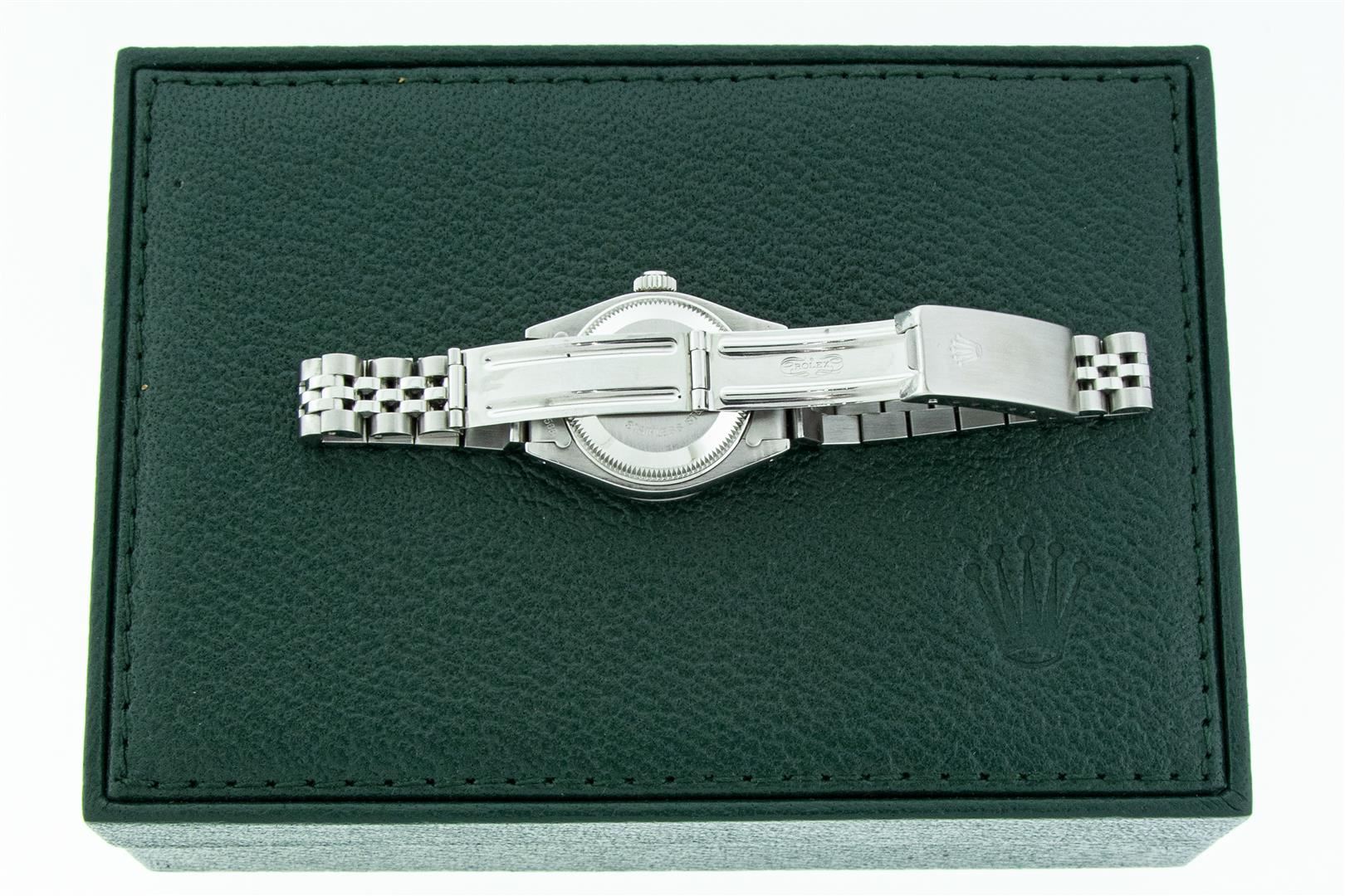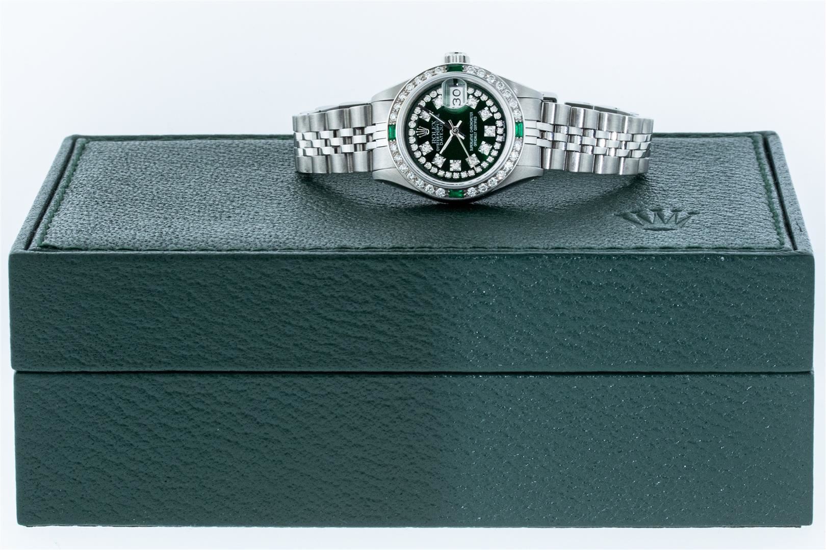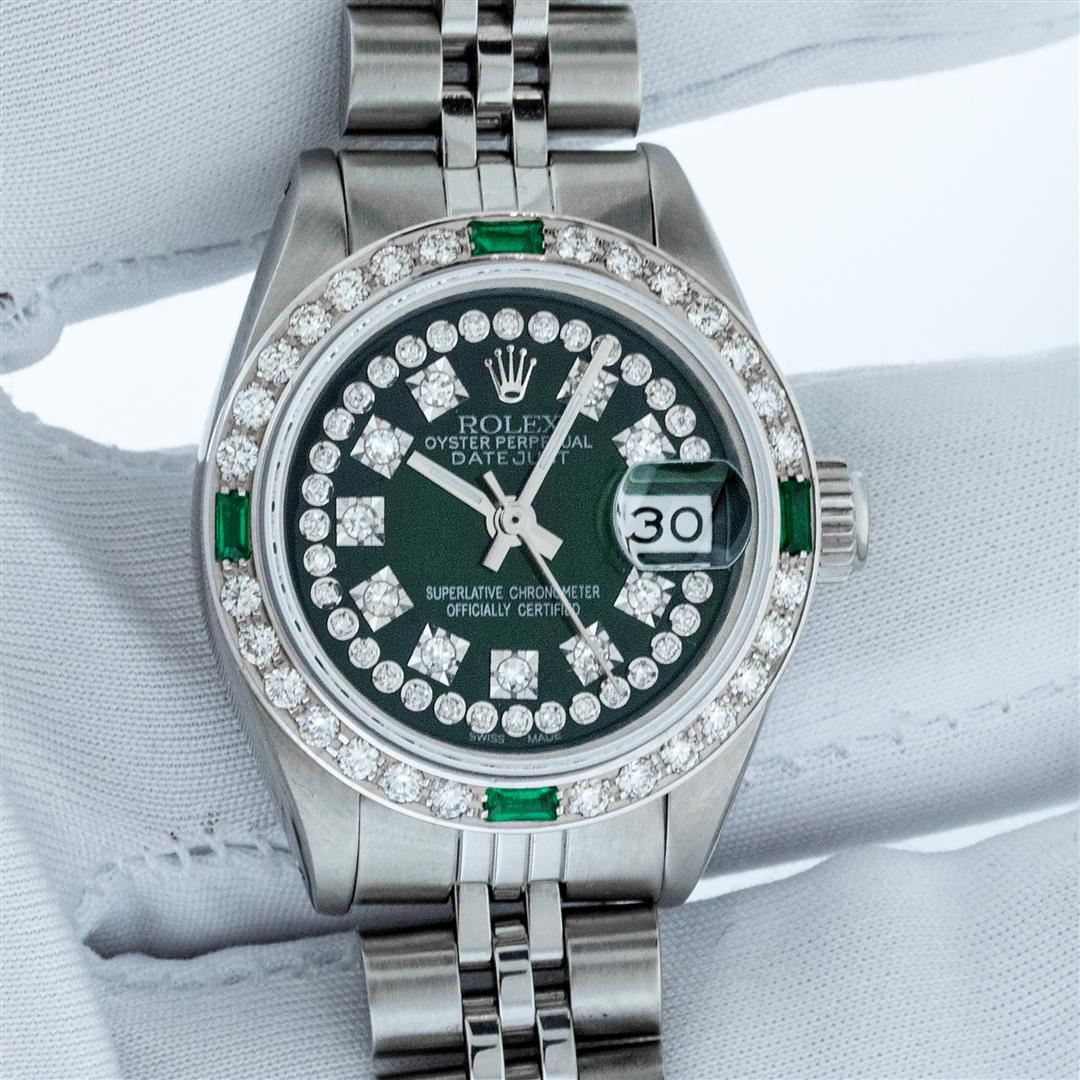 One Ladies Stainless Steel Rolex Datejust Polished Bright with Satin Finish, Serviced & Electronically Tested, Stainless Steel Case: 26mm, Stainless Steel Crown. Custom Bezel: New 18K White Gold Beadset & Emerald Diamond Bezel, Diamond Count: 28 Diamonds + 4 Emeralds. Total Weight .70 Carat, Clarity: SI-VS, Color: G to H. Custom Crystal: New Scratch Resistant Synthetic Sapphire Cyclops Lens. Custom Hands: New Luminescent Hands. Movement: Automatic Winding Movement Caliber 2030. Custom Dial: Refinished Green String Single Cut Diamond Dial, Stone Count: 43 Diamonds On Dial, G To H In Color, Clarity: SI-VS. Date Window: 3 O'Clock Position Date Display, Model: Datejust. Condition: G-6 Extra Fine. Bracelet: Stainless Steel Jubilee Band. Bright Polish & Satin Finish. 6.0 Inch Length, Adjustable. Standard Clasp, With Rolex Logo. This Watch Has Been Serviced Time Tested And Is In Excellent Condition It Is Free Of All Scratches And Dents. This Watch Comes With A Rolex Box.