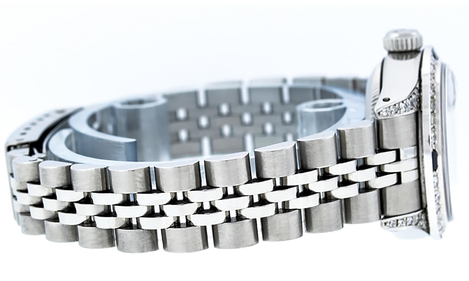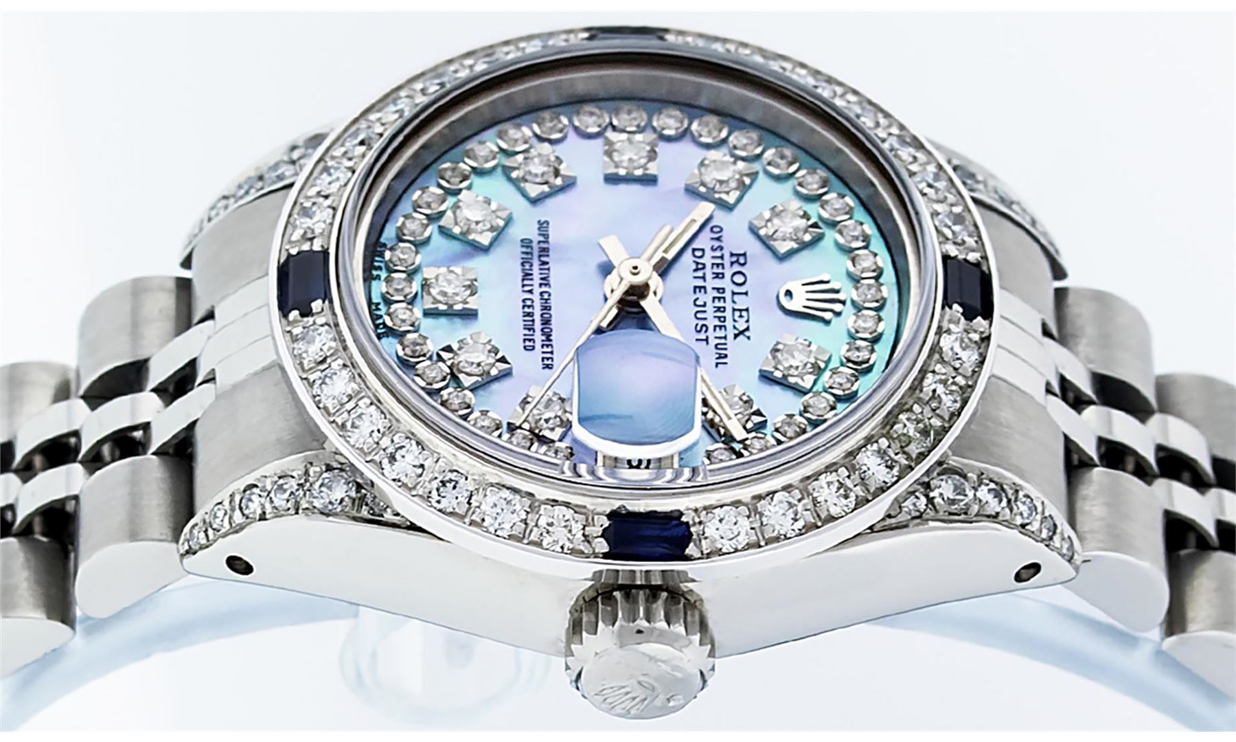 One Ladies Stainless Steel Rolex Datejust Polished Bright with Satin Finish, Serviced & Electronically Tested, Stainless Steel Case: 26mm, Stainless Steel Crown, Diamond Lugs: 24 Diamonds On Lugs, Clarity: SI-VS, Color: G to H. Custom Bezel: New 18K White Gold Sapphire Beadset Bezel, Diamond Count: 28 Diamonds + 4 Sapphires, Total Weight .70 Carat, Clarity: SI-VS, Color: G to H. Custom Crystal: New Scratch Resistant Synthetic Sapphire Cyclops Lens. Custom Hands: New Luminescent Hands. Movement: Automatic Winding Movement Caliber 2030. Custom Dial: Refinished Blue Mother Of Pearl String Diamond Dial, 43 Diamonds in Dial G To H In Color, Clarity: VS. Date Window: 3 O'Clock Position Date Display, Model: Datejust Condition: G-6 Extra Fine. Bracelet: Stainless Steel Jubilee Band. Bright Polish & Satin Finish. 6.0 Inch Length, Adjustable. Standard Clasp, With Rolex Logo. This Watch Has Been Serviced Time Tested And Is In Excellent Condition It Is Free Of All Scratches And Dents.