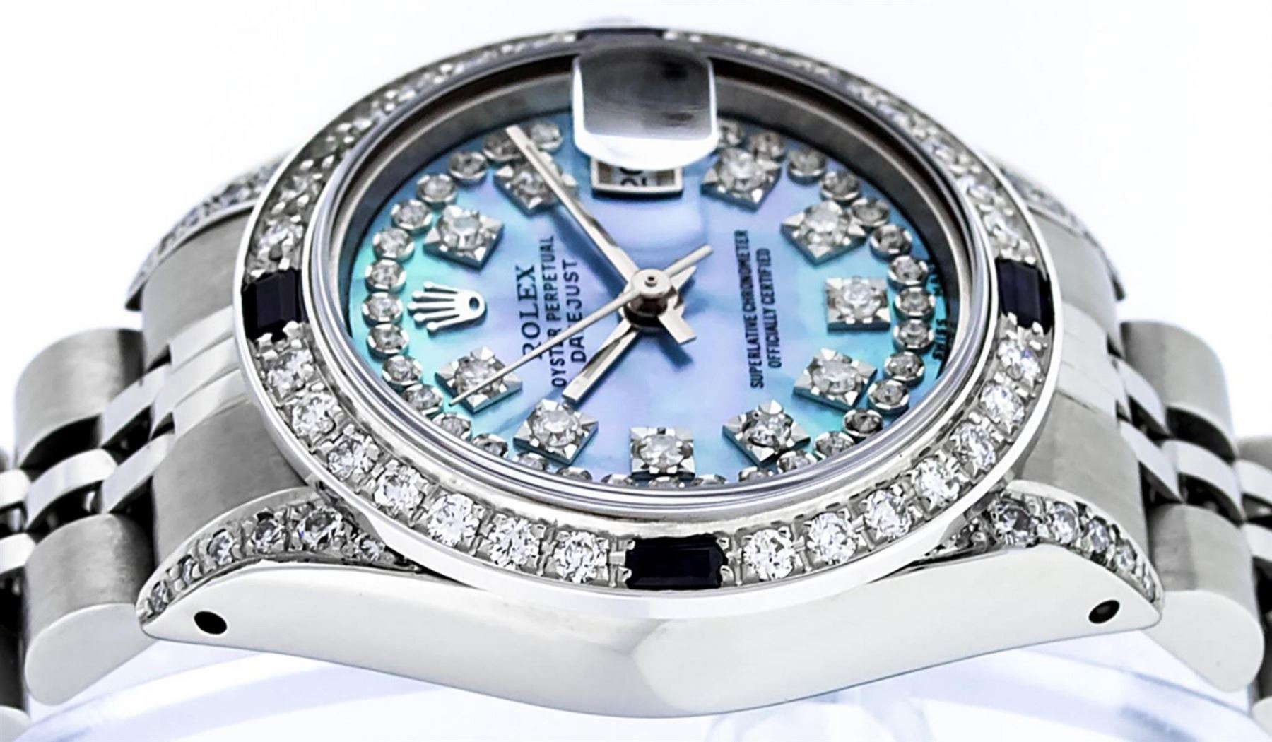 One Ladies Stainless Steel Rolex Datejust Polished Bright with Satin Finish, Serviced & Electronically Tested, Stainless Steel Case: 26mm, Stainless Steel Crown, Diamond Lugs: 24 Diamonds On Lugs, Clarity: SI-VS, Color: G to H. Custom Bezel: New 18K White Gold Sapphire Beadset Bezel, Diamond Count: 28 Diamonds + 4 Sapphires, Total Weight .70 Carat, Clarity: SI-VS, Color: G to H. Custom Crystal: New Scratch Resistant Synthetic Sapphire Cyclops Lens. Custom Hands: New Luminescent Hands. Movement: Automatic Winding Movement Caliber 2030. Custom Dial: Refinished Blue Mother Of Pearl String Diamond Dial, 43 Diamonds in Dial G To H In Color, Clarity: VS. Date Window: 3 O'Clock Position Date Display, Model: Datejust  Condition: G-6 Extra Fine. Bracelet: Stainless Steel Jubilee Band. Bright Polish & Satin Finish. 6.0 Inch Length, Adjustable. Standard Clasp, With Rolex Logo. This Watch Has Been Serviced Time Tested And Is In Excellent Condition It Is Free Of All Scratches And Dents.