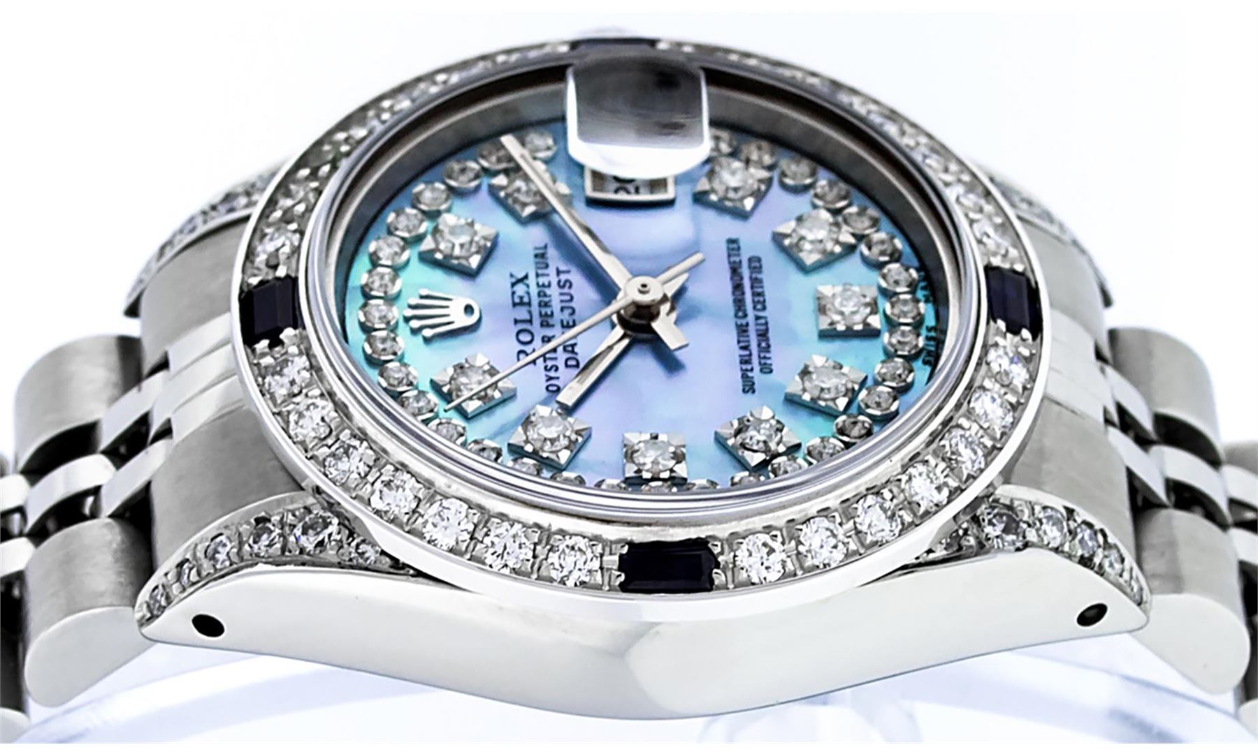 One Ladies Stainless Steel Rolex Datejust Polished Bright with Satin Finish, Serviced & Electronically Tested, Stainless Steel Case: 26mm, Stainless Steel Crown, Diamond Lugs: 24 Diamonds On Lugs, Clarity: SI-VS, Color: G to H. Custom Bezel: New 18K White Gold Sapphire Beadset Bezel, Diamond Count: 28 Diamonds + 4 Sapphires, Total Weight .70 Carat, Clarity: SI-VS, Color: G to H. Custom Crystal: New Scratch Resistant Synthetic Sapphire Cyclops Lens. Custom Hands: New Luminescent Hands. Movement: Automatic Winding Movement Caliber 2030. Custom Dial: Refinished Blue Mother Of Pearl String Diamond Dial, 43 Diamonds in Dial G To H In Color, Clarity: VS. Date Window: 3 O'Clock Position Date Display, Model: Datejust Condition: G-6 Extra Fine. Bracelet: Stainless Steel Jubilee Band. Bright Polish & Satin Finish. 6.0 Inch Length, Adjustable. Standard Clasp, With Rolex Logo. This Watch Has Been Serviced Time Tested And Is In Excellent Condition It Is Free Of All Scratches And Dents.