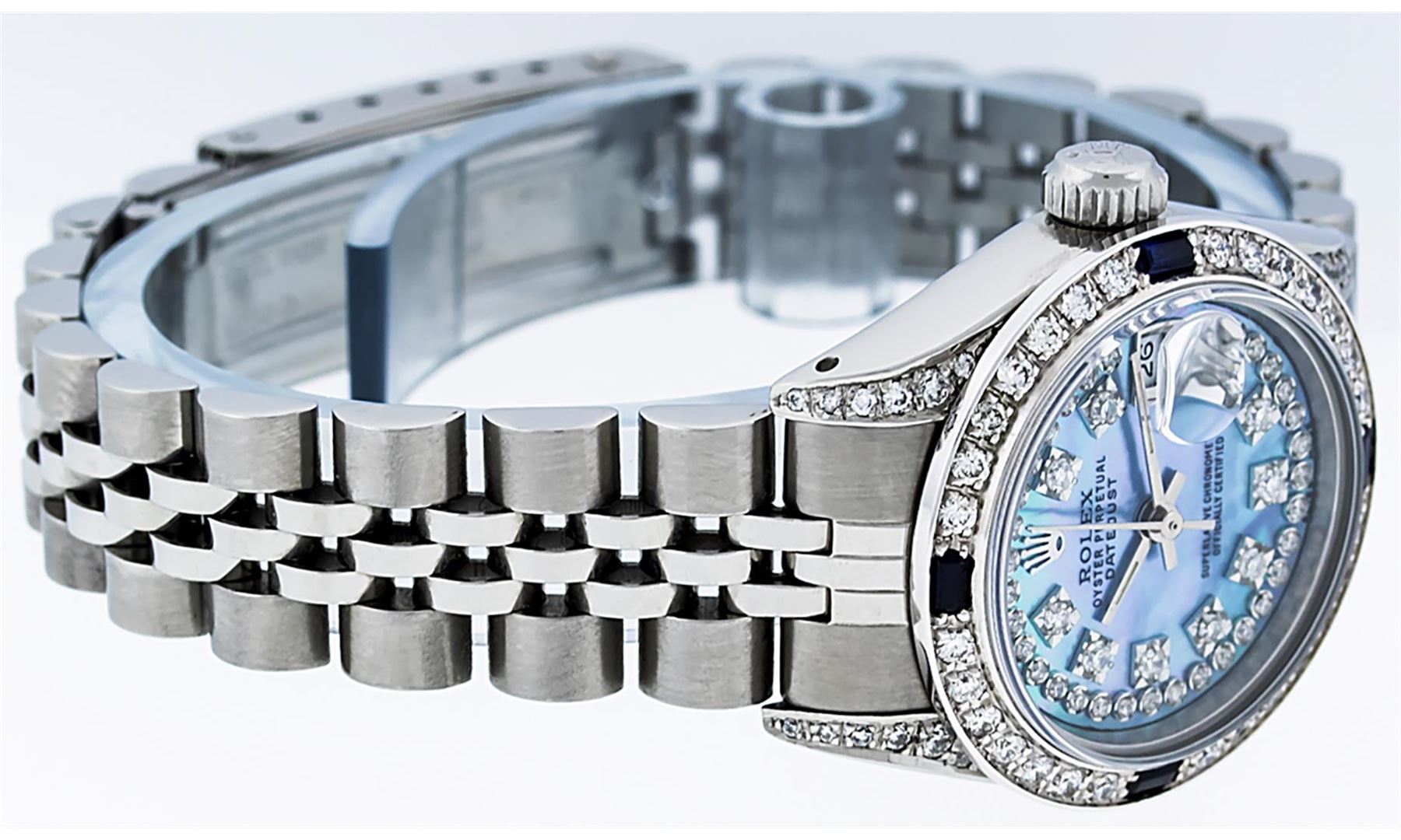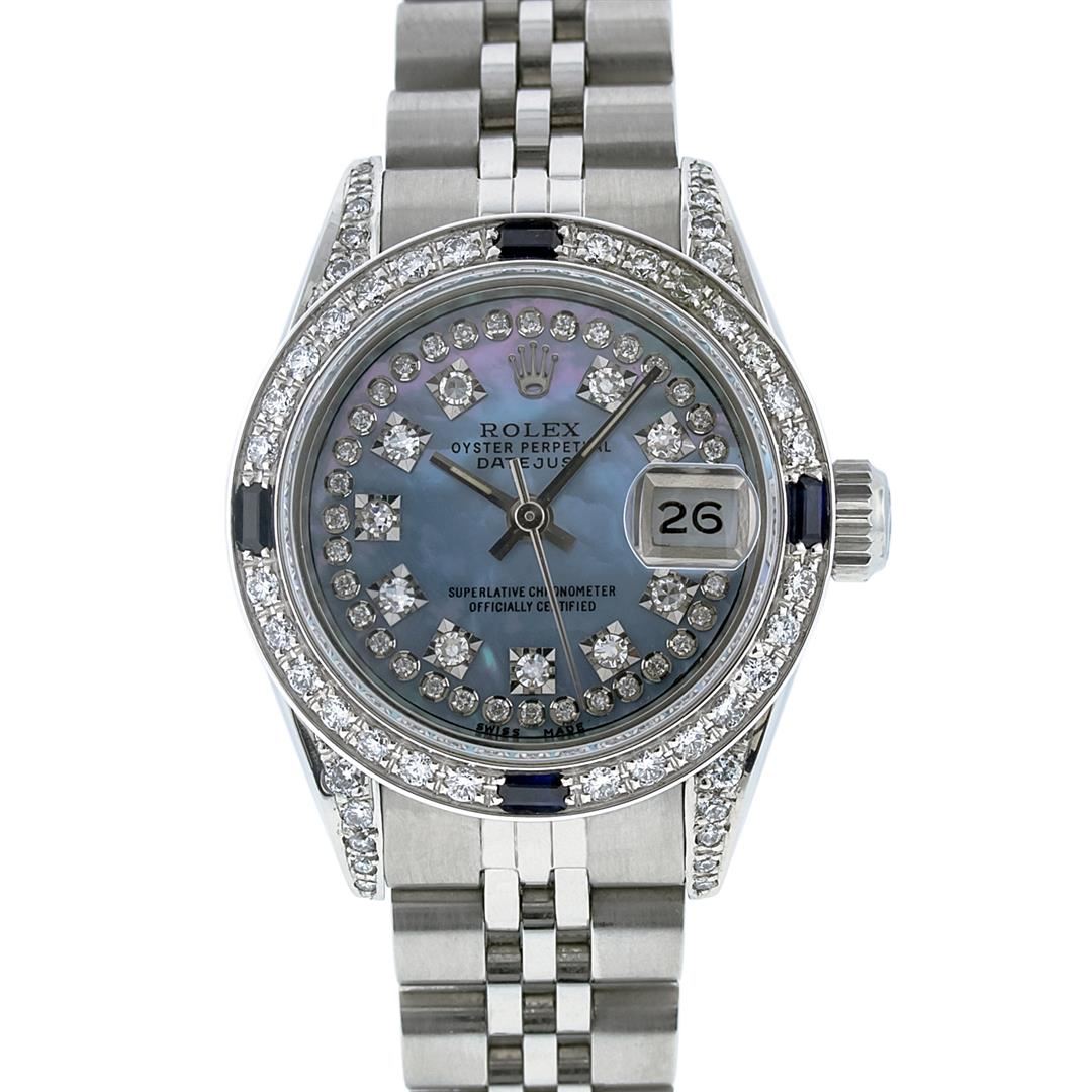 One Ladies Stainless Steel Rolex Datejust Polished Bright with Satin Finish, Serviced & Electronically Tested, Stainless Steel Case: 26mm, Stainless Steel Crown, Diamond Lugs: 24 Diamonds On Lugs, Clarity: SI-VS, Color: G to H. Custom Bezel: New 18K White Gold Sapphire Beadset Bezel, Diamond Count: 28 Diamonds + 4 Sapphires, Total Weight .70 Carat, Clarity: SI-VS, Color: G to H. Custom Crystal: New Scratch Resistant Synthetic Sapphire Cyclops Lens. Custom Hands: New Luminescent Hands. Movement: Automatic Winding Movement. Custom Dial: Refinished Blue Mother Of Pearl String Diamond Dial, 43 Diamonds in Dial G To H In Color, Clarity: VS. Date Window: 3 O'Clock Position Date Display, Model: Datejust Condition: G-6 Extra Fine. Bracelet: Stainless Steel Jubilee Band. Bright Polish & Satin Finish. 6.0 Inch Length, Adjustable. Standard Clasp, With Rolex Logo. This Watch Has Been Serviced Time Tested And Is In Excellent Condition It Is Free Of All Scratches And Dents.