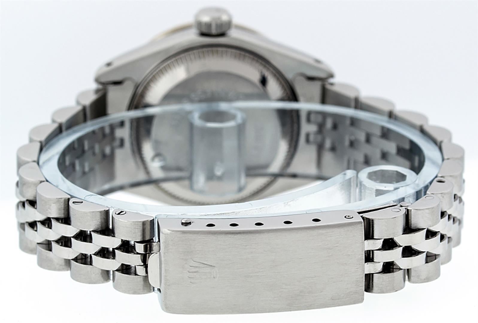 One Ladies Stainless Steel Rolex Datejust Polished Bright with Satin Finish, Serviced & Electronically Tested, Stainless Steel Case: 26mm, Stainless Steel Crown, Diamond Lugs: 24 Diamonds On Lugs, Clarity: SI-VS, Color: G to H. Custom Bezel: New 18K White Gold Emerald Beadset Bezel, Diamond Count: 28 Diamonds + 4 Emeralds, Total Weight .70 Carat, Clarity: SI-VS, Color: G to H. Custom Crystal: New Synthetic Sapphire Cyclops Lens. Custom Hands: New Luminescent Hands. Movement: Automatic Winding Movement Caliber 2030. Custom Dial: Refinished Mother Of Pearl String Diamond Dial, 43 Diamonds in Dial G To H In Color, Clarity: VS. Date Window: 3 O'clock Position Date Display, Model: Datejust Condition: G-6 Extra Fine. Bracelet: Stainless Steel Jubilee. Bright Polish & Satin Finish. 6.0 Inch Length, Adjustable. Standard Clasp, With Rolex Logo. This Watch Has Been Serviced Time Tested And Is In Excellent Condition It Is Free Of All Scratches And Dents.
