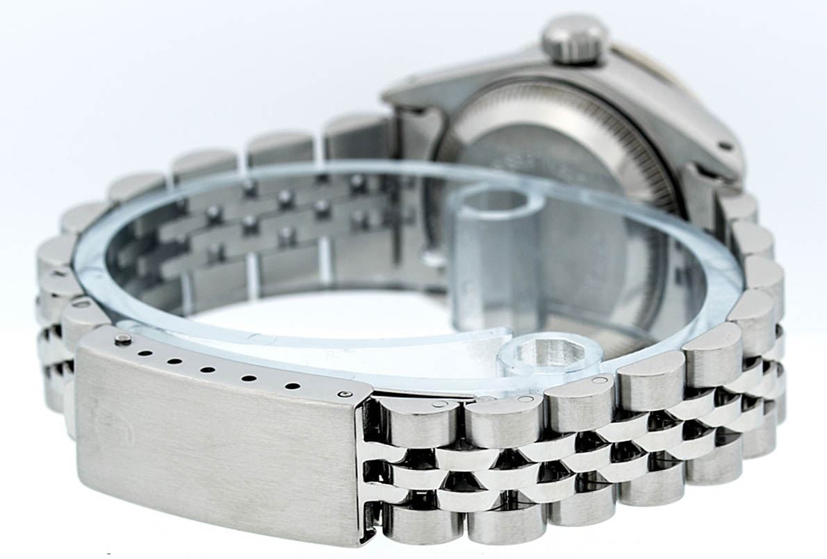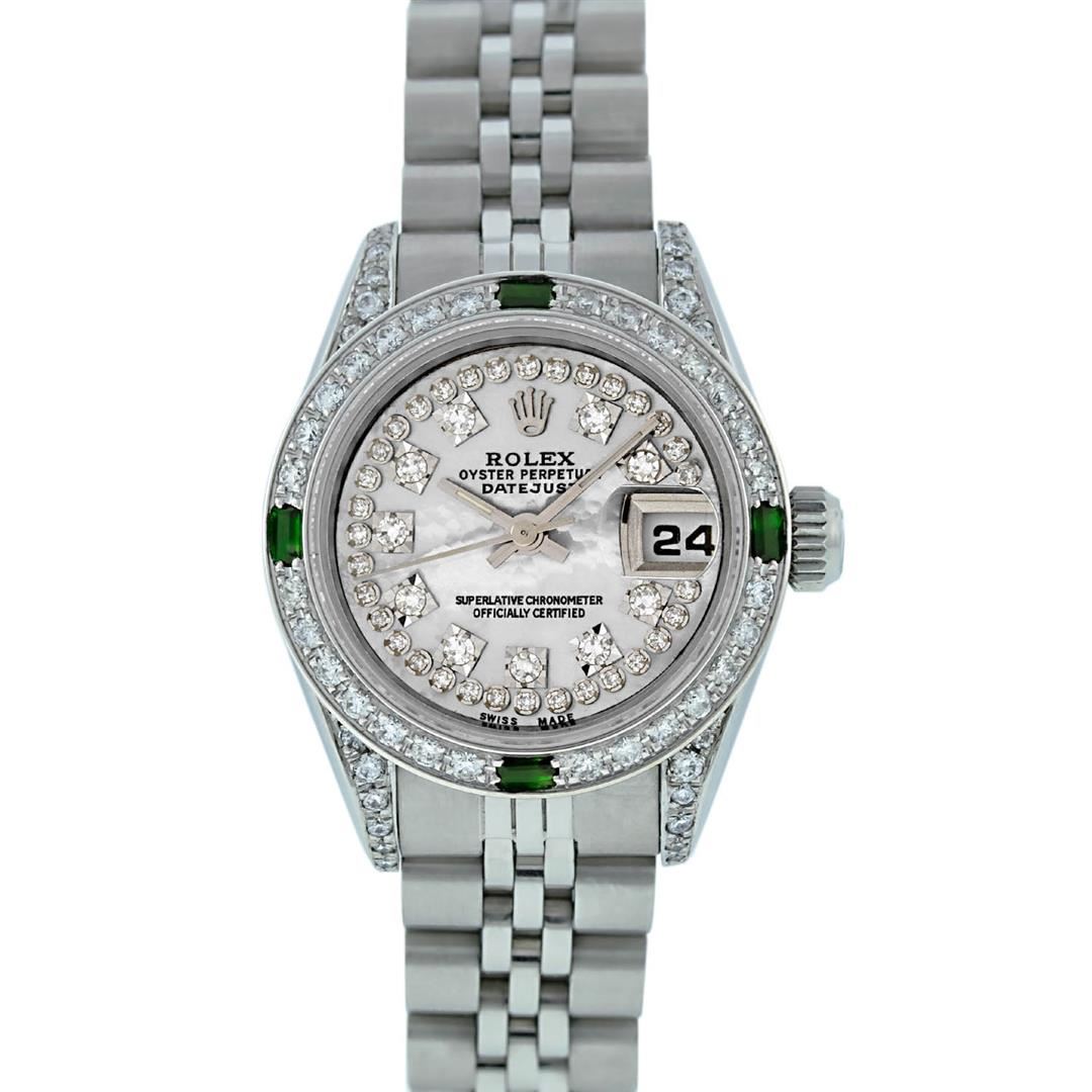 One Ladies Stainless Steel Rolex Datejust Polished Bright with Satin Finish, Serviced & Electronically Tested, Stainless Steel Case: 26mm, Stainless Steel Crown, Diamond Lugs: 24 Diamonds On Lugs, Clarity: SI-VS, Color: G to H. Custom Bezel: New 18K White Gold Synthetic Emerald Beadset Bezel, Diamond Count: 28 Diamonds + 4 Synthetic Emeralds, Total Weight .70 Carat, Clarity: SI-VS, Color: G to H. Custom Crystal: New Synthetic Sapphire Cyclops Lens. Custom Hands: New Luminescent Hands. Movement: Automatic Winding Movement Caliber 2030. Custom Dial: Refinished Mother Of Pearl String Diamond Dial, 43 Diamonds in Dial G To H In Color, Clarity: VS. Date Window: 3 O'Clock Position Date Display, Model: Datejust Condition: G-6 Extra Fine. Bracelet: Stainless Steel Jubilee. Bright Polish & Satin Finish. 6.0 Inch Length, Adjustable. Standard Clasp, With Rolex Logo. This Watch Has Been Serviced Time Tested And Is In Excellent Condition It Is Free Of All Scratches And Dents.