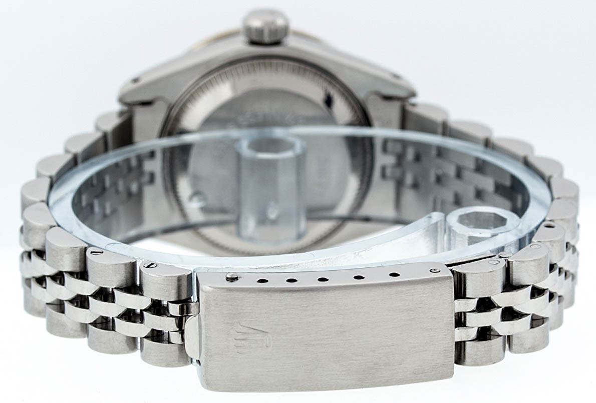 One Ladies Stainless Steel Rolex Datejust Polished Bright with Satin Finish, Serviced & Electronically Tested, Stainless Steel Case: 26mm, Stainless Steel Crown, Diamond Lugs: 24 Diamonds On Lugs, Clarity: SI-VS, Color: G to H. Custom Bezel: New 18K White Gold Synthetic Emerald Beadset Bezel, Diamond Count: 28 Diamonds + 4 Synthetic Emeralds, Total Weight .70 Carat, Clarity: SI-VS, Color: G to H. Custom Crystal: New Synthetic Sapphire Cyclops Lens. Custom Hands: New Luminescent Hands. Movement: Automatic Winding Movement Caliber 2030. Custom Dial: Refinished Mother Of Pearl String Diamond Dial, 43 Diamonds in Dial G To H In Color, Clarity: VS. Date Window: 3 O'Clock Position Date Display, Model: Datejust Condition: G-6 Extra Fine. Bracelet: Stainless Steel Jubilee. Bright Polish & Satin Finish. 6.0 Inch Length, Adjustable. Standard Clasp, With Rolex Logo. This Watch Has Been Serviced Time Tested And Is In Excellent Condition It Is Free Of All Scratches And Dents.
