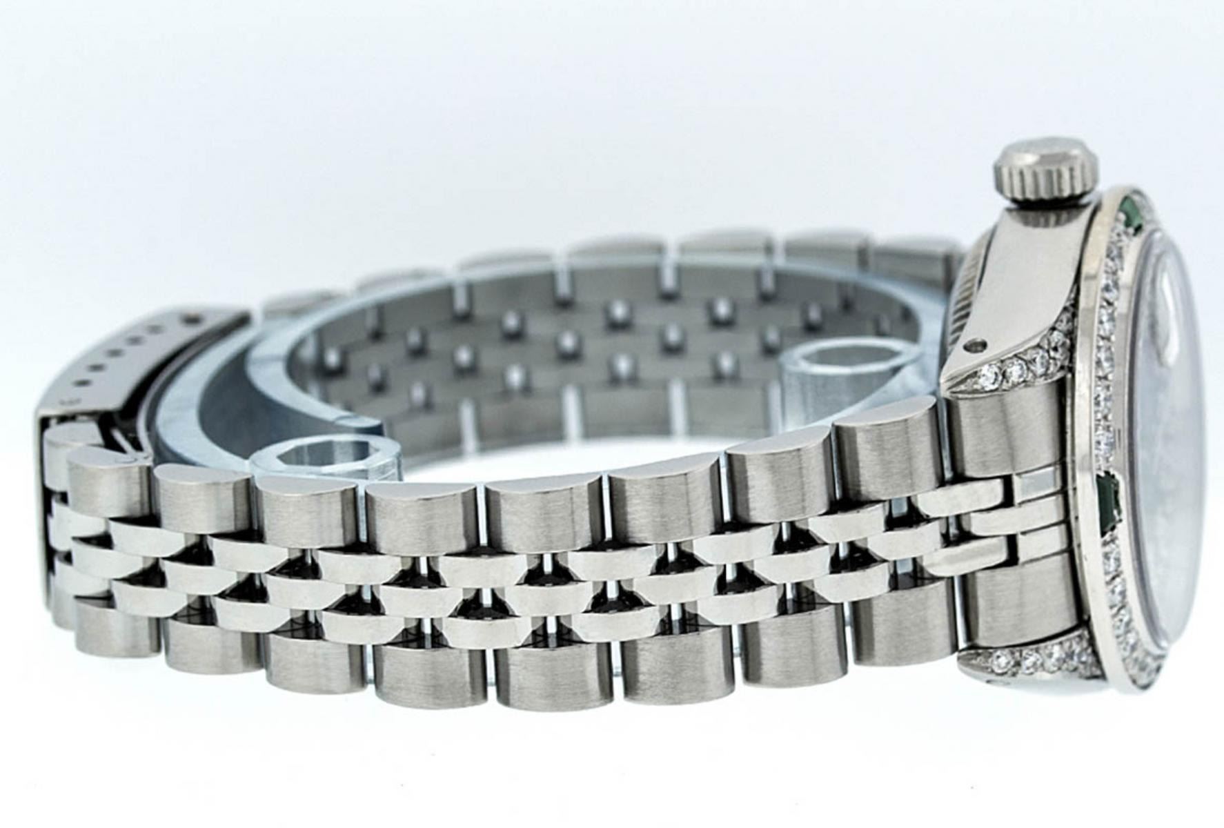 One Ladies Stainless Steel Rolex Datejust Polished Bright with Satin Finish, Serviced & Electronically Tested, Stainless Steel Case: 26mm, Stainless Steel Crown, Diamond Lugs: 24 Diamonds On Lugs, Clarity: SI-VS, Color: G to H. Custom Bezel: New 18K White Gold Synthetic Emerald Beadset Bezel, Diamond Count: 28 Diamonds + 4 Synthetic Emeralds, Total Weight .70 Carat, Clarity: SI-VS, Color: G to H. Custom Crystal: New Synthetic Sapphire Cyclops Lens. Custom Hands: New Luminescent Hands. Movement: Automatic Winding Movement Caliber 2030. Custom Dial: Refinished Mother Of Pearl String Diamond Dial, 43 Diamonds in Dial G To H In Color, Clarity: VS. Date Window: 3 O'Clock Position Date Display, Model: Datejust Condition: G-6 Extra Fine. Bracelet: Stainless Steel Jubilee. Bright Polish & Satin Finish. 6.0 Inch Length, Adjustable. Standard Clasp, With Rolex Logo. This Watch Has Been Serviced Time Tested And Is In Excellent Condition It Is Free Of All Scratches And Dents.