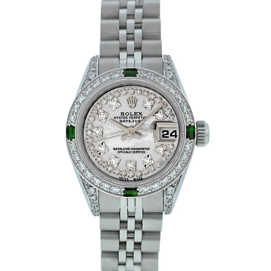 One Ladies Stainless Steel Rolex Datejust Polished Bright with Satin Finish, Serviced & Electronically Tested, Stainless Steel Case: 26mm, Stainless Steel Crown, Diamond Lugs: 24 Diamonds On Lugs, Clarity: SI-VS, Color: G to H. Custom Bezel: New 18K White Gold Emerald Beadset Bezel, Diamond Count: 28 Diamonds + 4 Emeralds, Total Weight .70 Carat, Clarity: SI-VS, Color: G to H. Custom Crystal: New Synthetic Sapphire Cyclops Lens. Custom Hands: New Luminescent Hands. Movement: Automatic Winding Movement Caliber 2030. Custom Dial: Refinished Mother Of Pearl String Diamond Dial, 43 Diamonds in Dial G To H In Color, Clarity: VS. Date Window: 3 O'clock Position Date Display, Model: Datejust Condition: G-6 Extra Fine. Bracelet: Stainless Steel Jubilee. Bright Polish & Satin Finish. 6.0 Inch Length, Adjustable. Standard Clasp, With Rolex Logo. This Watch Has Been Serviced Time Tested And Is In Excellent Condition It Is Free Of All Scratches And Dents.