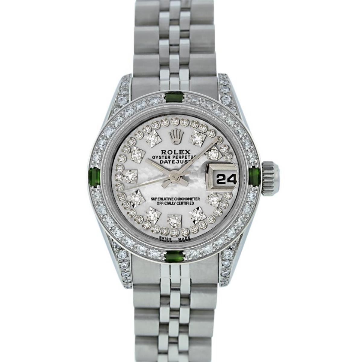 One Ladies Stainless Steel Rolex Datejust Polished Bright with Satin Finish, Serviced & Electronically Tested, Stainless Steel Case: 26mm, Stainless Steel Crown, Diamond Lugs: 24 Diamonds On Lugs, Clarity: SI-VS, Color: G to H. Custom Bezel: New 18K White Gold Synthetic Emerald Beadset Bezel, Diamond Count: 28 Diamonds + 4 Synthetic Emeralds, Total Weight .70 Carat, Clarity: SI-VS, Color: G to H. Custom Crystal: New Synthetic Sapphire Cyclops Lens. Custom Hands: New Luminescent Hands. Movement: Automatic Winding Movement. Custom Dial: Refinished Mother Of Pearl String Diamond Dial, 43 Diamonds in Dial G To H In Color, Clarity: VS. Date Window: 3 O'Clock Position Date Display, Model: Datejust Condition: G-6 Extra Fine. Bracelet: Stainless Steel Jubilee. Bright Polish & Satin Finish. 6.0 Inch Length, Adjustable. Standard Clasp, With Rolex Logo. This Watch Has Been Serviced Time Tested And Is In Excellent Condition It Is Free Of All Scratches And Dents.