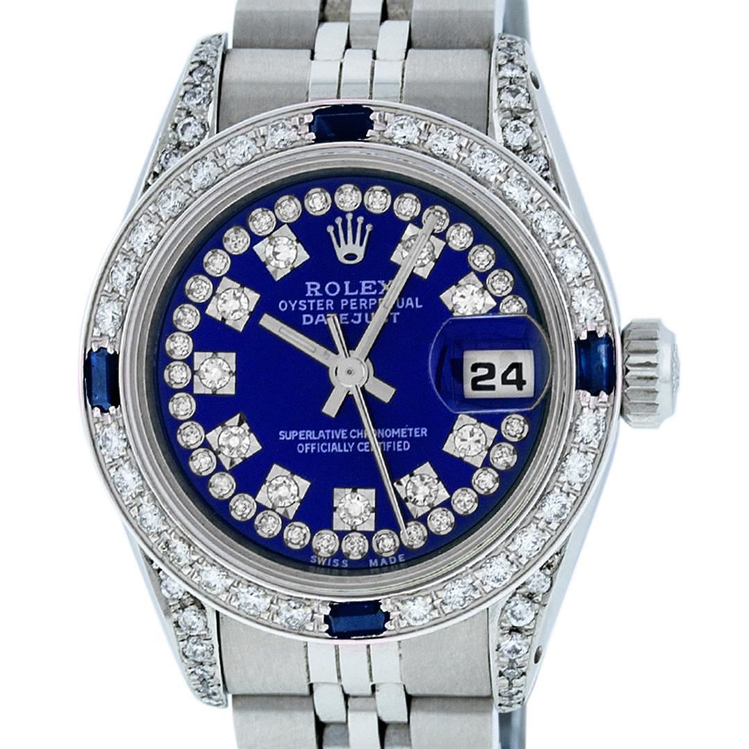 One Ladies Stainless Steel Rolex Datejust Polished Bright with Satin Finish, Serviced & Electronically Tested, Stainless Steel Case: 26mm, Stainless Steel Crown, Diamond Lugs: 24 Diamonds On Lugs, Clarity: SI-VS, Color: G to H. Custom Bezel: New 18K White Gold Sapphire Beadset Bezel, Diamond Count: 28 Diamonds + 4 Sapphires, Total Weight .70 Carat, Clarity: SI-VS, Color: G to H. Custom Crystal: New Scratch Resistant Synthetic Sapphire Cyclops Lens. Custom Hands: New Luminescent Hands. Movement: Automatic Winding Movement Caliber 2030. Custom Dial: Refinished Blue String Diamond Dial, 43 Diamonds in Dial G To H In Color, Clarity: VS. Date Window: 3 O'Clock Position Date Display, Model: Datejust  Condition: G-6 Extra Fine. Bracelet: Stainless Steel Jubilee Band. Bright Polish & Satin Finish. 6.0 Inch Length, Adjustable. Standard Clasp, With Rolex Logo. This Watch Has Been Serviced Time Tested And Is In Excellent Condition It Is Free Of All Scratches And Dents.
