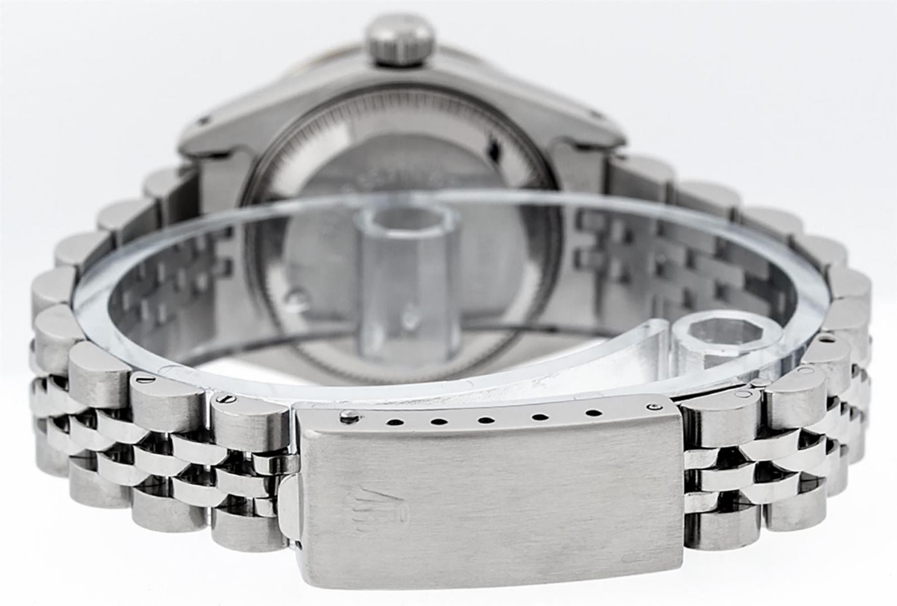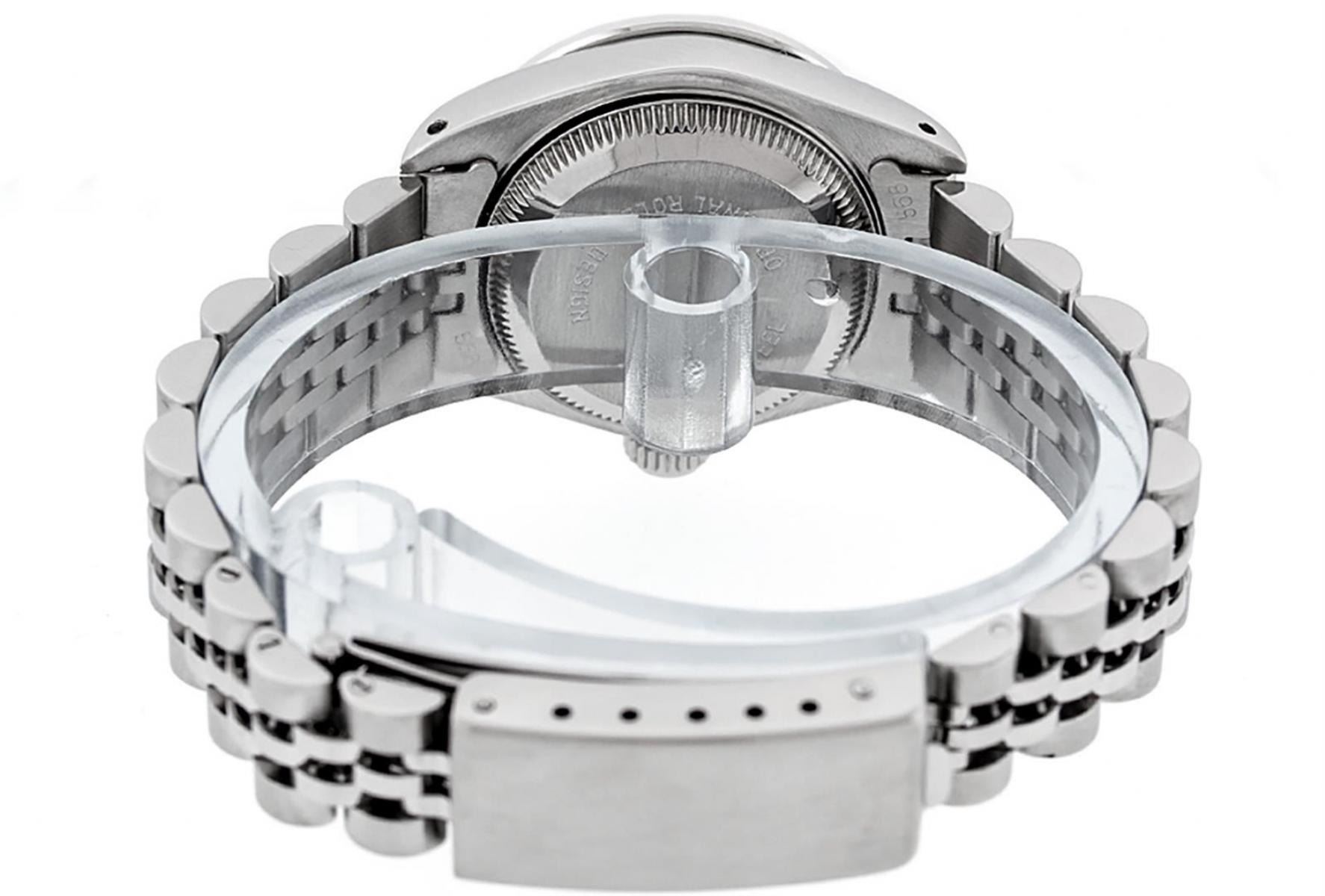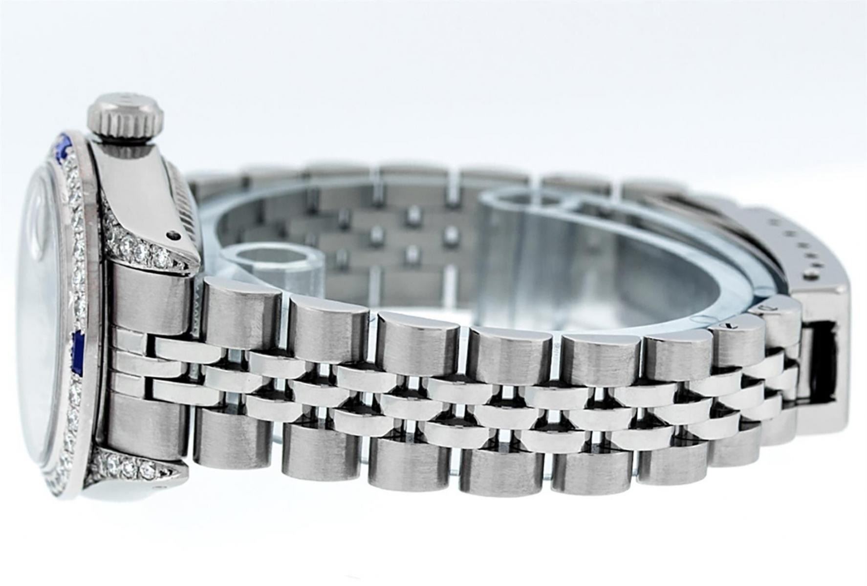 One Ladies Stainless Steel Rolex Datejust Polished Bright with Satin Finish, Serviced & Electronically Tested, Stainless Steel Case: 26mm, Stainless Steel Crown, Diamond Lugs: 24 Diamonds On Lugs, Clarity: SI-VS, Color: G to H. Custom Bezel: New 18K White Gold Sapphire Beadset Bezel, Diamond Count: 28 Diamonds + 4 Sapphires, Total Weight .70 Carat, Clarity: SI-VS, Color: G to H. Custom Crystal: New Scratch Resistant Synthetic Sapphire Cyclops Lens. Custom Hands: New Luminescent Hands. Movement: Automatic Winding Movement. Custom Dial: Refinished Blue String Diamond Dial, 43 Diamonds in Dial G To H In Color, Clarity: VS. Date Window: 3 O'Clock Position Date Display, Model: Datejust Condition: G-6 Extra Fine. Bracelet: Stainless Steel Jubilee Band. Bright Polish & Satin Finish. 6.0 Inch Length, Adjustable. Standard Clasp, With Rolex Logo. This Watch Has Been Serviced Time Tested And Is In Excellent Condition It Is Free Of All Scratches And Dents.