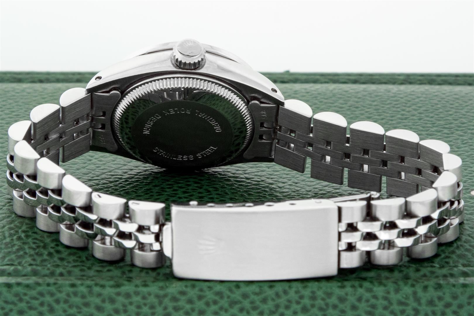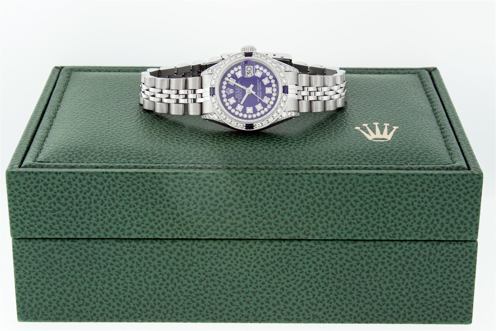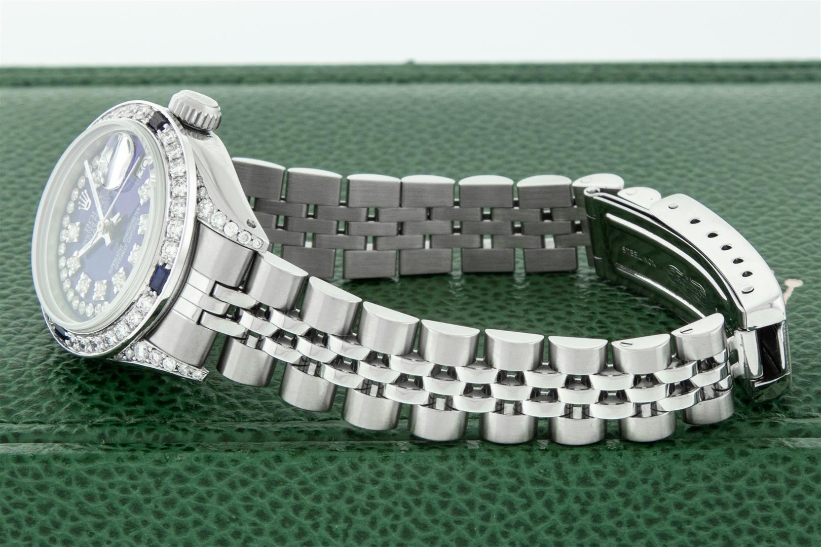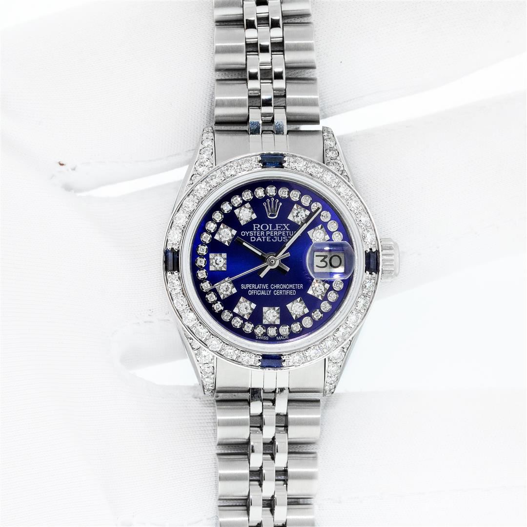 One Ladies Stainless Steel Rolex Datejust Polished Bright with Satin Finish, Serviced & Electronically Tested, Stainless Steel Case: 26mm, Stainless Steel Crown, Diamond Lugs: 24 Diamonds On Lugs, Clarity: SI-VS, Color: G to H. Custom Bezel: New 18K White Gold Sapphire Beadset Bezel, Diamond Count: 28 Diamonds + 4 Sapphires, Total Weight .70 Carat, Clarity: SI-VS, Color: G to H. Custom Crystal: New Scratch Resistant Synthetic Sapphire Cyclops Lens. Custom Hands: New Luminescent Hands. Movement: Automatic Winding Movement. Custom Dial: Refinished Blue String Diamond Dial, 43 Diamonds in Dial G To H In Color, Clarity: VS. Date Window: 3 O'Clock Position Date Display, Model: Datejust Condition: G-6 Extra Fine. Bracelet: Stainless Steel Jubilee Band. Bright Polish & Satin Finish. 6.0 Inch Length, Adjustable. Standard Clasp, With Rolex Logo. This Watch Has Been Serviced Time Tested And Is In Excellent Condition It Is Free Of All Scratches And Dents.