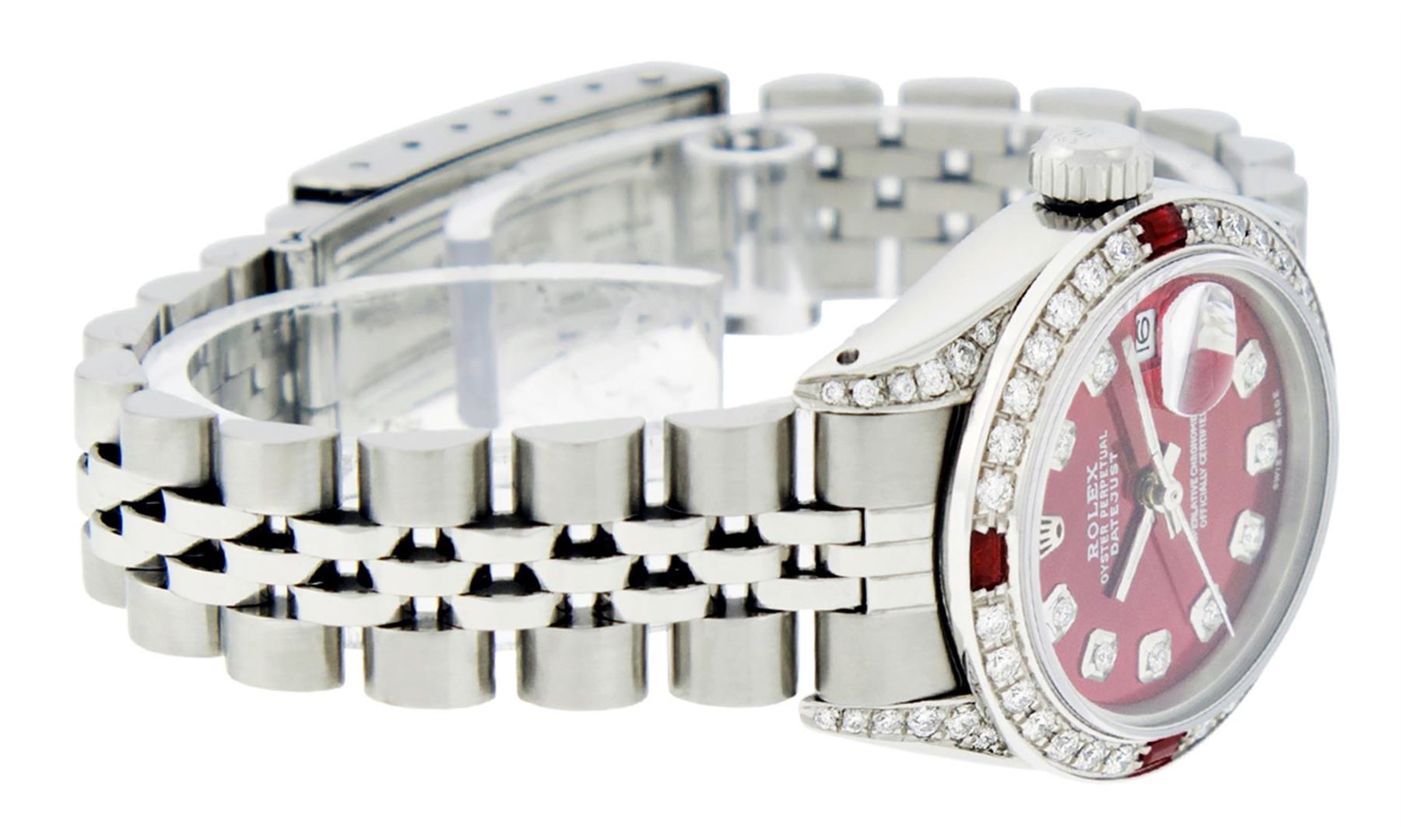 One Ladies Stainless Steel Rolex Datejust Polished Bright with Satin Finish, Serviced & Electronically Tested, Stainless Steel Case: 26mm, Stainless Steel Crown, Diamond Lugs: 24 Diamonds On Lugs, Clarity: SI-VS, Color: G to H. Custom Bezel: New 18K White Gold Diamond & Ruby Beadset Bezel, Diamond Count: 28 Diamonds + 4 Rubies, Total Weight .70 Carat, Clarity: SI-VS, Color: G to H. Custom Crystal: New Synthetic Sapphire Cyclops Lens. Custom Hands: New Luminescent Hands. Movement: Automatic Winding Movement Caliber 2030. Custom Dial: Refinished Red Diamond Dial, Diamond Count: 10 Diamonds in Dial, G To H In Color, Clarity: SI-VS. Date Window: 3 O'Clock Position Date Display, Model: Datejust Condition: G-6 Extra Fine. Bracelet: Stainless Steel Jubilee. Bright Polish & Satin Finish. 6.0 Inch Length, Adjustable. Standard Clasp, With Rolex Logo. This Watch Has Been Serviced Time Tested And Is In Excellent Condition It Is Free Of All Scratches And Dents.