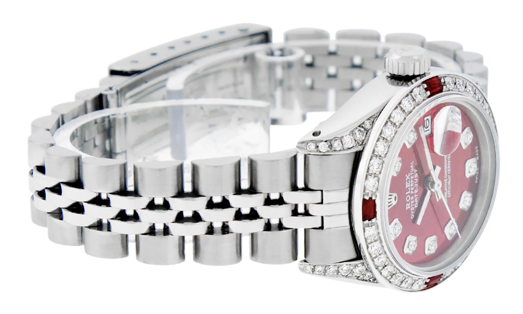 One Ladies Stainless Steel Rolex Datejust Polished Bright with Satin Finish, Serviced & Electronically Tested, Stainless Steel Case: 26mm, Stainless Steel Crown, Diamond Lugs: 24 Diamonds On Lugs, Clarity: SI-VS, Color: G to H. Custom Bezel: New 18K White Gold Diamond & Ruby Beadset Bezel, Diamond Count: 28 Diamonds + 4 Rubies, Total Weight .70 Carat, Clarity: SI-VS, Color: G to H. Custom Crystal: New Synthetic Sapphire Cyclops Lens. Custom Hands: New Luminescent Hands. Movement: Automatic Winding Movement Caliber 2030. Custom Dial: Refinished Red Diamond Dial, Diamond Count: 10 Diamonds in Dial, G To H In Color, Clarity: SI-VS. Date Window: 3 O'clock Position Date Display, Model: Datejust Condition: G-6 Extra Fine. Bracelet: Stainless Steel Jubilee. Bright Polish & Satin Finish. 6.0 Inch Length, Adjustable. Standard Clasp, With Rolex Logo. This Watch Has Been Serviced Time Tested And Is In Excellent Condition It Is Free Of All Scratches And Dents.