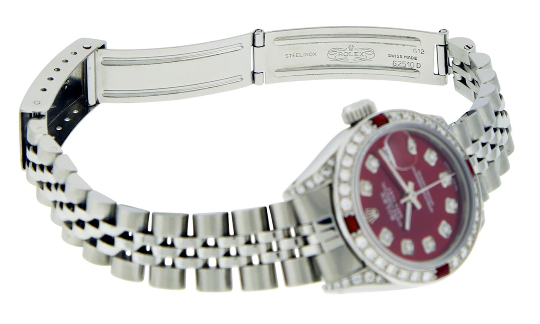 One Ladies Stainless Steel Rolex Datejust Polished Bright with Satin Finish, Serviced & Electronically Tested, Stainless Steel Case: 26mm, Stainless Steel Crown, Diamond Lugs: 24 Diamonds On Lugs, Clarity: SI-VS, Color: G to H. Custom Bezel: New 18K White Gold Diamond & Ruby Beadset Bezel, Diamond Count: 28 Diamonds + 4 Rubies, Total Weight .70 Carat, Clarity: SI-VS, Color: G to H. Custom Crystal: New Synthetic Sapphire Cyclops Lens. Custom Hands: New Luminescent Hands. Movement: Automatic Winding Movement Caliber 2030. Custom Dial: Refinished Red Diamond Dial, Diamond Count: 10 Diamonds in Dial, G To H In Color, Clarity: SI-VS. Date Window: 3 O'Clock Position Date Display, Model: Datejust Condition: G-6 Extra Fine. Bracelet: Stainless Steel Jubilee. Bright Polish & Satin Finish. 6.0 Inch Length, Adjustable. Standard Clasp, With Rolex Logo. This Watch Has Been Serviced Time Tested And Is In Excellent Condition It Is Free Of All Scratches And Dents.