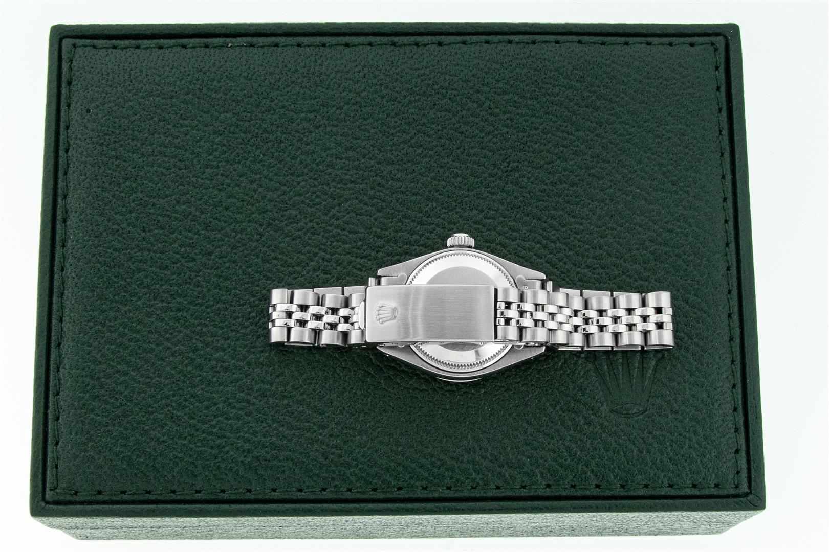 One Ladies Stainless Steel Rolex Datejust Polished Bright with Satin Finish, Serviced & Electronically Tested, Stainless Steel Case: 26mm, Stainless Steel Crown, Diamond Lugs: 24 Diamonds On Lugs, Clarity: SI-VS, Color: G to H. Custom Bezel: New 18K White Gold Diamond & Ruby Beadset Bezel, Diamond Count: 28 Diamonds + 4 Rubies, Total Weight .70 Carat, Clarity: SI-VS, Color: G to H. Custom Crystal: New Scratch Resistant Synthetic Sapphire Cyclops Lens. Custom Hands: New Luminescent Hands. Movement: Automatic Winding Movement. Custom Dial: Refinished Red Diamond Dial, Diamond Count: 10 Diamonds in Dial, G To H In Color, Clarity: SI-VS. Date Window: 3 O'Clock Position Date Display, Model: Datejust Condition: G-6 Extra Fine. Bracelet: Stainless Steel Jubilee. Bright Polish & Satin Finish. 6.0 Inch Length, Adjustable. Standard Clasp, With Rolex Logo. This Watch Has Been Serviced Time Tested And Is In Excellent Condition It Is Free Of All Scratches And Dents. This watch comes with a Rolex Box.