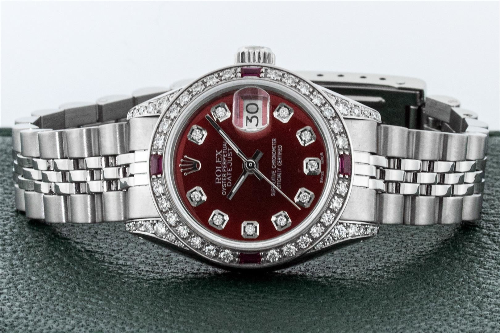 One Ladies Stainless Steel Rolex Datejust Polished Bright with Satin Finish, Serviced & Electronically Tested, Stainless Steel Case: 26mm, Stainless Steel Crown, Diamond Lugs: 24 Diamonds On Lugs, Clarity: SI-VS, Color: G to H. Custom Bezel: New 18K White Gold Diamond & Ruby Beadset Bezel, Diamond Count: 28 Diamonds + 4 Rubies, Clarity: SI-VS, Color: G to H. Custom Crystal: New Sapphire with Date Window. Custom Hands: New Luminescent Hands. Rolex Movement: Automatic Winding Movement. Custom Dial: Refinished To Red with Added Diamonds, Diamond Count: 10 Diamonds in Dial, G To H In Color, Clarity: SI-VS. Date Window: 3 O'Clock Position Date Display, Model: Datejust Condition: G-6 Extra Fine. Rolex Bracelet: Stainless Steel Jubilee. Bright Polish & Satin Finish. 6.0 Inch Length, Adjustable. Standard Clasp, with Rolex Logo. This Watch Has Been Serviced Time Tested And Is In Excellent Condition It Is Free Of All Scratches And Dents.