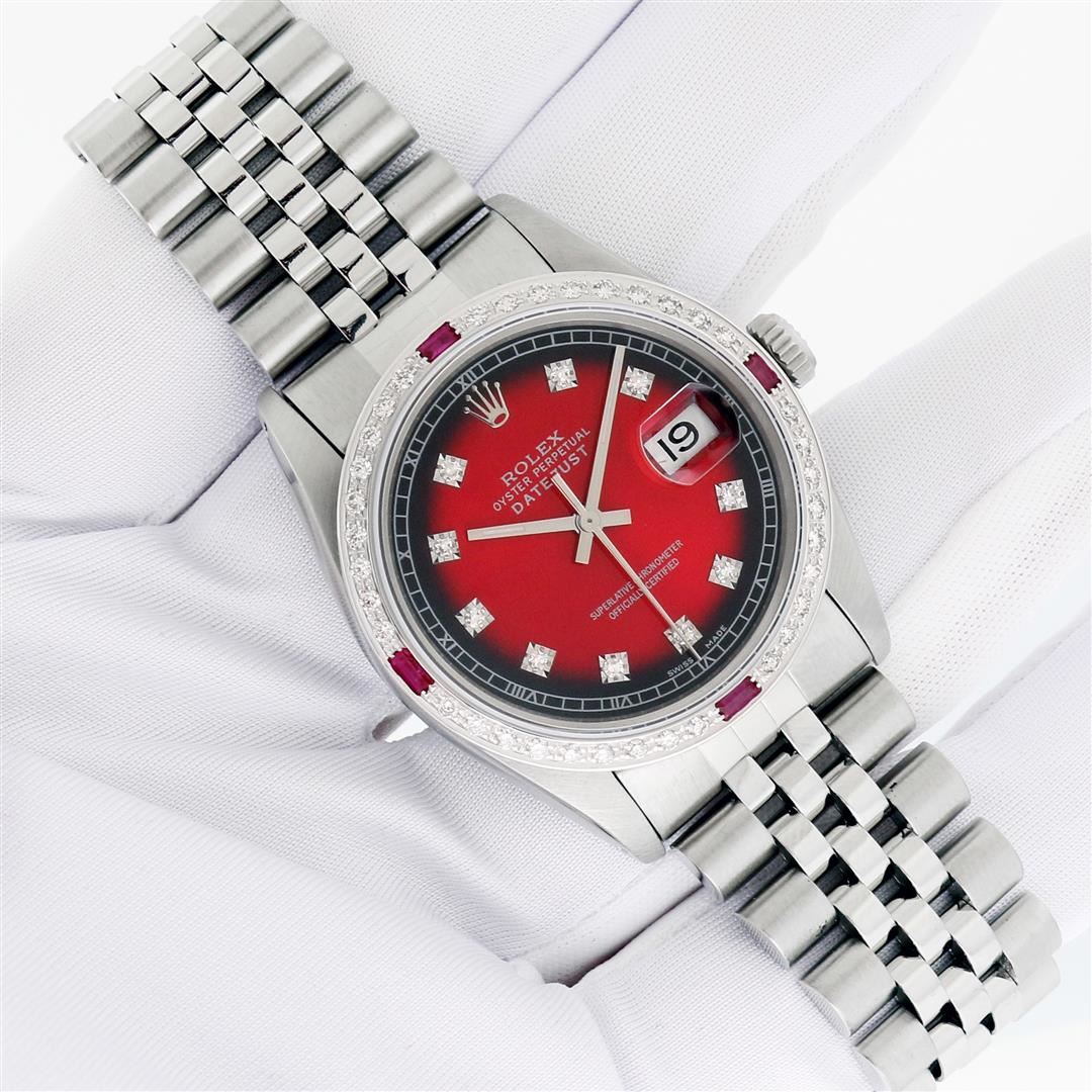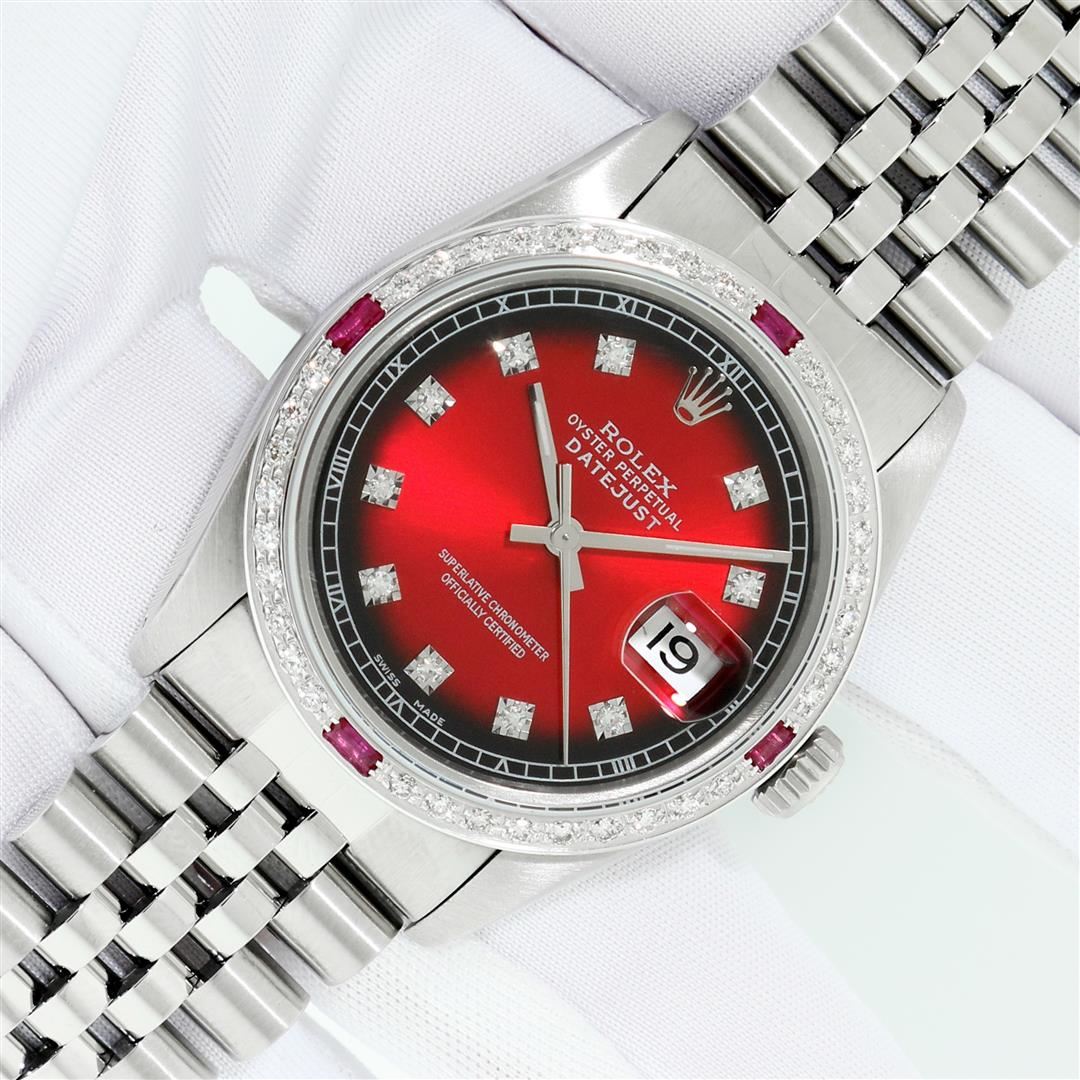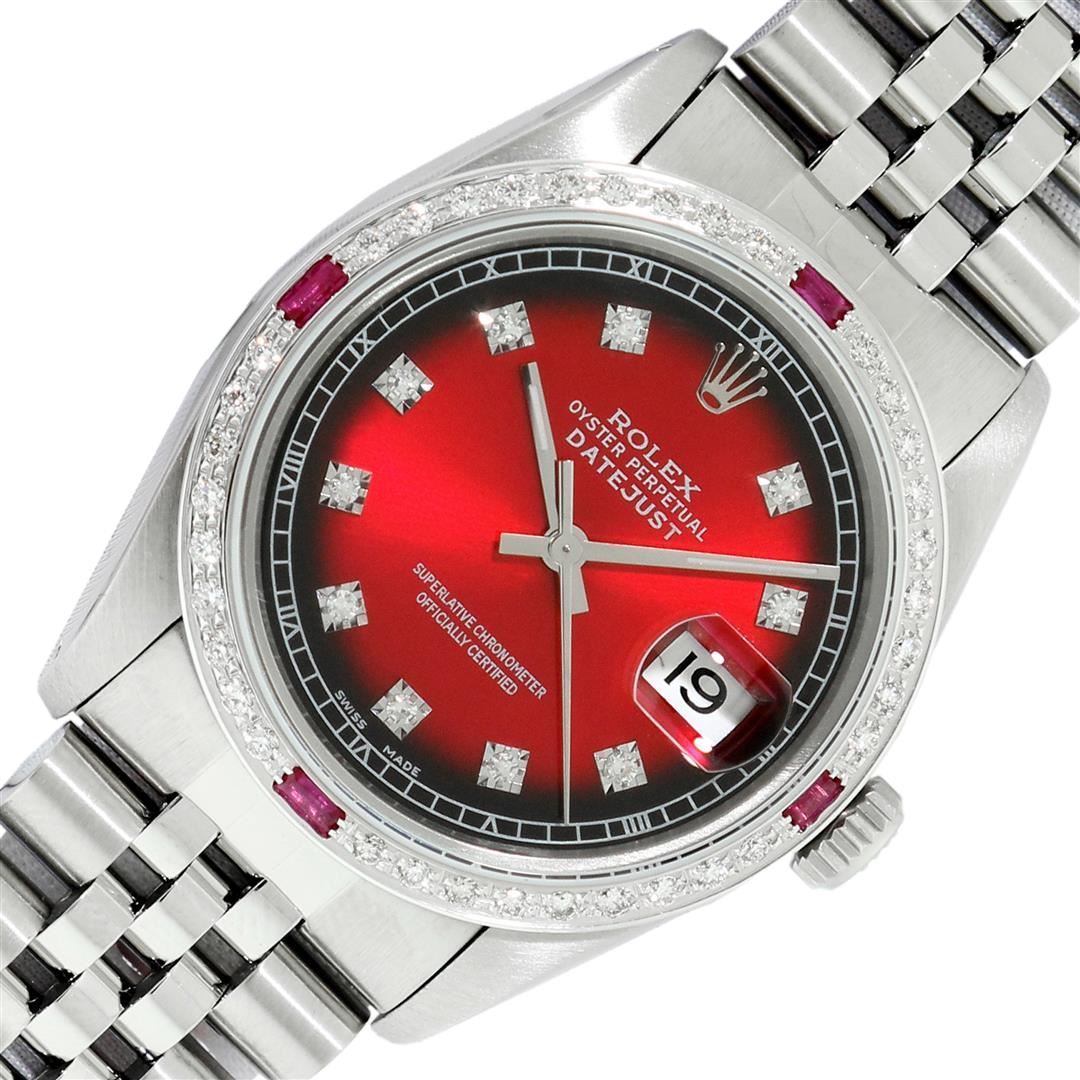One Men's Rolex Datejust Polished Bright with Satin Finish, This Watch Has Been Serviced & Electronically Tested, Rolex Stainless Steel Case: 36mm, Rolex Stainless Steel Crown, Custom Bezel: New 18K White Gold Ruby Beadset Diamond Bezel, Diamond + Gem Count: 36 Diamonds + 4 Rubies, Clarity: SI-VS, Color: G to H. Custom Crystal: New Sapphire with Date Window. Custom Hands: New Luminescent Hands. Rolex Movement: Automatic Winding Movement. Custom Dial: Refinished To Red Vignette with Added Diamond Hour Markers, Diamond Count: 10 Diamonds in Dial, Diamond Color: G To H In Color, Clarity: SI-VS. Date Window: 3 O'Clock Position Date Display, Quickset, Model: Datejust, Condition: G-6 Extra Fine. Rolex Bracelet: Stainless Steel Jubilee Band. Bracelet: 7.0 Inch Length, Adjustable. Standard Clasp, with Rolex Logo. This Pre Owned Watch Has Been Serviced Time Tested And Is In Excellent Condition It Is Free Of All Scratches And Dents.