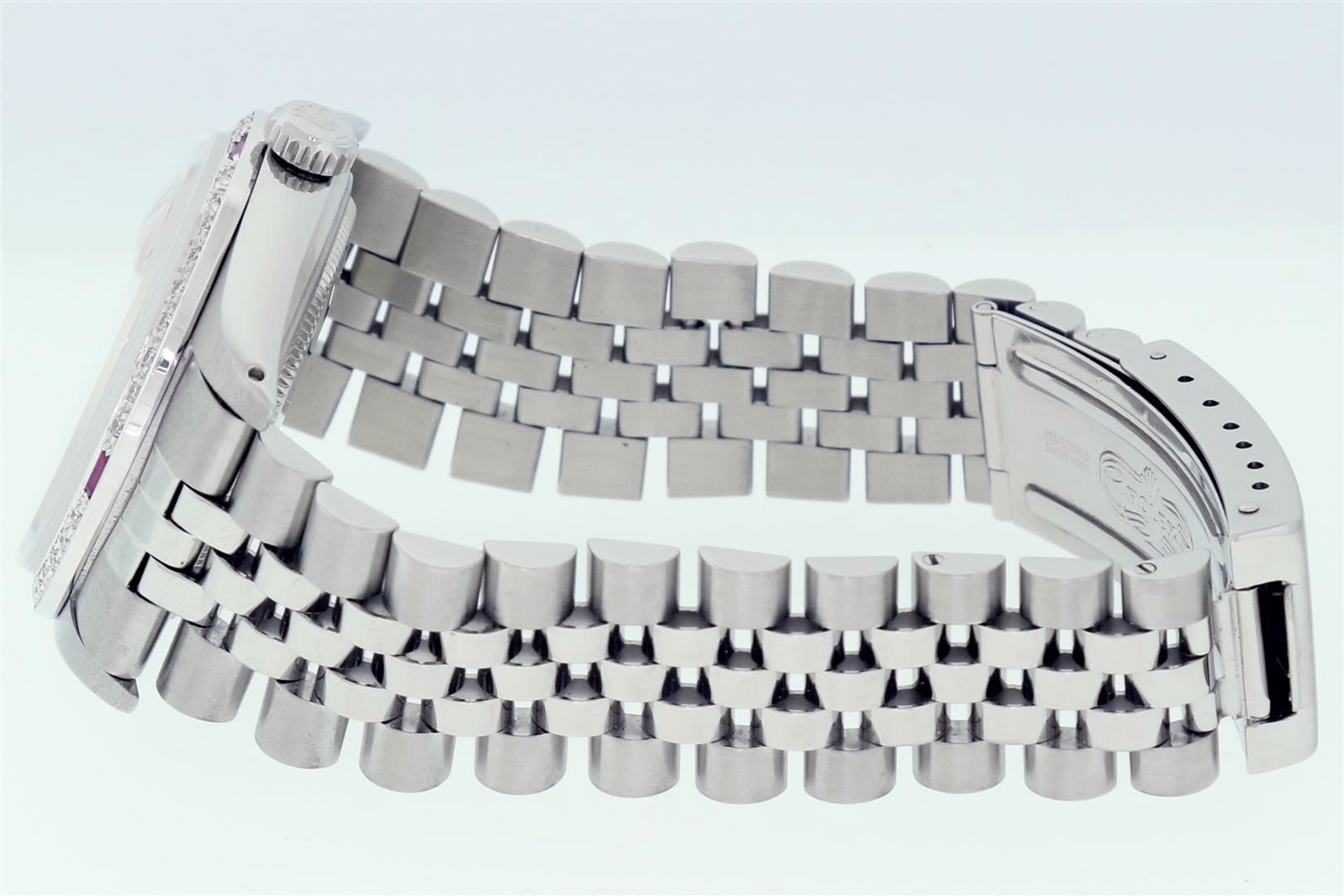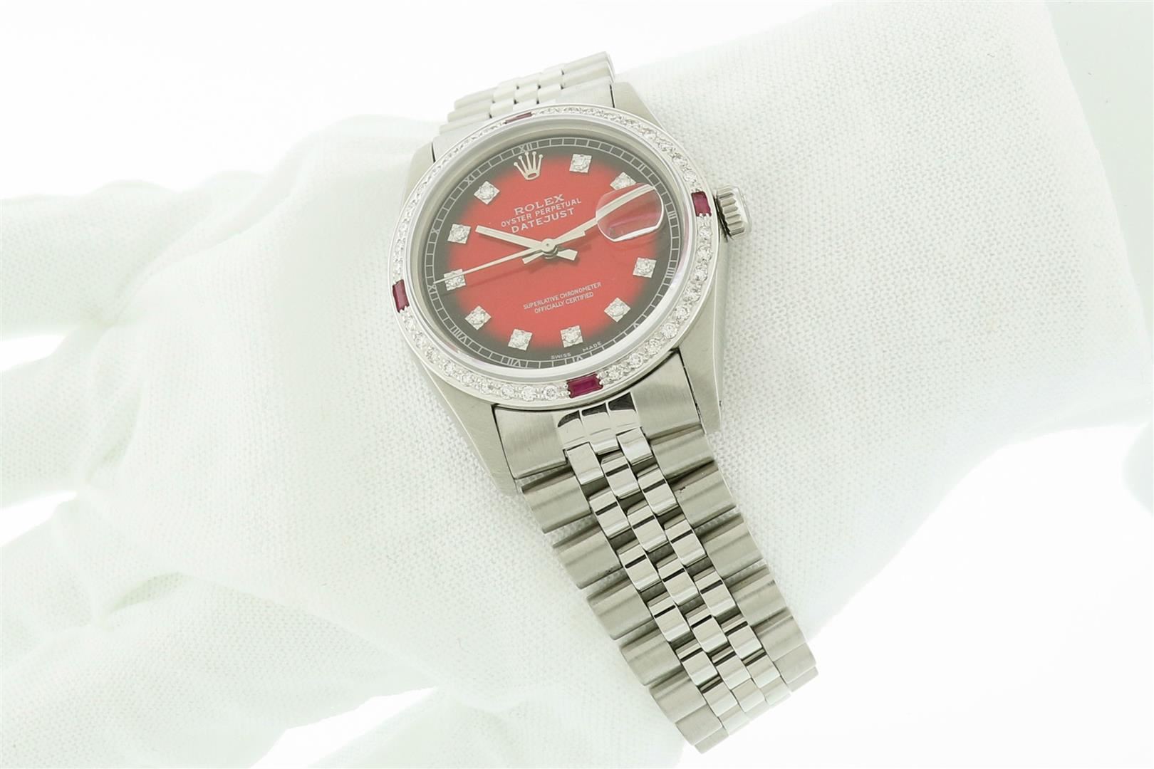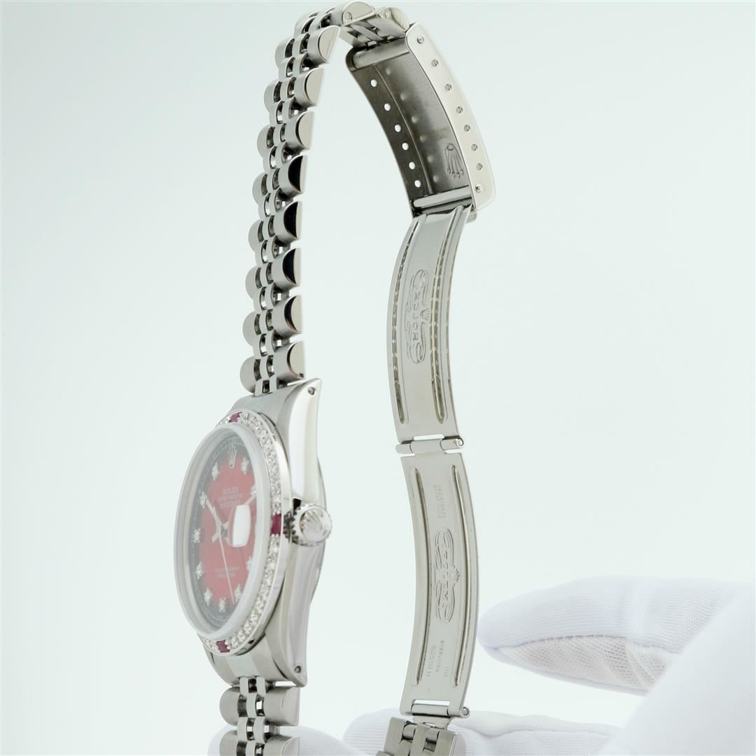 One Men's Rolex Datejust Polished Bright with Satin Finish, This Watch Has Been Serviced & Electronically Tested, Rolex Stainless Steel Case: 36mm, Rolex Stainless Steel Crown, Custom Bezel: New 18K White Gold Ruby Beadset Diamond Bezel, Diamond + Gem Count: 36 Diamonds + 4 Rubies, Clarity: SI-VS, Color: G to H. Custom Crystal: New Sapphire with Date Window. Custom Hands: New Luminescent Hands. Rolex Movement: Automatic Winding Movement. Custom Dial: Refinished To Red Vignette with Added Diamond Hour Markers, Diamond Count: 10 Diamonds in Dial, Diamond Color: G To H In Color, Clarity: SI-VS. Date Window: 3 O'Clock Position Date Display, Quickset, Model: Datejust, Condition: G-6 Extra Fine. Rolex Bracelet: Stainless Steel Jubilee Band. Bracelet: 7.0 Inch Length, Adjustable. Standard Clasp, with Rolex Logo. This Pre Owned Watch Has Been Serviced Time Tested And Is In Excellent Condition It Is Free Of All Scratches And Dents.