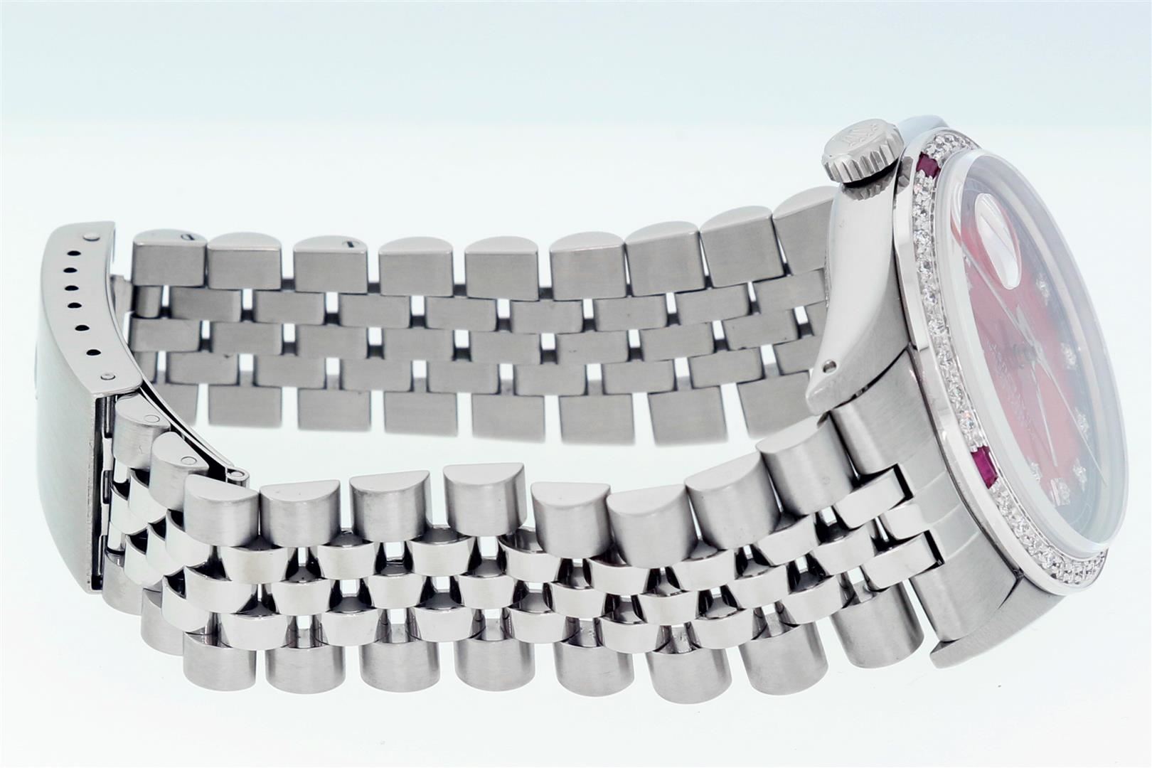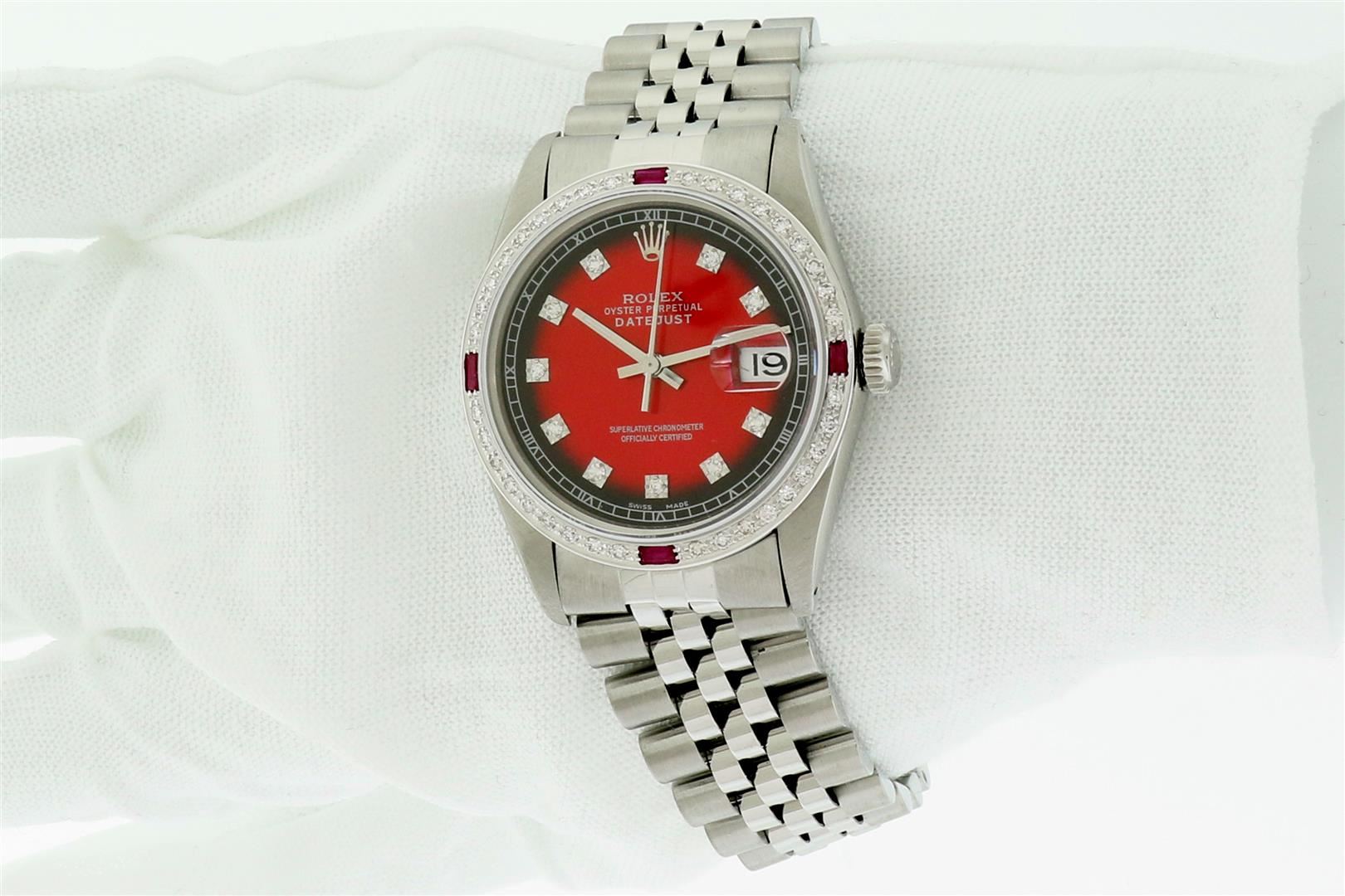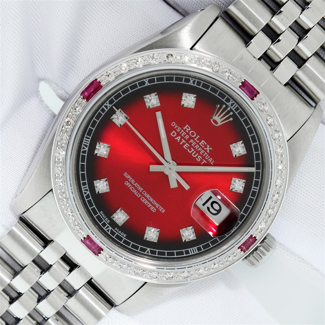 One Men's Rolex Datejust Polished Bright with Satin Finish, This Watch Has Been Serviced & Electronically Tested, Rolex Stainless Steel Case: 36mm, Rolex Stainless Steel Crown, Custom Bezel: New 18K White Gold Ruby Beadset Diamond Bezel, Diamond + Gem Count: 36 Diamonds + 4 Rubies, Clarity: SI-VS, Color: G to H. Custom Crystal: New Sapphire with Date Window. Custom Hands: New Luminescent Hands. Rolex Movement: Automatic Winding Movement. Custom Dial: Refinished To Red Vignette with Added Diamond Hour Markers, Diamond Count: 10 Diamonds in Dial, Diamond Color: G To H In Color, Clarity: SI-VS. Date Window: 3 O'Clock Position Date Display, Quickset, Model: Datejust, Condition: G-6 Extra Fine. Rolex Bracelet: Stainless Steel Jubilee Band. Bracelet: 7.0 Inch Length, Adjustable. Standard Clasp, with Rolex Logo. This Pre Owned Watch Has Been Serviced Time Tested And Is In Excellent Condition It Is Free Of All Scratches And Dents.