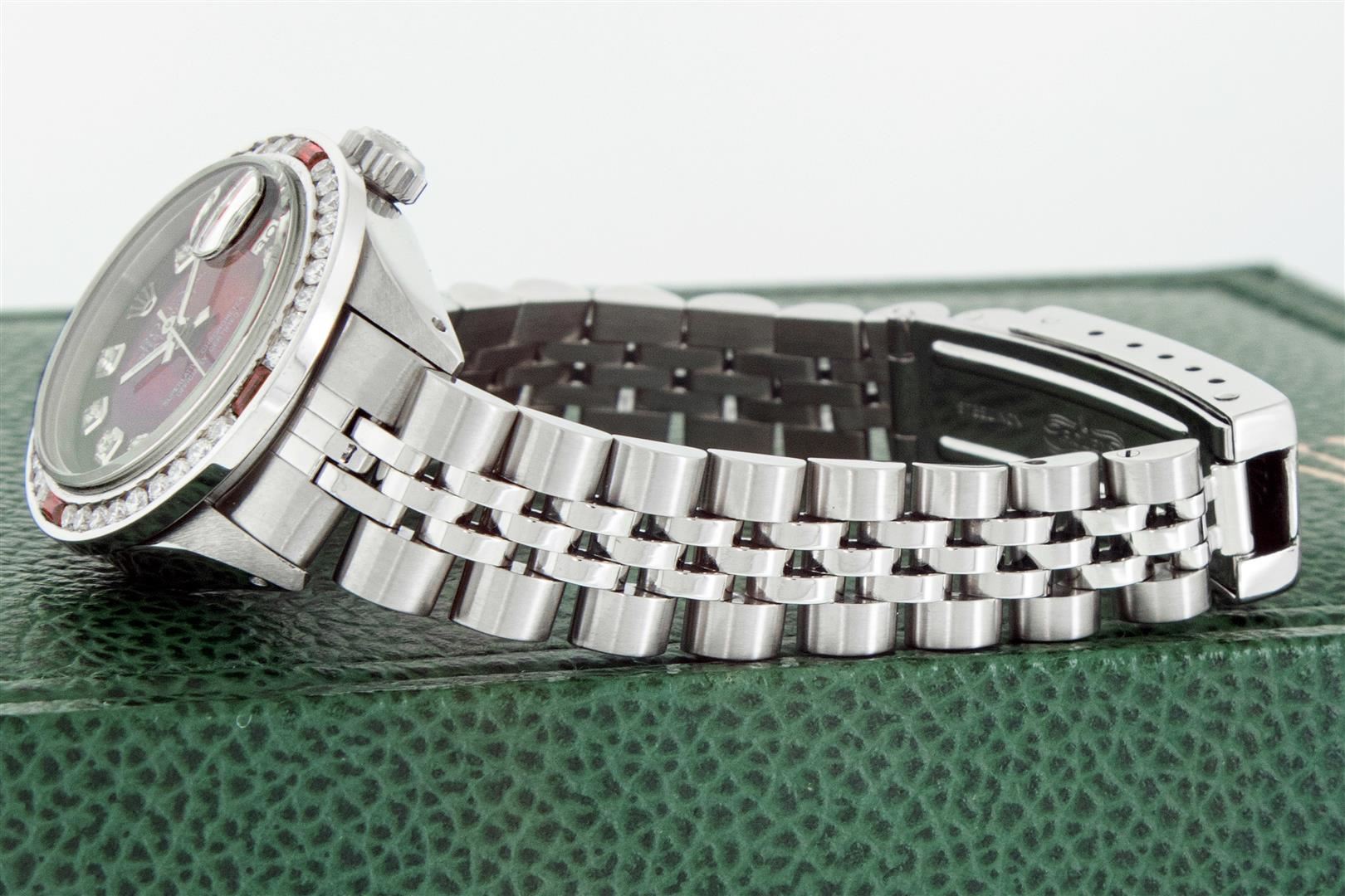 One Ladies Stainless Steel Rolex Datejust Polished Bright with Satin Finish, Serviced & Electronically Tested, Stainless Steel Case: 26mm, Stainless Steel Crown, Custom Bezel: New 18K White Gold Ruby Channel Set Diamond Bezel, Diamond + Gem Count: 36 Diamonds + 4 Rubies Clarity: SI-VS, Color: G to H. Custom Crystal: New Sapphire with Magnified Date Window. Custom Hands: New Luminescent Hands. Rolex Movement: Automatic Winding Movement. Custom Dial: Refinished To Red Vignette with Custom Added Diamond Hour Markers. Date Window: 3 O'Clock Position Date Display, Model: Datejust. Condition: G-6 Extra Fine. Rolex Bracelet: Stainless Steel Jubilee. Bright Polish & Satin Finish. 6.0 Inch Length, Adjustable. Standard Clasp, with Rolex Logo. This Watch Has Been Serviced Time Tested And Is In Excellent Condition It Is Free Of All Scratches And Dents. This Watch Comes with A Rolex Box.