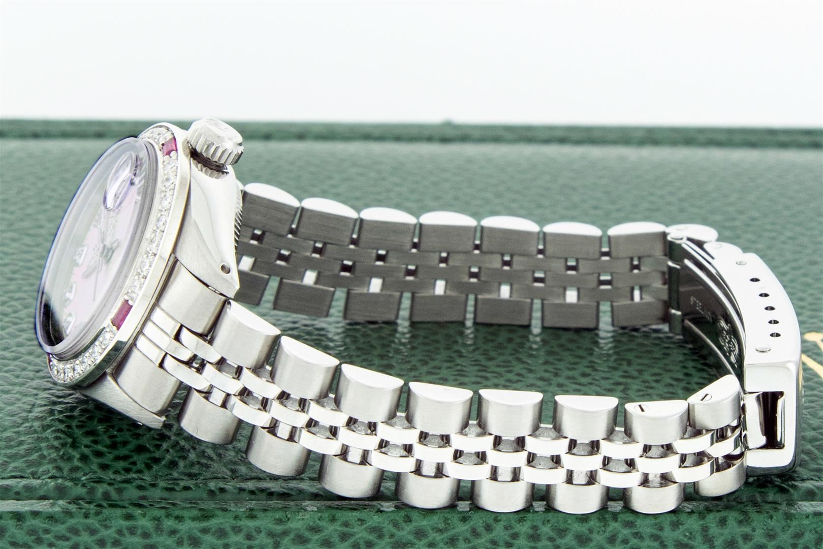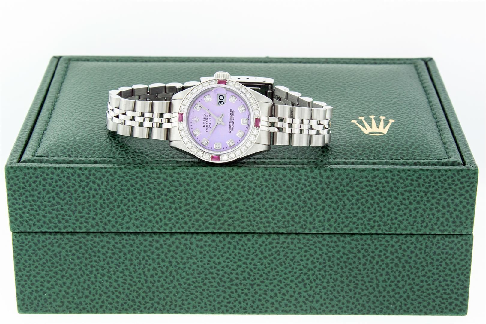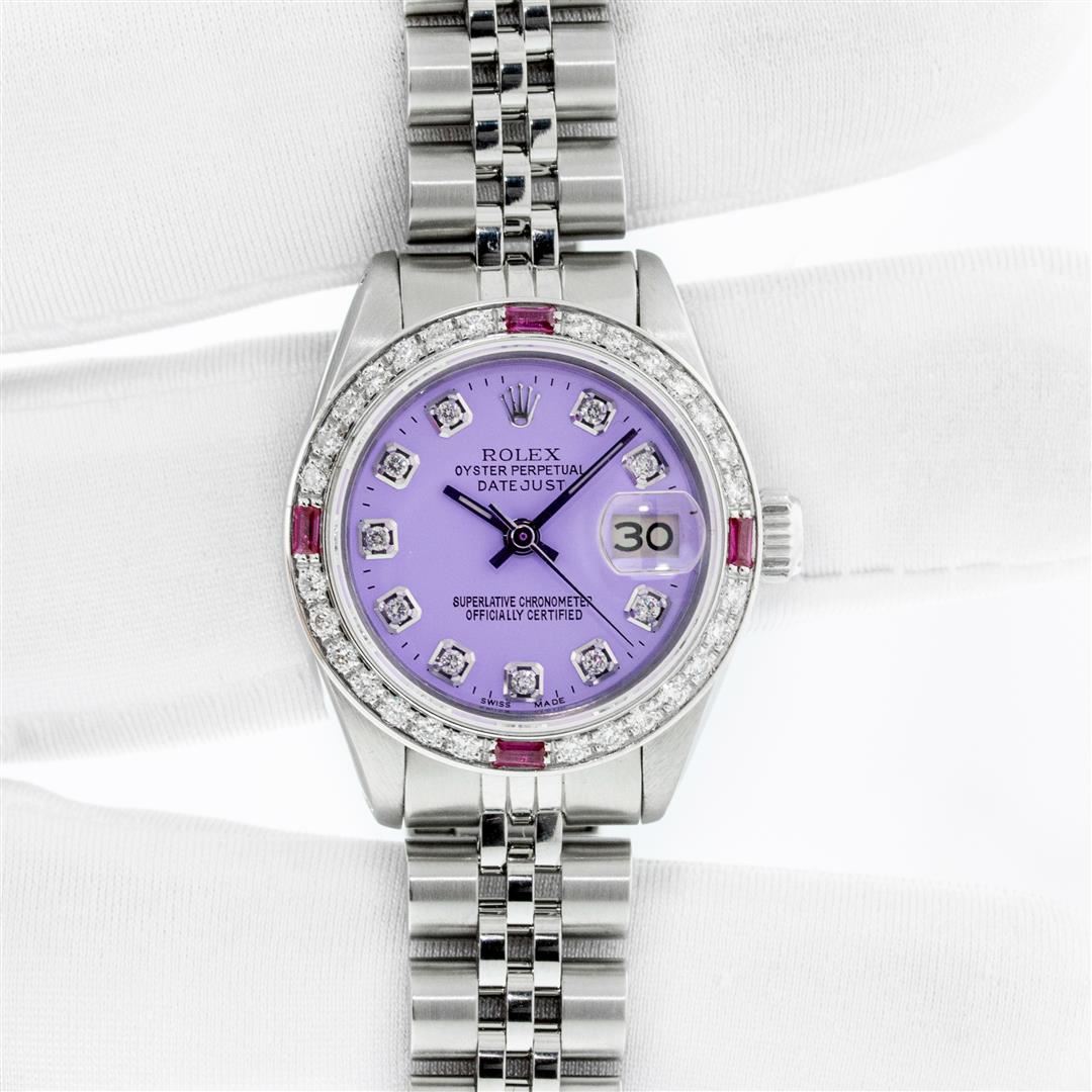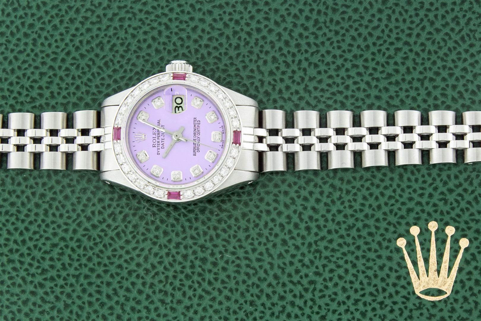 One Ladies Stainless Steel Rolex Datejust Polished Bright with Satin Finish, Serviced & Electronically Tested, Rolex Stainless Steel Case: 26mm, Rolex Stainless Steel Crown, Custom Bezel: New 18K White Gold Ruby Beadset Diamond Bezel, Diamond + Gem Count: 28 Diamonds + 4 Rubies. Clarity: SI-VS, Color: G to H. Custom Crystal: New Sapphire with Magnified Date Window. Custom Hands: New Luminescent Hands. Rolex Movement: Automatic Winding Movement. Custom Dial: Refinished To Purple with Custom Added Diamonds, 10 Diamonds in Dial, G To H In Color, Clarity: SI-VS. Date Window: 3 O'Clock Position Date Display, Model: Datejust. Condition: G-6 Extra Fine. Rolex Bracelet: Stainless Steel Jubilee Band. Bright Polish & Satin Finish. 6.0 Inch Length, Adjustable. Standard Clasp, with Rolex Logo. This Pre Owned Watch Has Been Serviced Time Tested And Is In Excellent Condition It Is Free Of All Scratches And Dents. This Watch Comes with A Rolex Box.