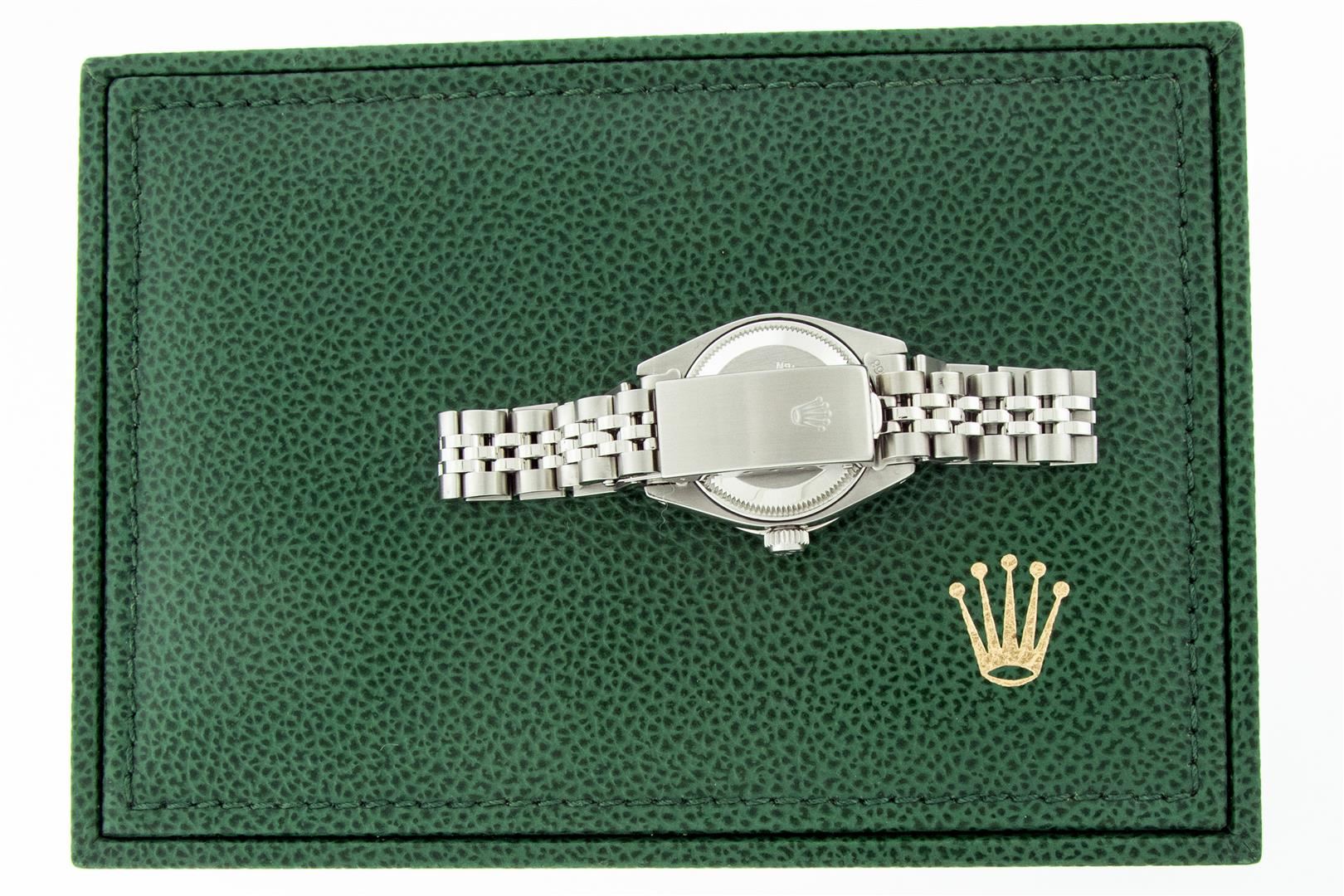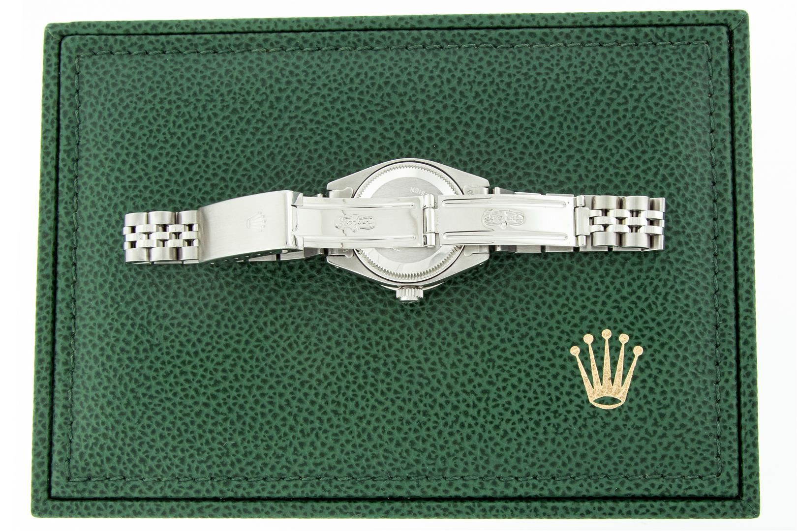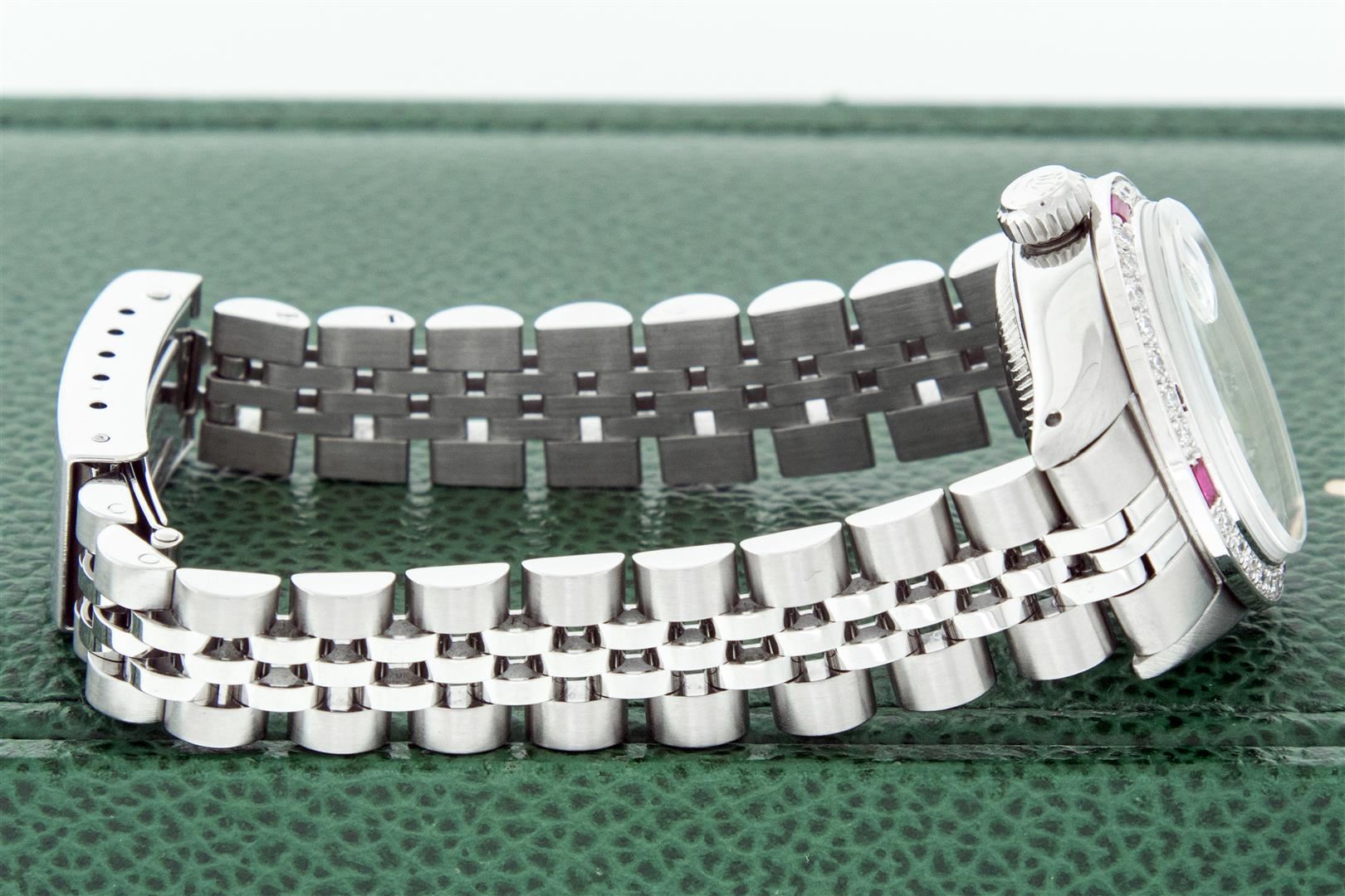 One Ladies Stainless Steel Rolex Datejust Polished Bright with Satin Finish, Serviced & Electronically Tested, Rolex Stainless Steel Case: 26mm, Rolex Stainless Steel Crown, Custom Bezel: New 18K White Gold Ruby Beadset Diamond Bezel, Diamond + Gem Count: 28 Diamonds + 4 Rubies. Clarity: SI-VS, Color: G to H. Custom Crystal: New Sapphire with Magnified Date Window. Custom Hands: New Luminescent Hands. Rolex Movement: Automatic Winding Movement. Custom Dial: Refinished To Purple with Custom Added Diamonds, 10 Diamonds in Dial, G To H In Color, Clarity: SI-VS. Date Window: 3 O'Clock Position Date Display, Model: Datejust. Condition: G-6 Extra Fine. Rolex Bracelet: Stainless Steel Jubilee Band. Bright Polish & Satin Finish. 6.0 Inch Length, Adjustable. Standard Clasp, with Rolex Logo. This Pre Owned Watch Has Been Serviced Time Tested And Is In Excellent Condition It Is Free Of All Scratches And Dents. This Watch Comes with A Rolex Box.