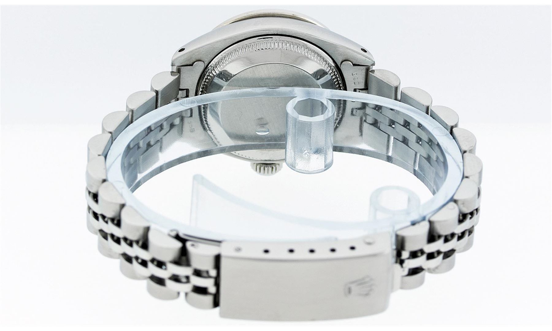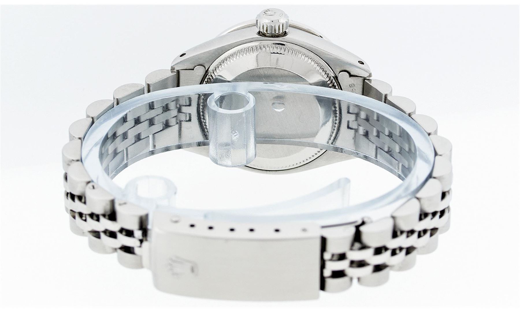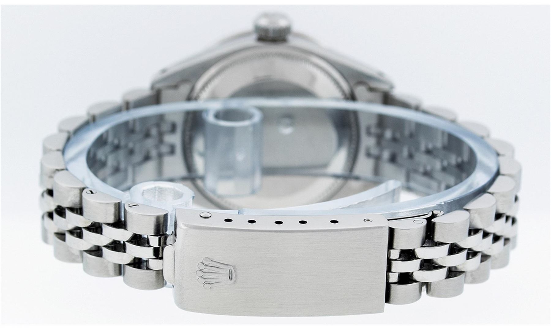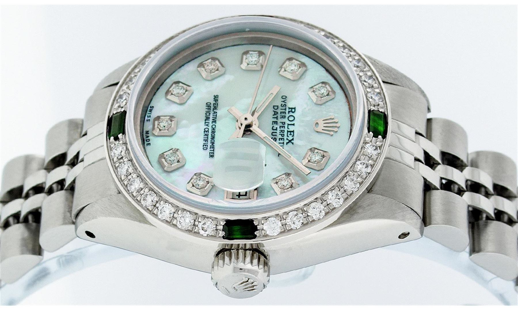 Ladies Rolex Datejust Polished Bright with Satin Finish, Serviced & Electronically Tested, Stainless Steel Case:26mm, Stainless Steel Crown, Custom Bezel: 18K White Gold Emerald Beadset Diamond Bezel, Diamond + Gem Count: 28 Diamonds + 4 Emeralds. Total Weight .70 Carat, Clarity: SI-VS, Color: G to H. Custom Crystal: Synthetic Sapphire Cyclops Lens. Movement: Automatic Winding Movement Caliber 2030. Custom Dial: Refinished Blue MOP With Diamond Hour Markers. Diamond Count: 10 Diamonds, Color: G To H, Clarity: SI-VS. Date Window: 3 O'Clock Position Date Display, Model: Datejust. Condition: G-6 Extra Fine. Bracelet: Stainless Steel Jubilee. Bright Polish & Satin Finish. 6.0 Inch Length, Adjustable. Standard Clasp, With Rolex Logo.