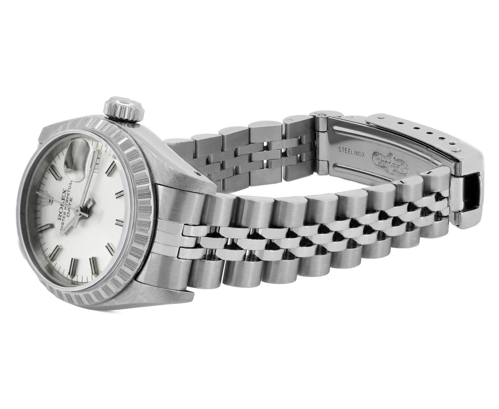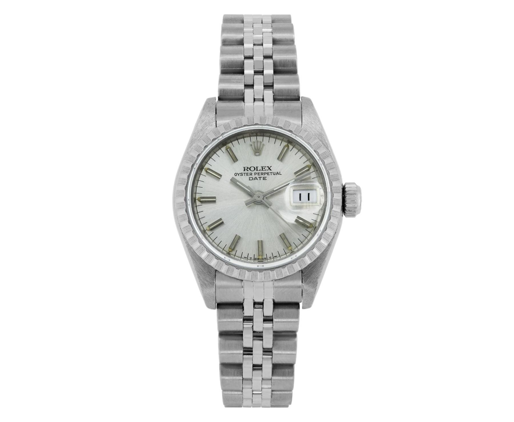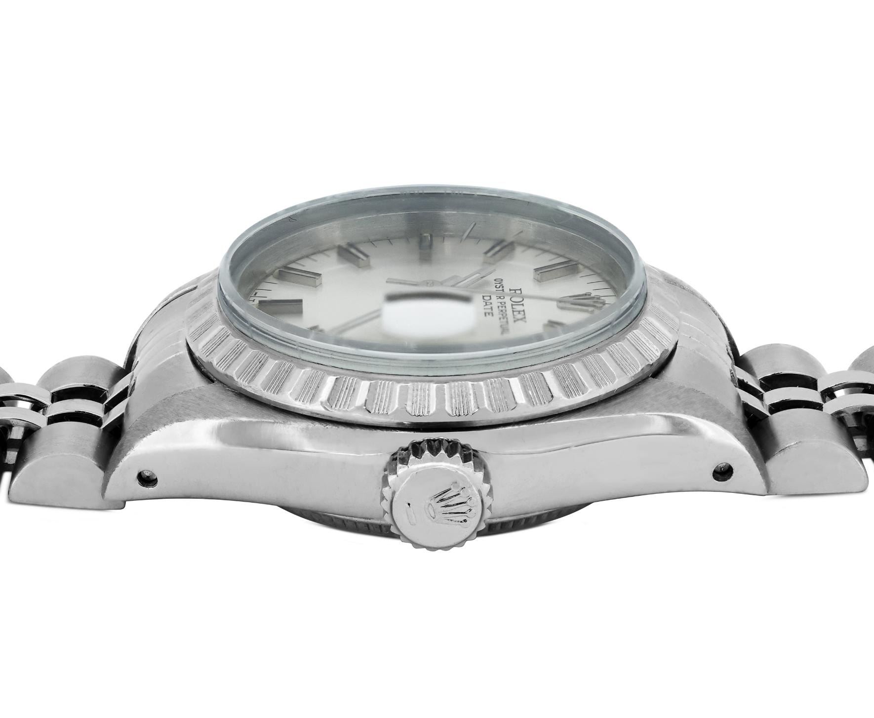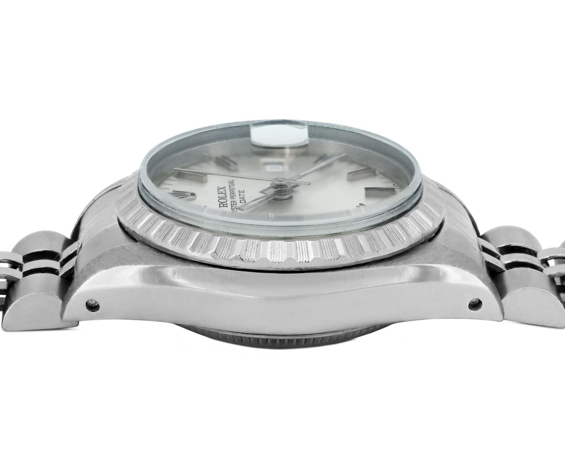 This Lady Rolex Date watch features a silver dial with index hour markers and a custom plastic crystal, with a magnified date window. The timepiece has Rolex stainless steel engine turn bezel. The Rolex 26mm case is crafted from stainless steel and includes a Rolex screw-down crown. The bracelet is a Rolex stainless steel Jubilee band, designed to fit wrists up to 6 inches in circumference. The Watch Is Powered by the Rolex automatic self-winding Caliber 2035 movement. This watch has been polished and serviced and is in excellent condition. It will also be time tested before shipment.
