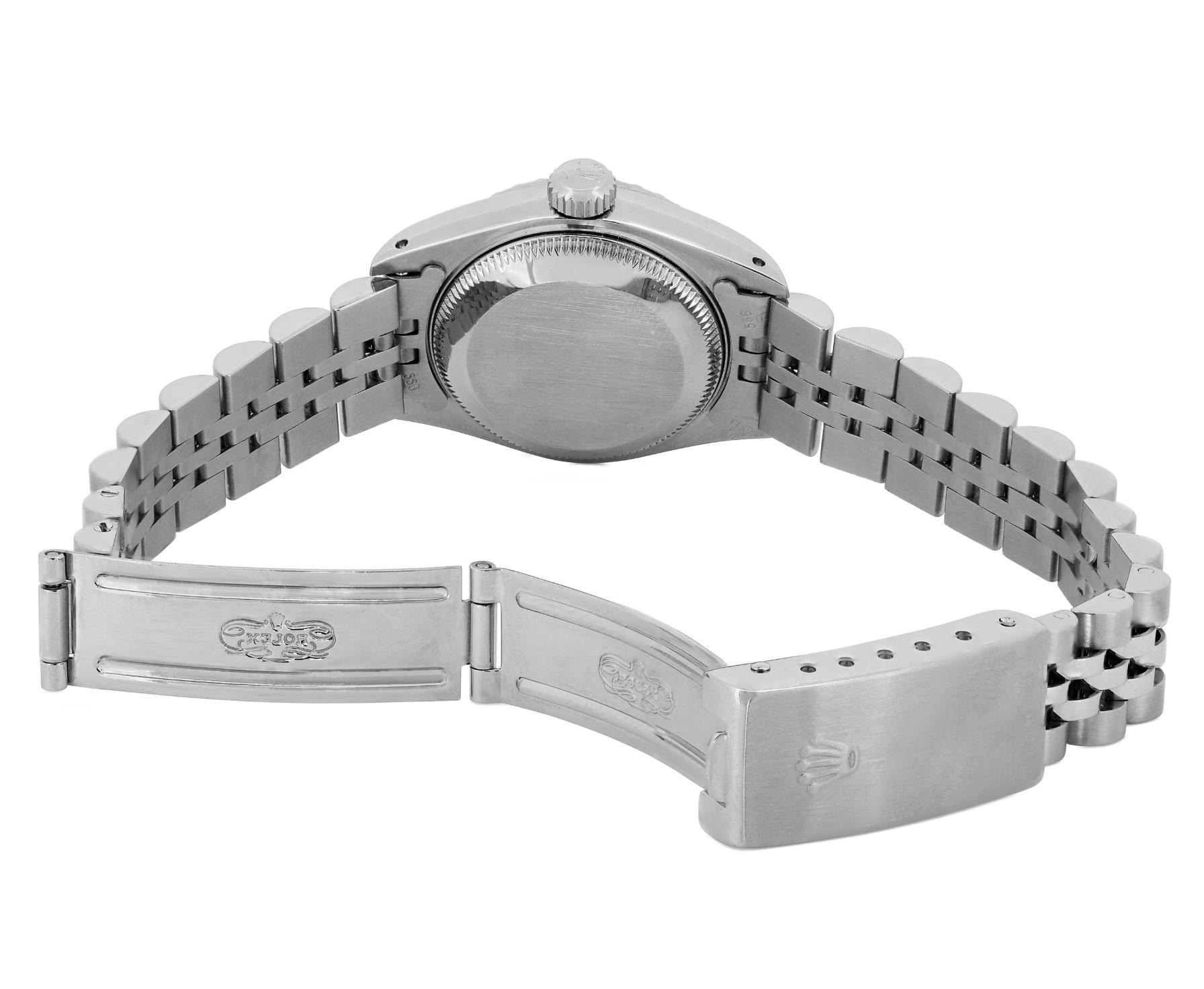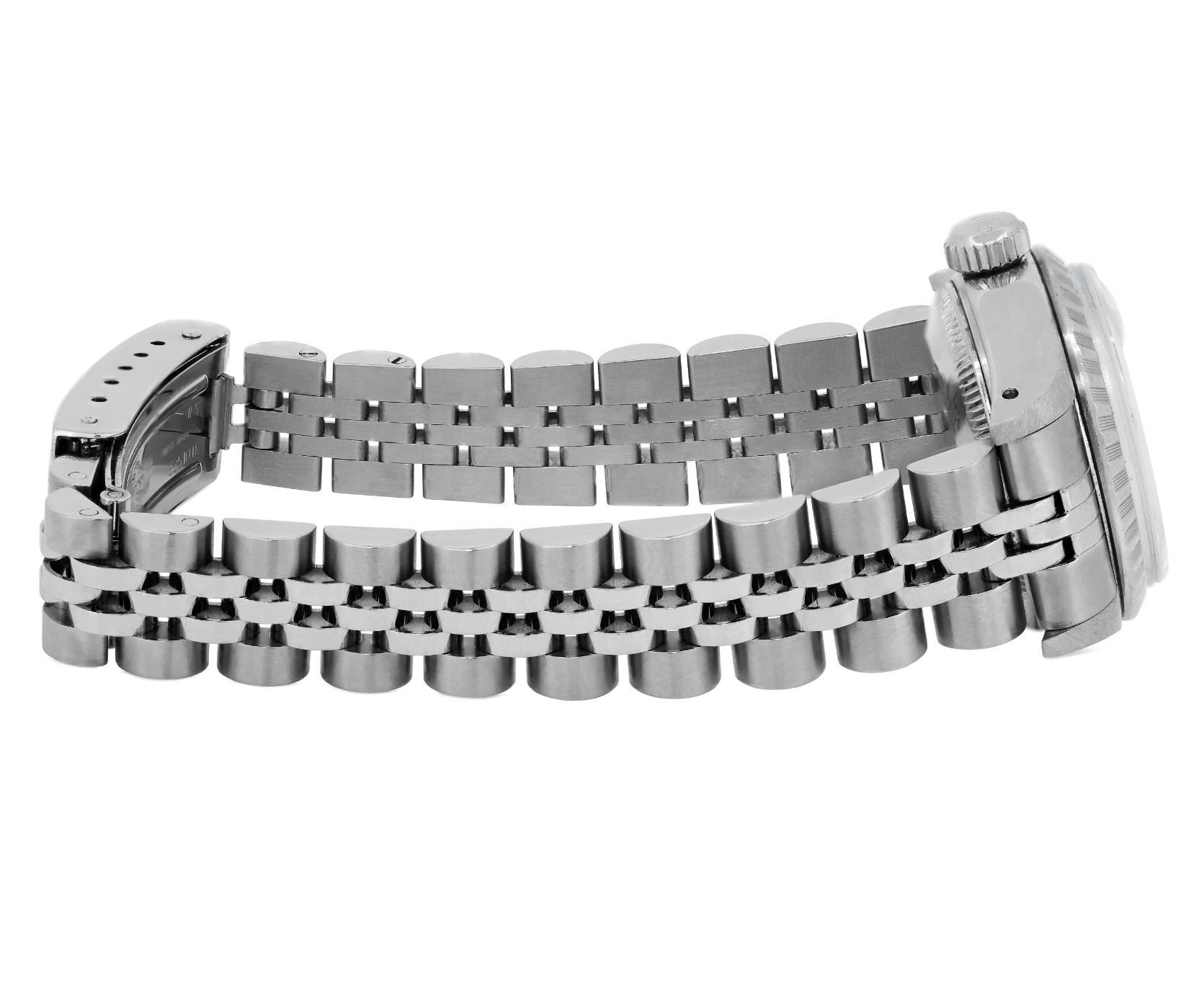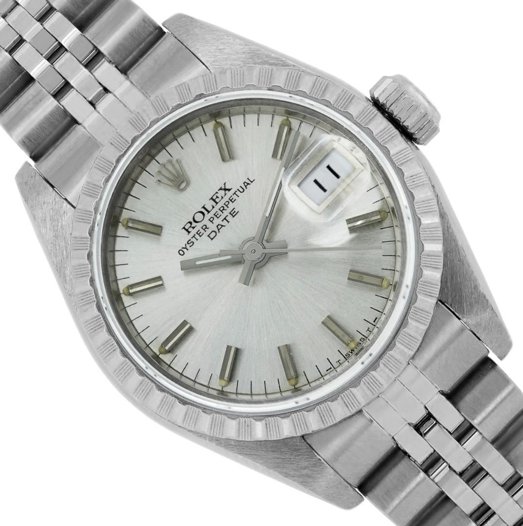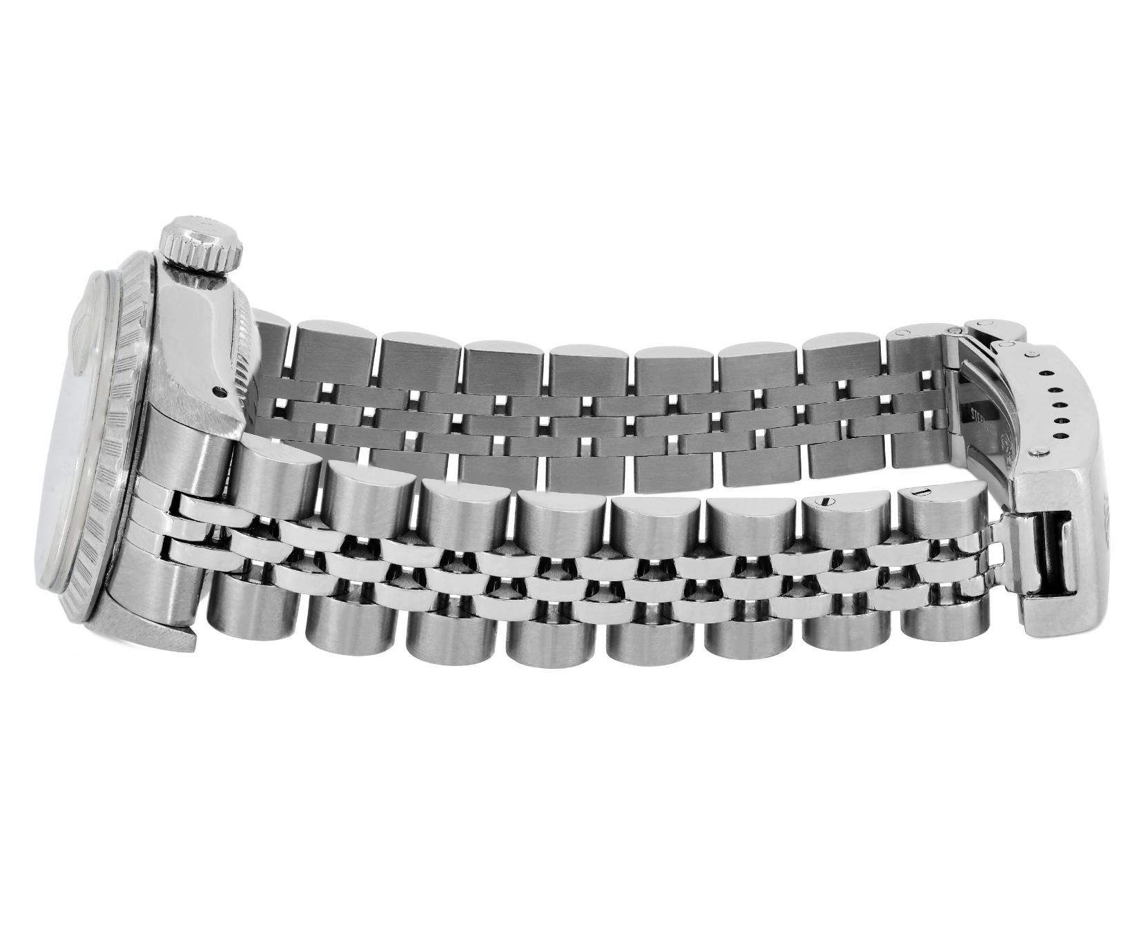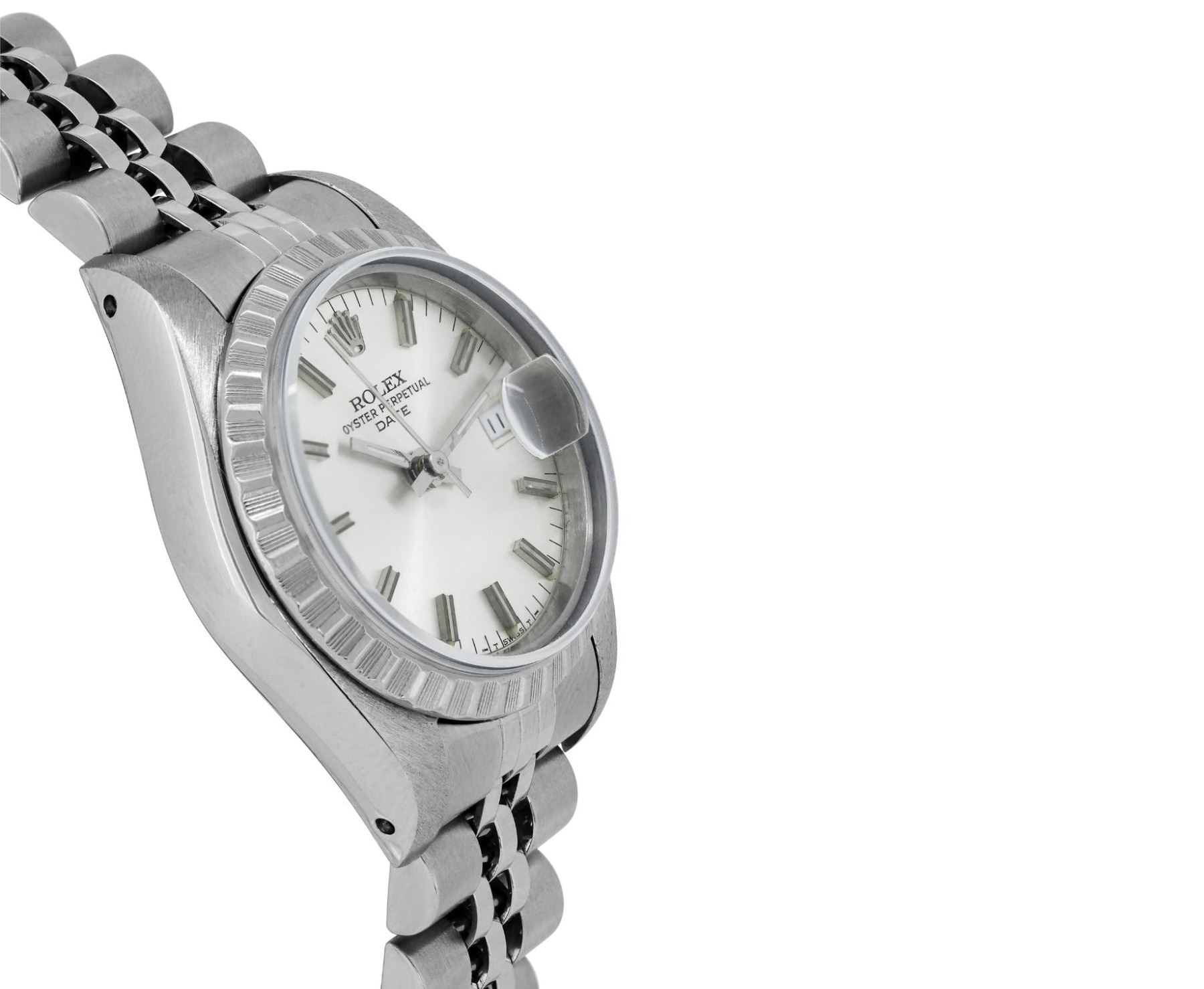 This Lady Rolex Date watch features a silver dial with index hour markers and a custom plastic crystal, with a magnified date window. The timepiece has Rolex stainless steel engine turn bezel. The Rolex 26mm case is crafted from stainless steel and includes a Rolex screw-down crown. The bracelet is a Rolex stainless steel Jubilee band, designed to fit wrists up to 6 inches in circumference. The Watch Is Powered by the Rolex automatic self-winding Caliber 2035 movement. This watch has been polished and serviced and is in excellent condition. It will also be time tested before shipment.