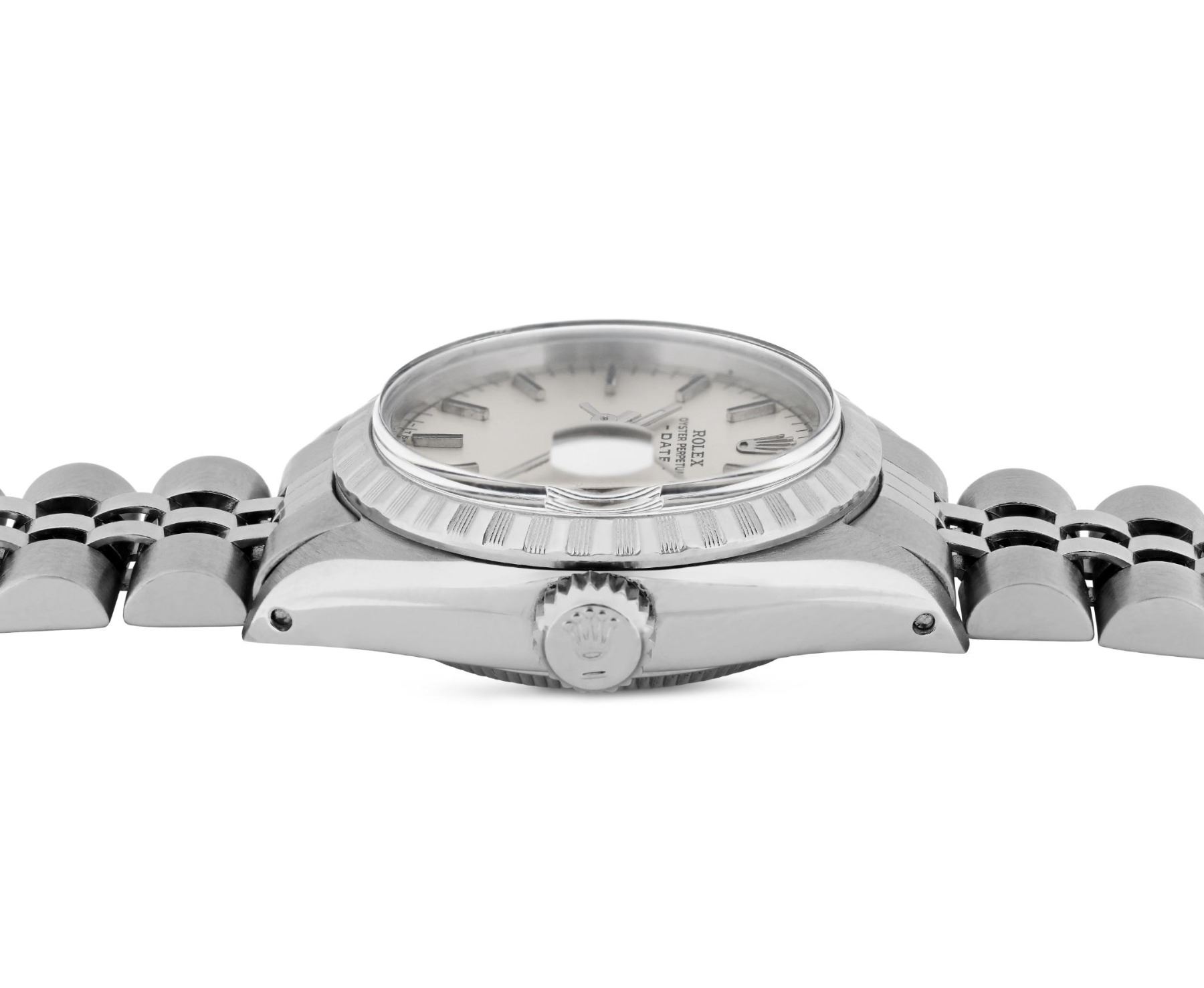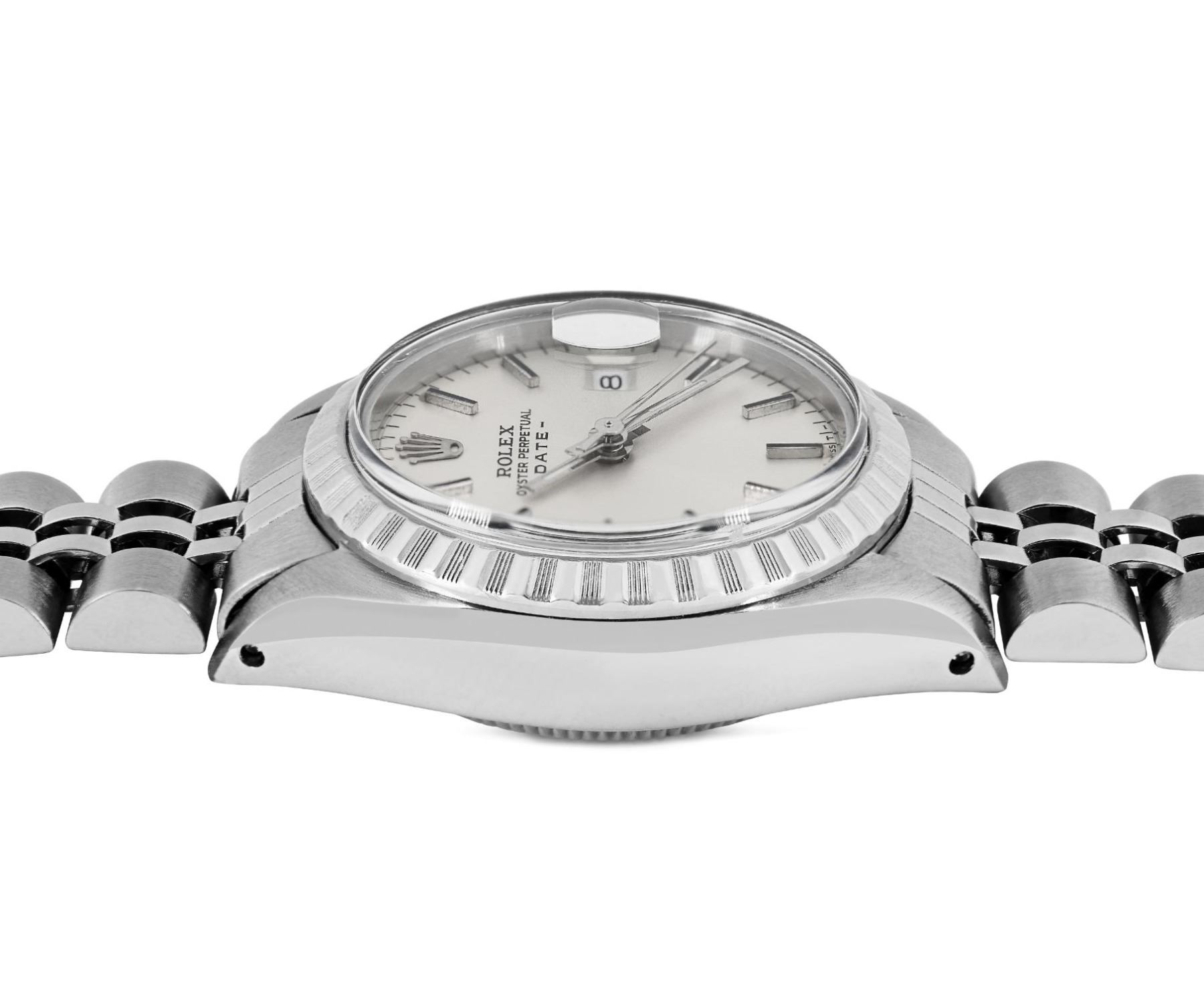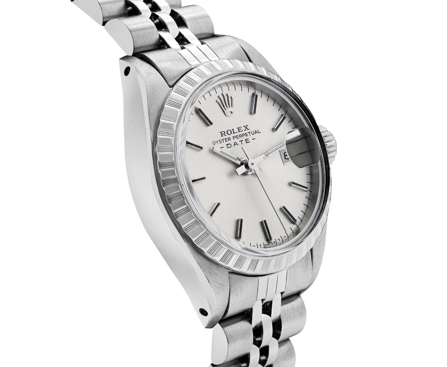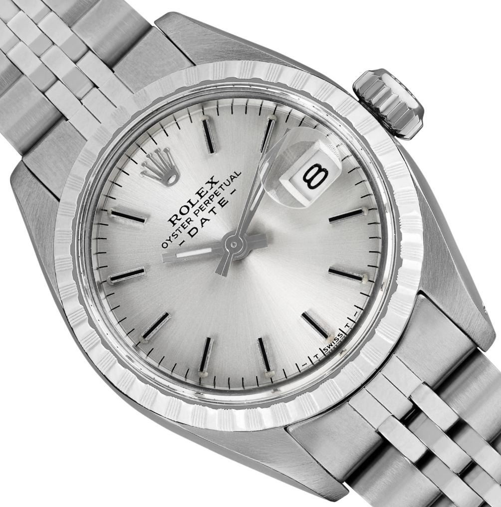 This Lady Rolex Date watch features a silver dial with index hour markers and a custom plastic crystal, with a magnified date window. The timepiece has Rolex stainless steel engine turn bezel. The Rolex 26mm case is crafted from stainless steel and includes a Rolex screw-down crown. The bracelet is a Rolex stainless steel Jubilee band, designed to fit wrists up to 6 inches in circumference. The Watch Is Powered by the Rolex automatic self-winding Caliber 2035 movement. This watch has been polished and serviced and is in excellent condition. It will also be time tested before shipment.