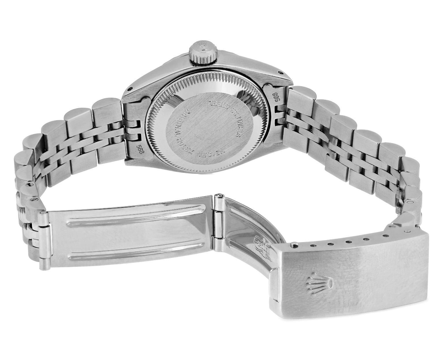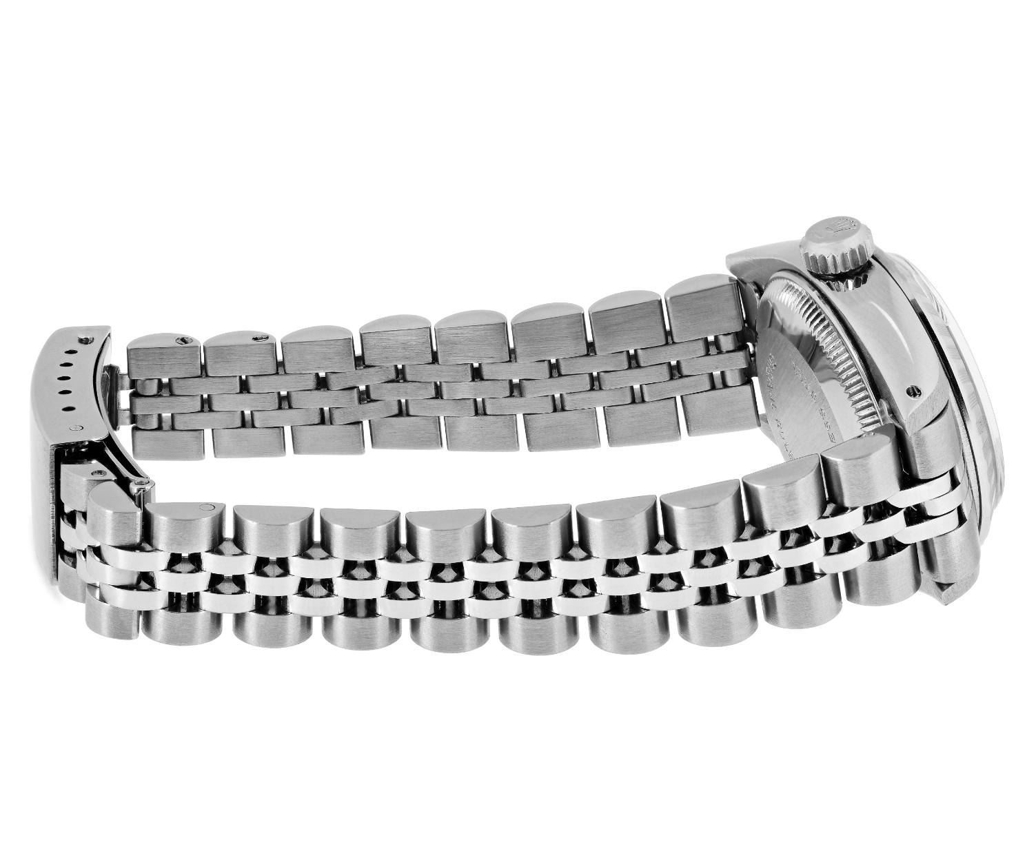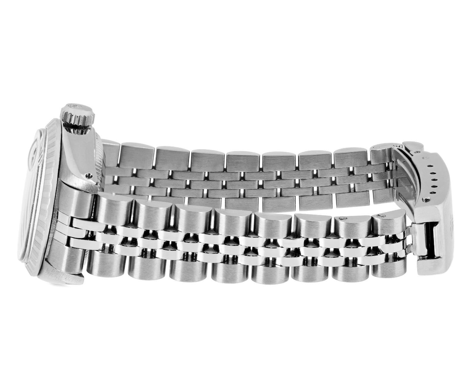 This Lady Rolex Date watch features a silver dial with index hour markers and a custom plastic crystal, with a magnified date window. The timepiece has Rolex stainless steel engine turn bezel. The Rolex 26mm case is crafted from stainless steel and includes a Rolex screw-down crown. The bracelet is a Rolex stainless steel Jubilee band, designed to fit wrists up to 6 inches in circumference. The Watch Is Powered by the Rolex automatic self-winding Caliber 2035 movement. This watch has been polished and serviced and is in excellent condition. It will also be time tested before shipment.