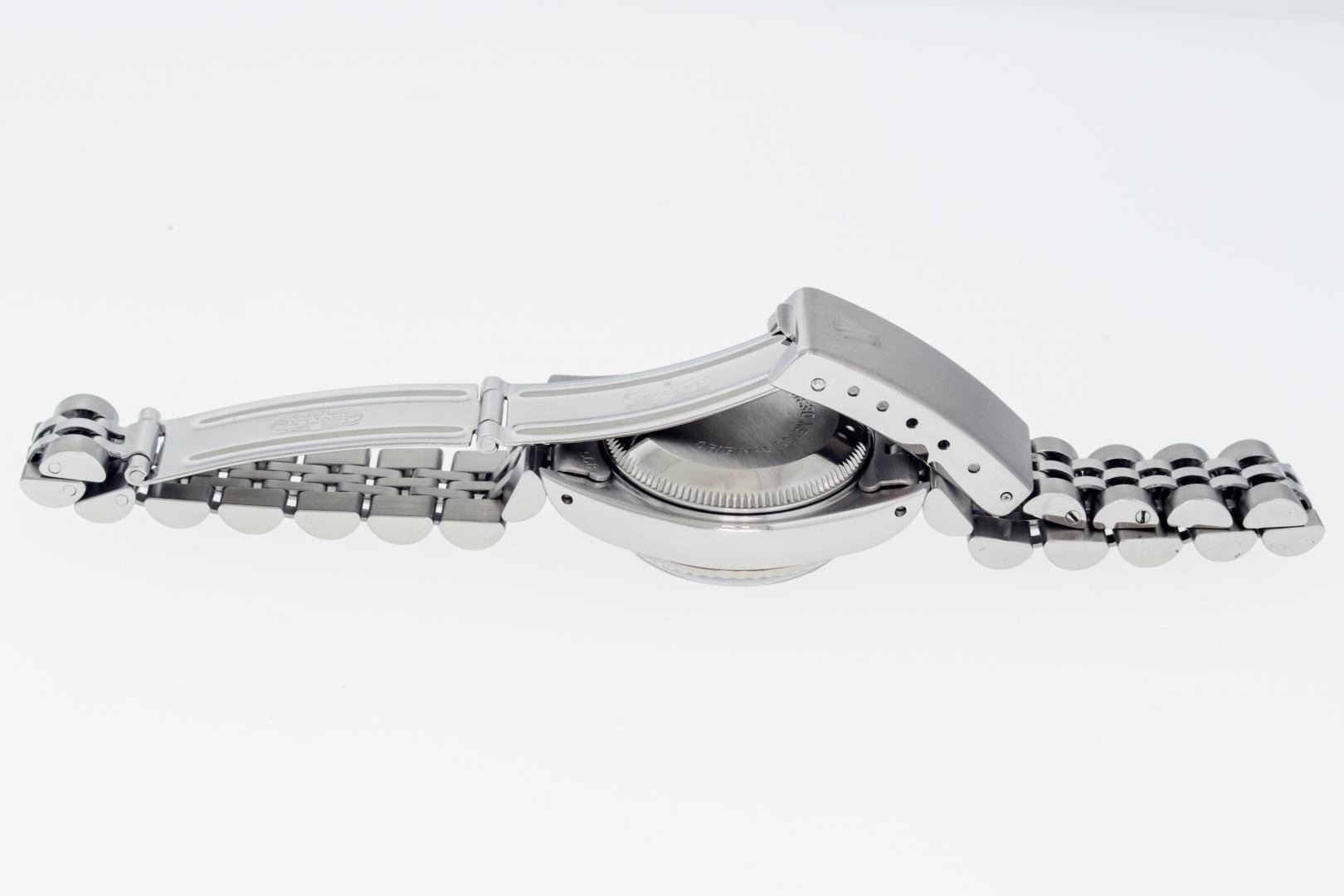 One Ladies Pre Owned Quickset Stainless Steel Rolex Datejust Polished Bright with Satin Finish Serviced & Electronically Tested, Rolex Stainless Steel Case: 26mm, Rolex Stainless Steel Crown, Rolex Bezel: 18K White Gold Fluted Bezel. Custom Crystal: New Sapphire With Magnified Date Window. Custom Hands: New Luminescent Hands. Rolex Movement: Automatic Winding Movement. Rolex Dial: Blue Index Dial With Dash Track. Date Window: 3 O'Clock Position Date Display, Model: Quickset Datejust. Condition: G-6 Extra Fine. Rolex Bracelet: Stainless Steel Jubilee Band With Rolex Crown On Buckle. Bright Polish & Satin Finish. Band Length: 6.0 Inch Length, Adjustable. Standard Clasp, With Rolex Logo. This Watch Has Been Serviced Time Tested And Is In Excellent Condition It Is Free Of All Scratches And Dents.