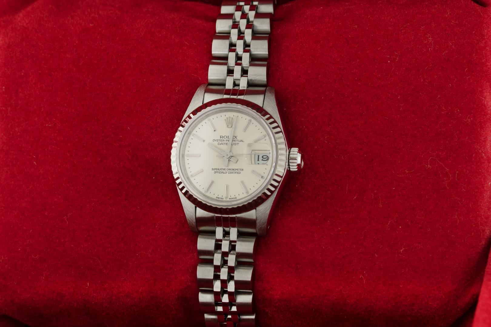 One Ladies Quickset Pre Owned Stainless Steel Rolex Datejust Polished Bright with Satin Finish, Serviced & Electronically Tested, Rolex Stainless Steel Case: 26mm, Rolex Stainless Steel Crown, Rolex Bezel: 18K White Gold Fluted Bezel, Custom Crystal: New With Magnifying Date Window. Rolex Hands: Luminescent Hands. Rolex Movement: Automatic Winding Movement. Rolex Dial: Silver Dial With Index Hour Markers And Lumi Dots. Date Window: 3 O'Clock Position Date Display, Model: Datejust. Condition: G-6 Extra Fine. Rolex Bracelet: Stainless Steel Jubilee Band. Bright Polish & Satin Finish. 6.0 Inch Length, Adjustable. Standard Clasp, With Rolex Logo. This Watch Has Been Serviced Time Tested And Is In Excellent Condition It Is Free Of All Scratches And Dents. This Watch Comes With A Rolex Box And Booklets.