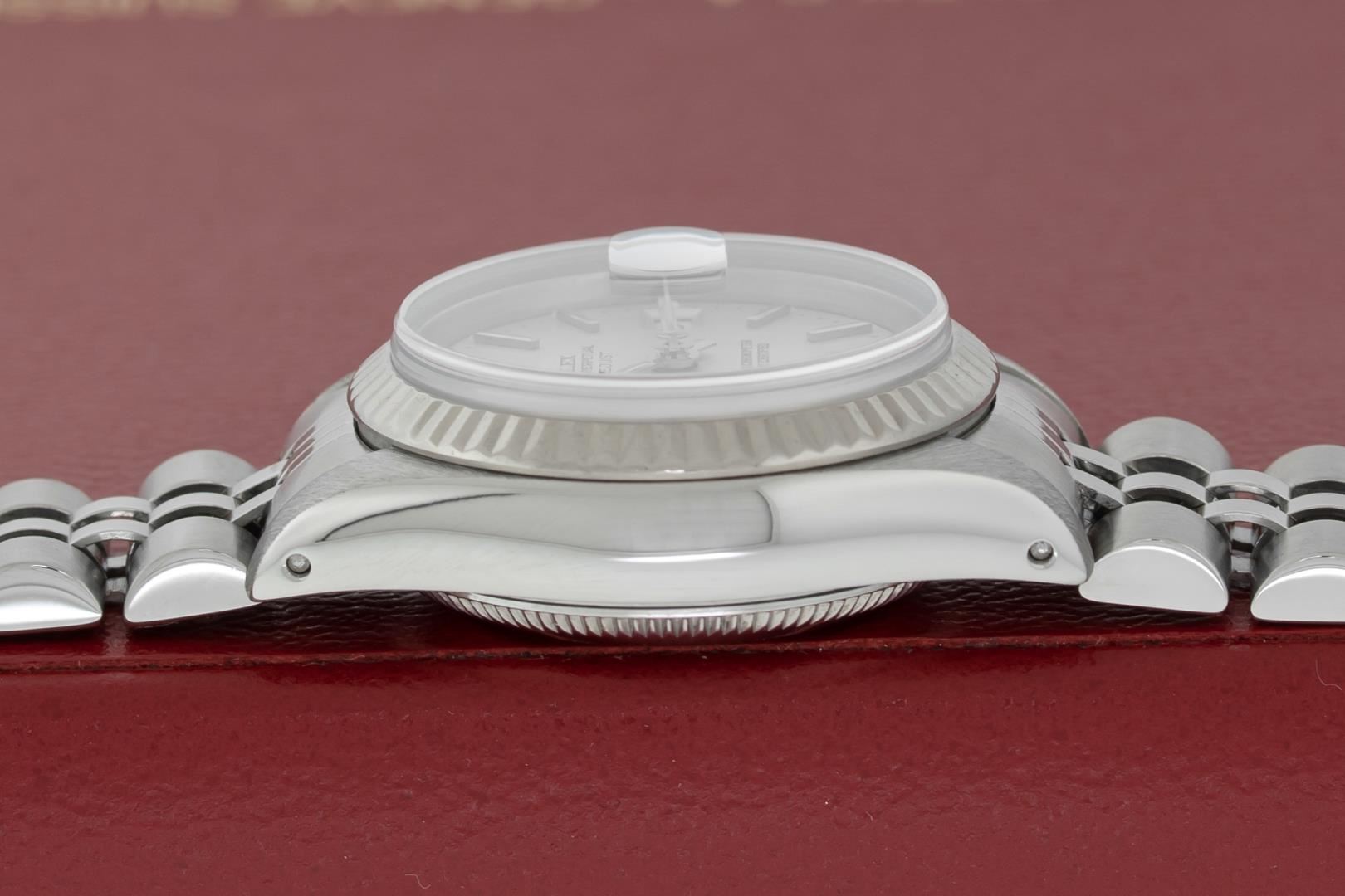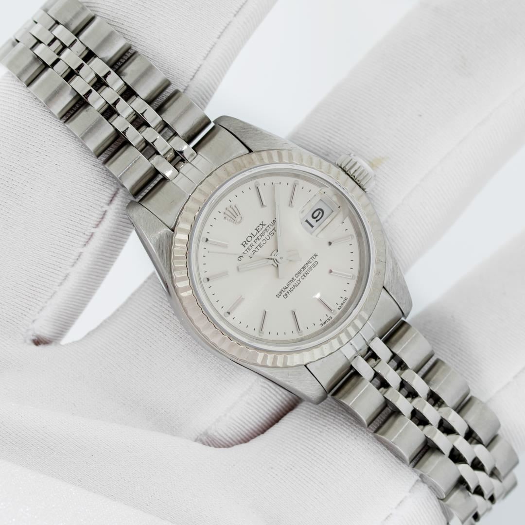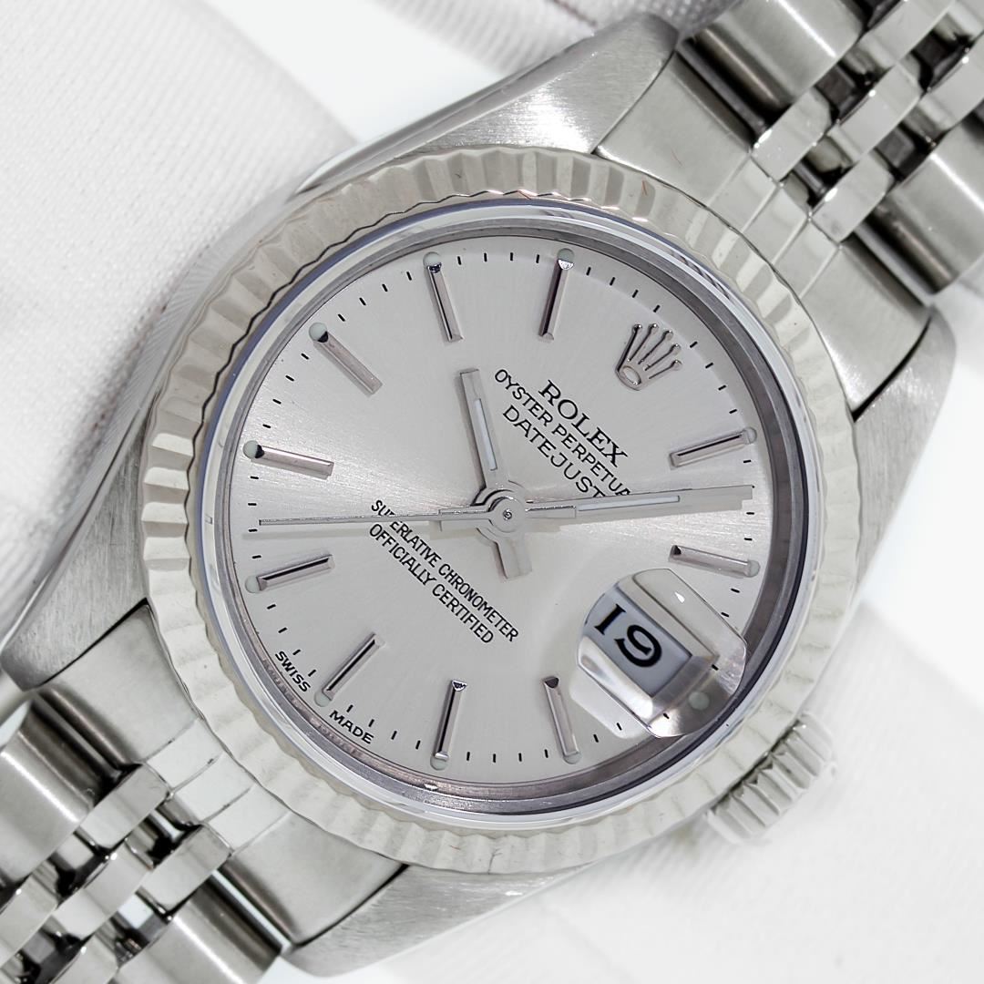 One Ladies Quickset Pre Owned Stainless Steel Rolex Datejust Polished Bright with Satin Finish, Serviced & Electronically Tested, Rolex Stainless Steel Case: 26mm, Rolex Stainless Steel Crown, Rolex Bezel: 18K White Gold Fluted Bezel, Custom Crystal: New With Magnifying Date Window. Rolex Hands: Luminescent Hands. Rolex Movement: Automatic Winding Movement. Rolex Dial: Silver Dial With Index Hour Markers And Lumi Dots. Date Window: 3 O'Clock Position Date Display, Model: Datejust. Condition: G-6 Extra Fine. Rolex Bracelet: Stainless Steel Jubilee Band. Bright Polish & Satin Finish. 6.0 Inch Length, Adjustable. Standard Clasp, With Rolex Logo. This Watch Has Been Serviced Time Tested And Is In Excellent Condition It Is Free Of All Scratches And Dents. This Watch Comes With A Rolex Box And Booklets.